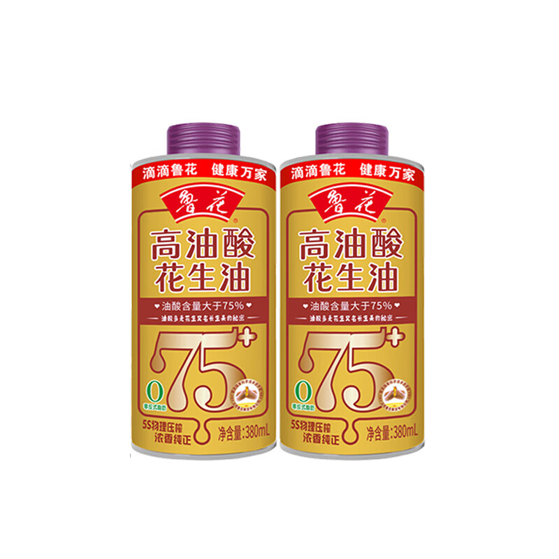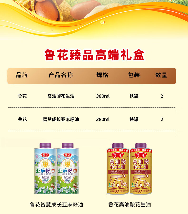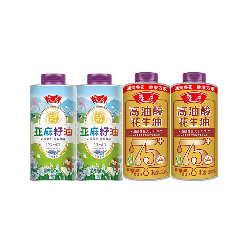 配置:鲁花 高油酸花生油 380ml 铁罐*2 鲁花 智慧成长亚麻籽油 380ml 铁罐*2