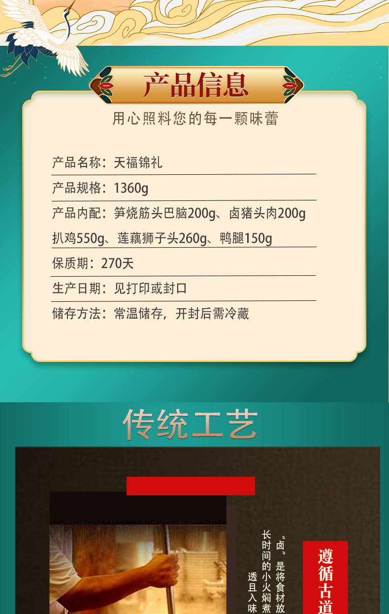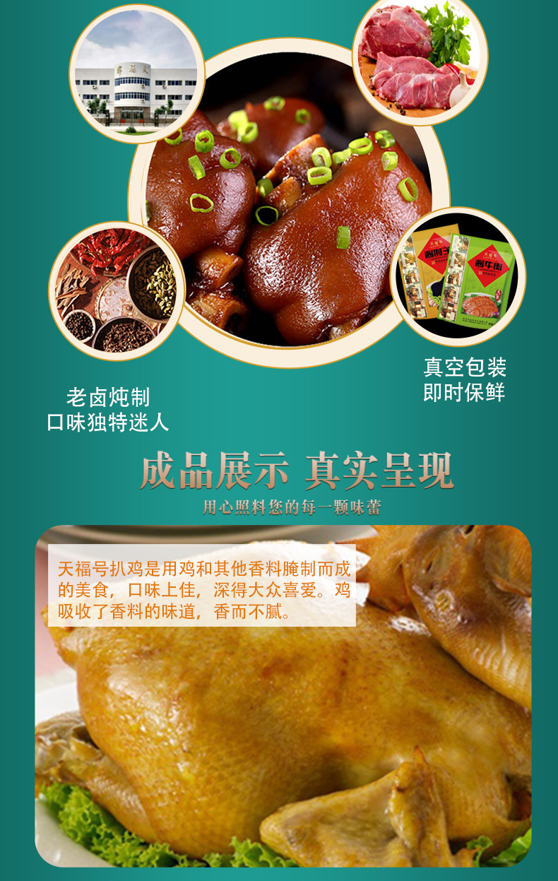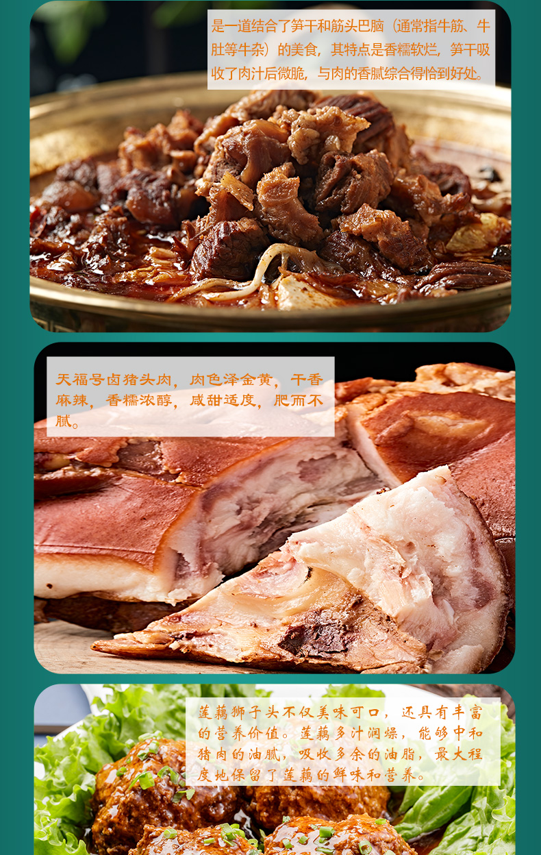 配置清单:笋烧筋头巴脑 200g 自立袋卤猪头肉 200g 扒鸡 550g 莲藕狮子头 260g 鸭腿 150g