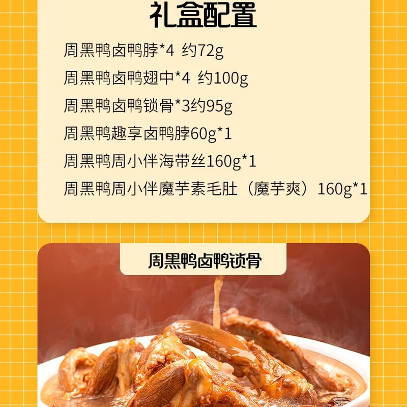 配置:周黑鸭卤鸭脖*4 约72g 周黑鸭卤鸭翅中*4 约100g 周黑鸭卤鸭锁骨*3约95g 周黑鸭趣享卤鸭脖60g*1 周黑鸭周小伴海带丝160g*1 周黑鸭周小伴魔芋素毛肚(魔芋爽)160g*1