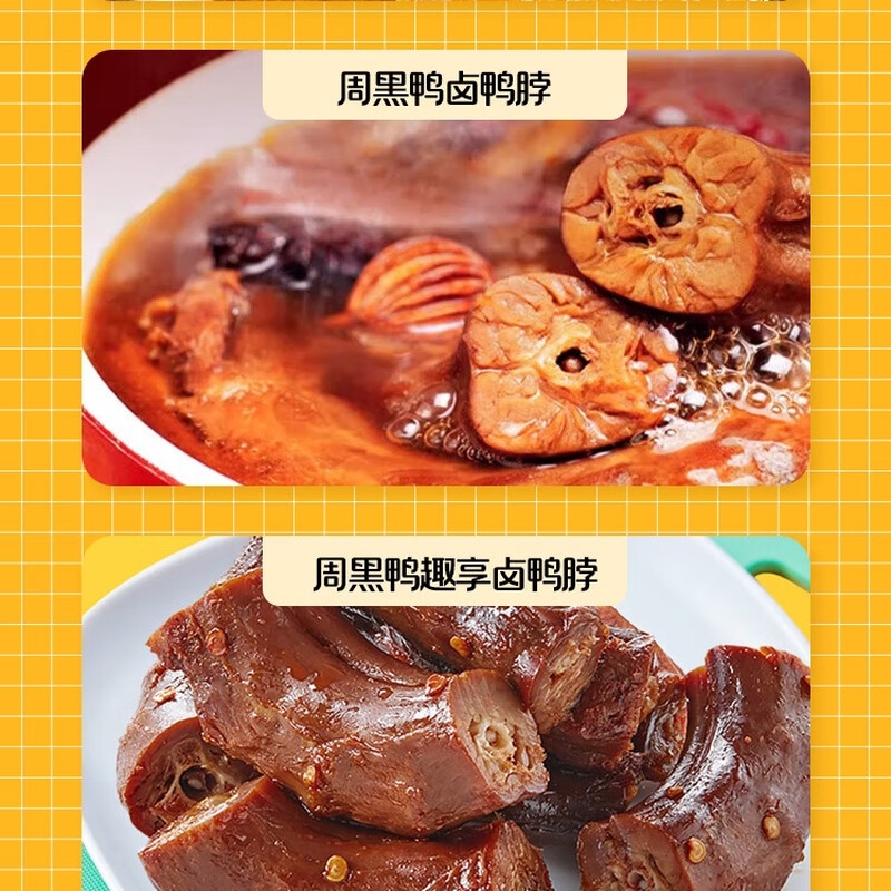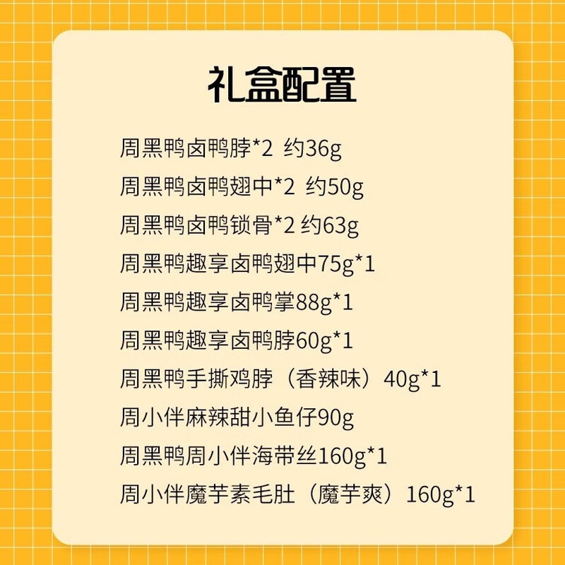 - 配置:周黑鸭卤鸭脖*2 约36g 周黑鸭卤鸭翅中*2 约50g 周黑鸭卤鸭锁骨*2 约63g 周黑鸭趣享卤鸭翅中75g*1 周黑鸭趣享卤鸭掌88g*1 周黑鸭趣享卤鸭脖60g*1 周黑鸭手撕鸡脖(香辣味)40g*1 周小伴麻辣甜小鱼仔90g 周黑鸭周小伴海带丝160g*1 周小伴魔芋素毛肚(魔芋爽)160g*1