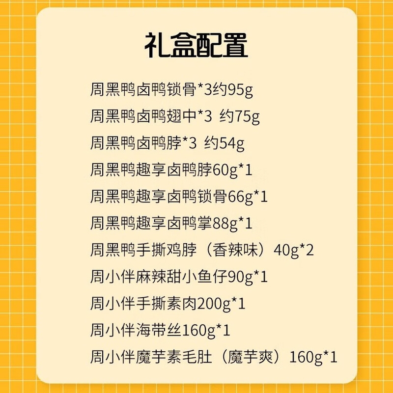 - 配置:周黑鸭卤鸭锁骨*3约95g 周黑鸭卤鸭翅中*3 约75g 周黑鸭卤鸭脖*3 约54g 周黑鸭趣享卤鸭脖60g*1 周黑鸭趣享卤鸭锁骨66g*1(年货季包装升级克重62g) 周黑鸭趣享卤鸭掌88g*1 周黑鸭手撕鸡脖(香辣味)40g*2 周小伴麻辣甜小鱼仔90g*1 周小伴手撕素肉200g*1 周小伴海带丝160g*1 周小伴魔芋素毛肚(魔芋爽)160g*1