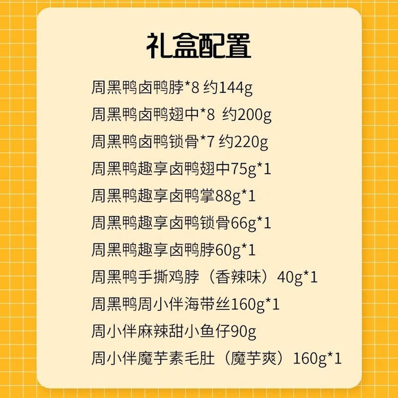 - 配置:周黑鸭卤鸭脖*8 约144g 周黑鸭卤鸭翅中*8 约200g 周黑鸭卤鸭锁骨*7 约220g 周黑鸭趣享卤鸭翅中75g*1 周黑鸭趣享卤鸭掌88g*1 周黑鸭趣享卤鸭锁骨66g*1(年货季包装升级克重62g) 周黑鸭趣享卤鸭脖60g*1 周黑鸭手撕鸡脖(香辣味)40g*1 周黑鸭周小伴海带丝160g*1 周小伴麻辣甜小鱼仔90g 周小伴魔芋素毛肚(魔芋爽)160g*1