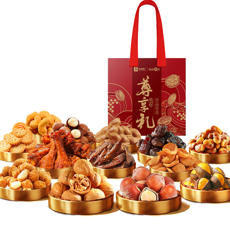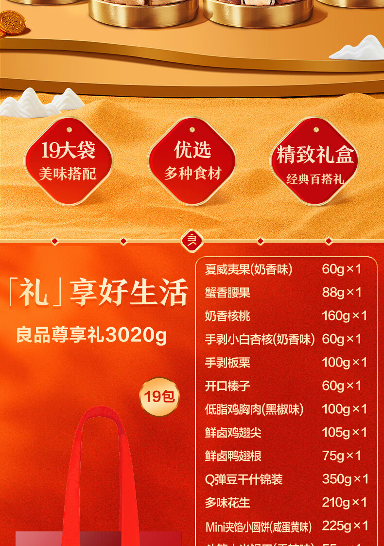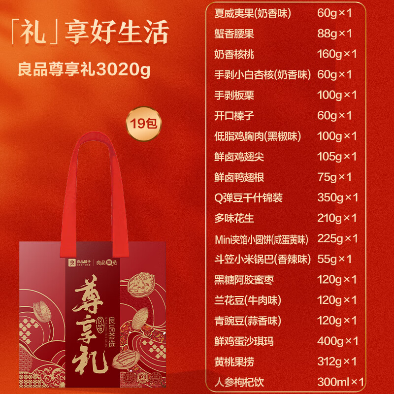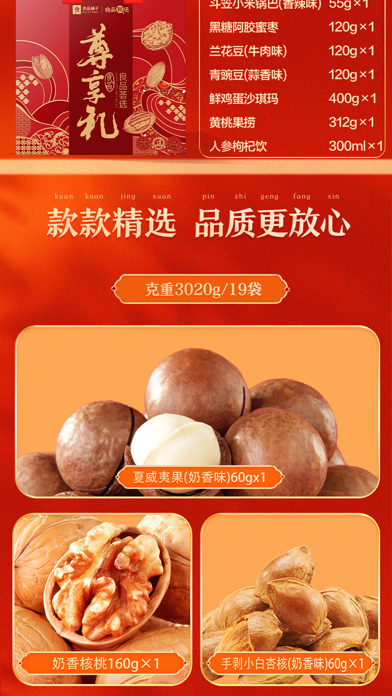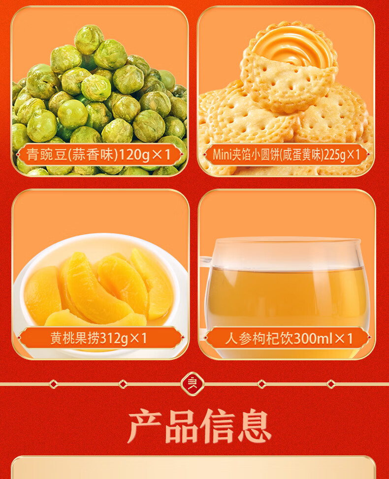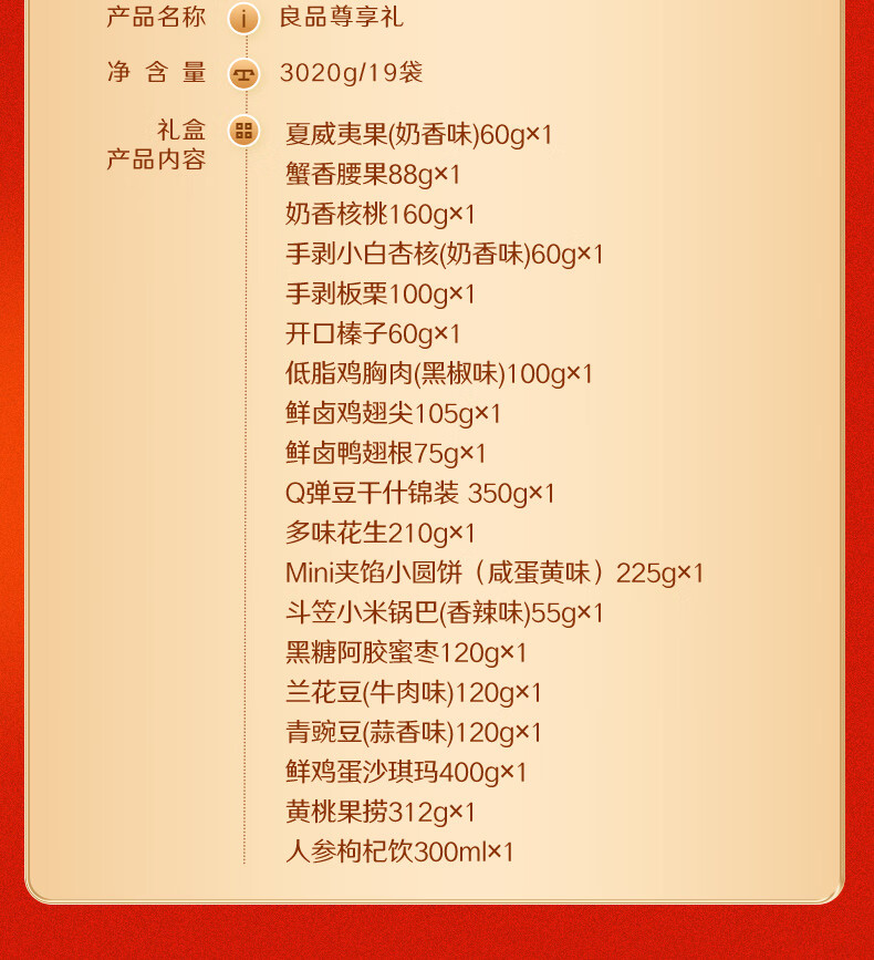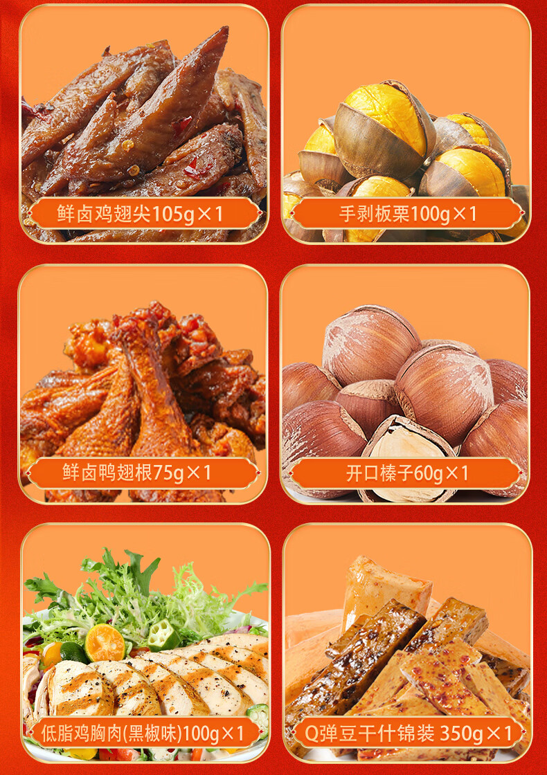 配置:夏威夷果(奶香味)60g*1 蟹香腰果88g*1 奶香核桃160g*1 手剥小白杏核(奶香味)60g*1 手剥板栗100g*1 开口榛子60g*1 低脂鸡胸肉(黑椒味)100g*1 鲜卤鸡翅尖105g*1 鲜卤鸭翅根75g*1 Q弹豆干什锦装 350g*1 多味花生210g*1 Mini夹馅小圆饼(咸蛋黄味)225g*1 斗笠小米锅巴(香辣味)55g*1 黑糖阿胶蜜枣120g*1 兰花豆(牛肉味)120g*1 青豌豆(蒜香味)120g*1 鲜鸡蛋沙琪玛400g*1 黄桃果捞312g*1 人参枸杞饮300ml*1