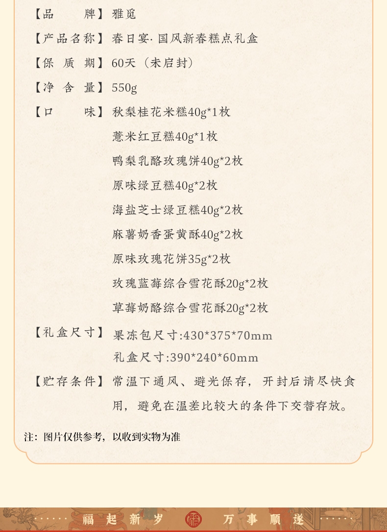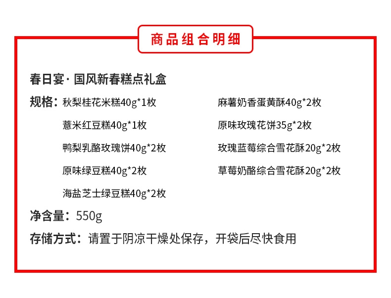 配置清单:秋梨桂花米糕40g*1 薏米红豆糕40g*1 鸭梨乳酪玫瑰饼40g*2 原味绿豆糕40g*2 海盐芝士绿豆糕40g*2 麻薯奶香蛋黄酥40g*2 原味玫瑰花饼35g*2 玫瑰蓝莓综合雪花酥20g*2 草莓奶酪综合雪花酥20g*2