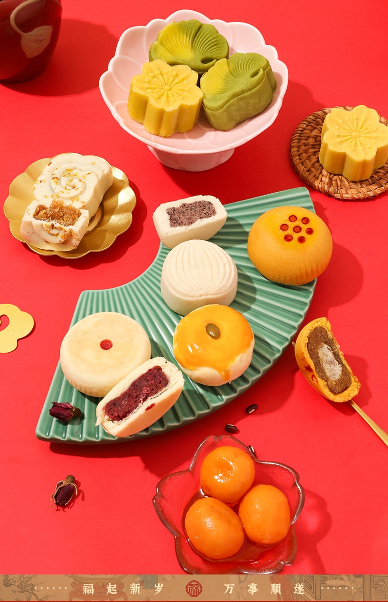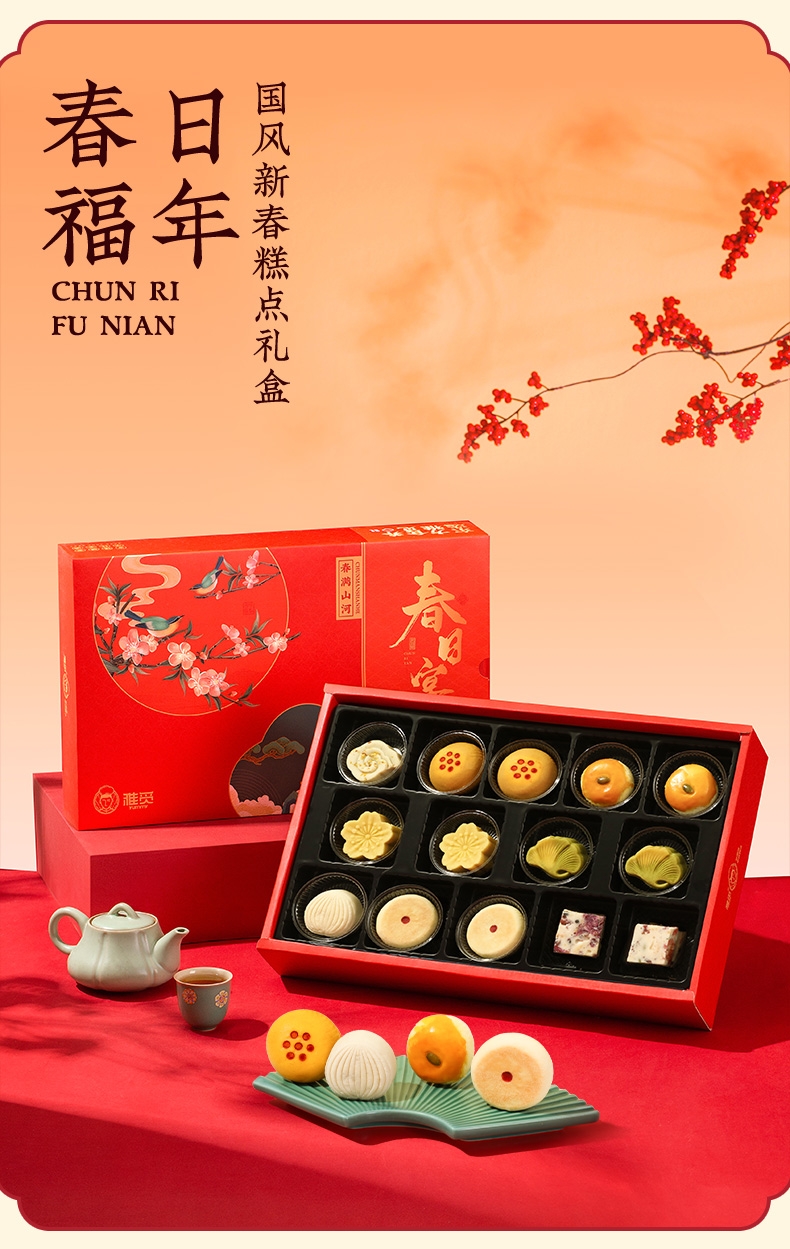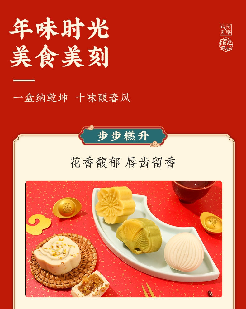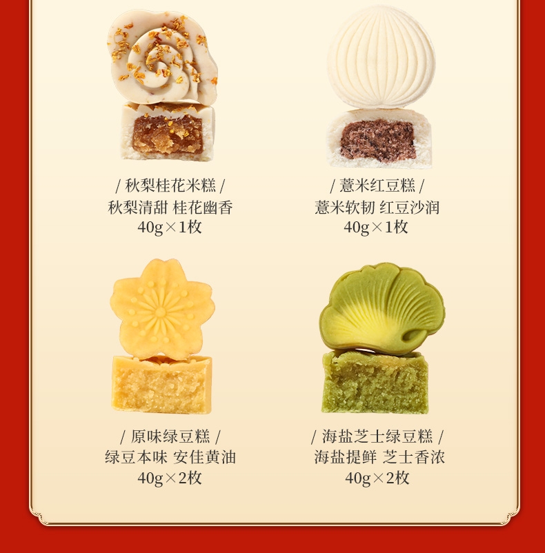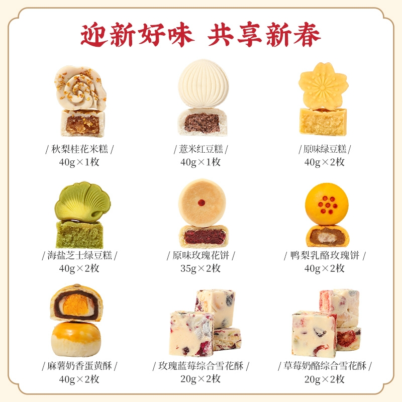从清润的秋梨米糕到拉丝的麻薯蛋黄酥,一盒集齐花果清;不仅保留了原味绿豆糕、原味玫瑰花饼这样的经典味道,;礼盒内含米糕、绿豆糕、酥饼、雪花酥等多种形态