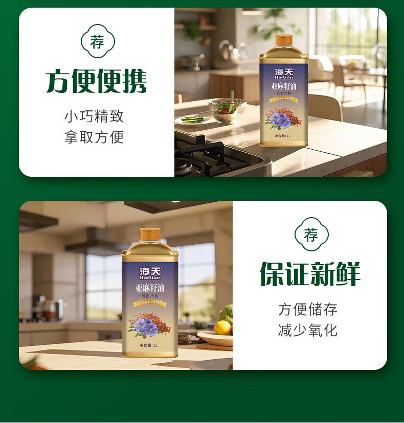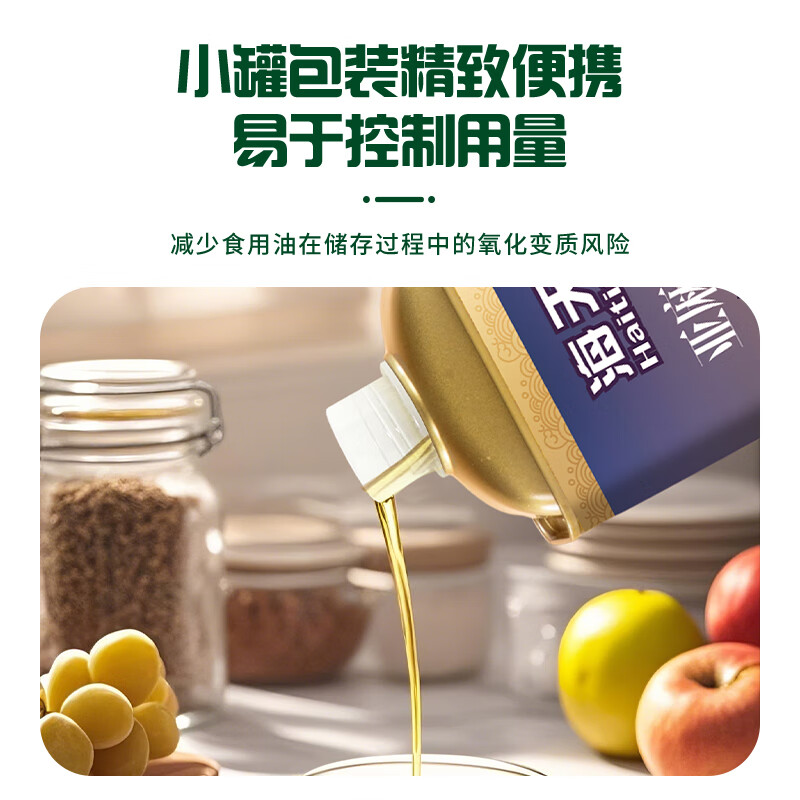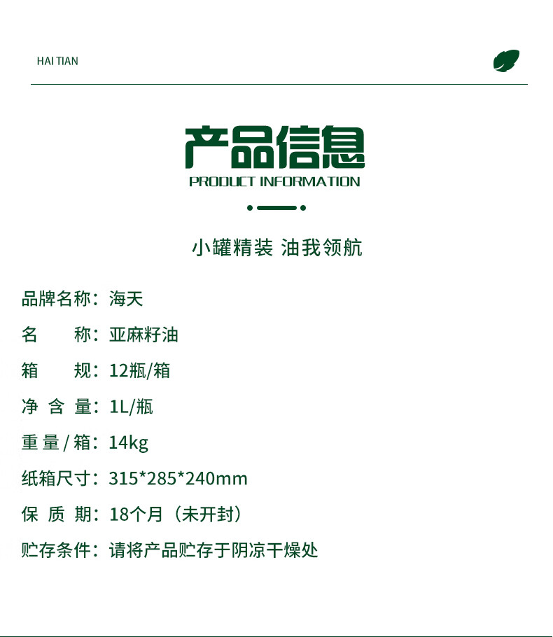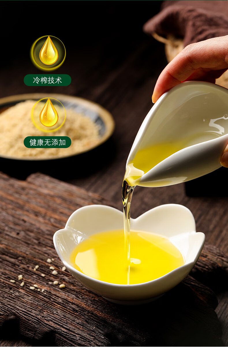 物理低温冷榨 冷烹两用;油体清澈 味道清香;头道初榨 0胆固醇 亚麻酸大于52%