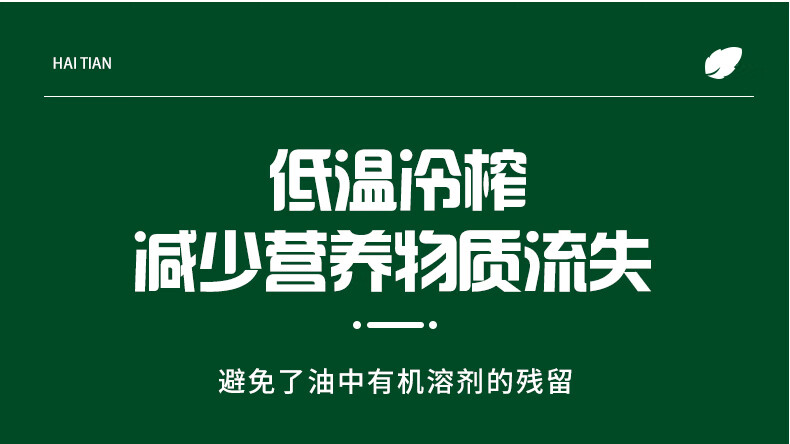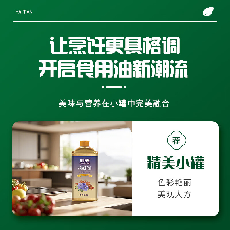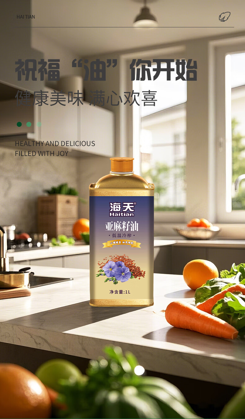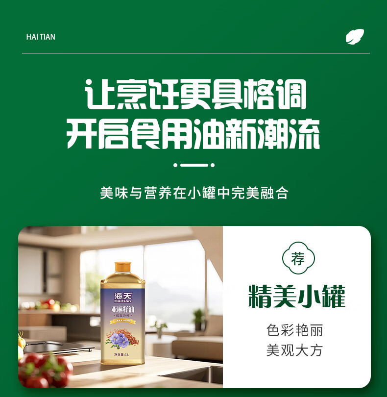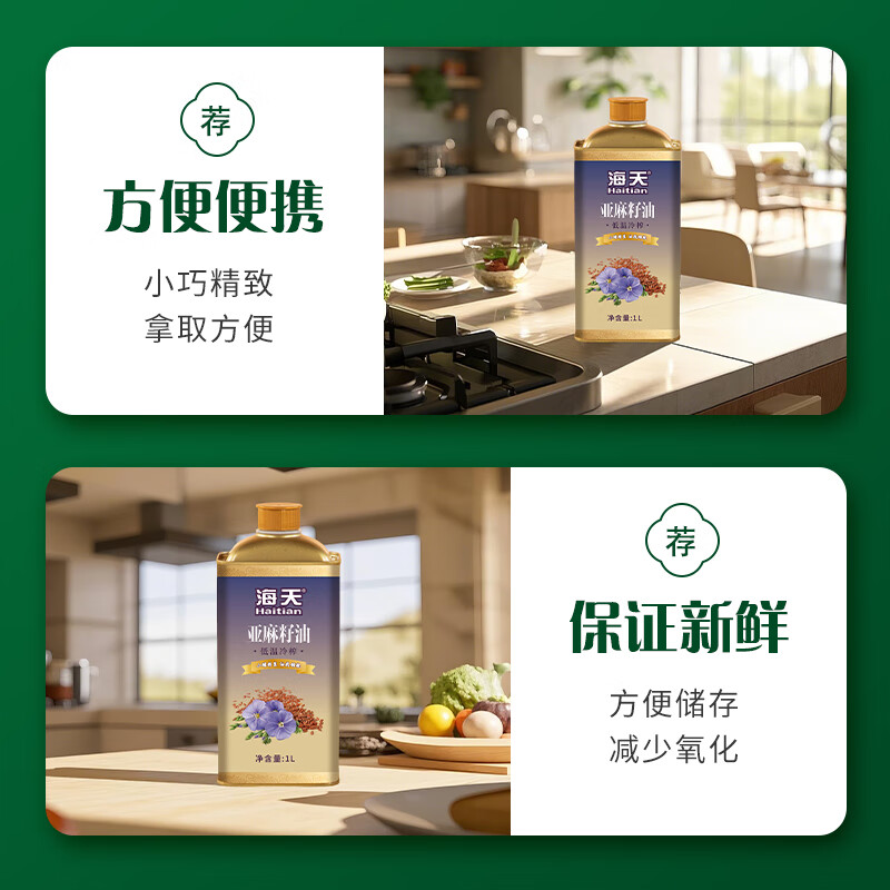 物理低温冷榨 冷烹两用;油体清澈 味道清香;头道初榨 0胆固醇 亚麻酸大于52%