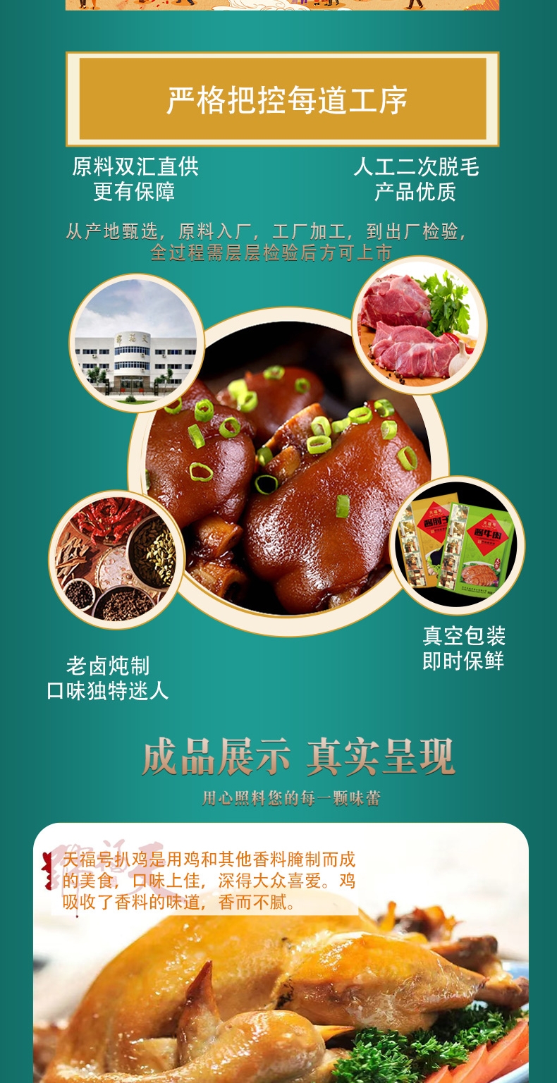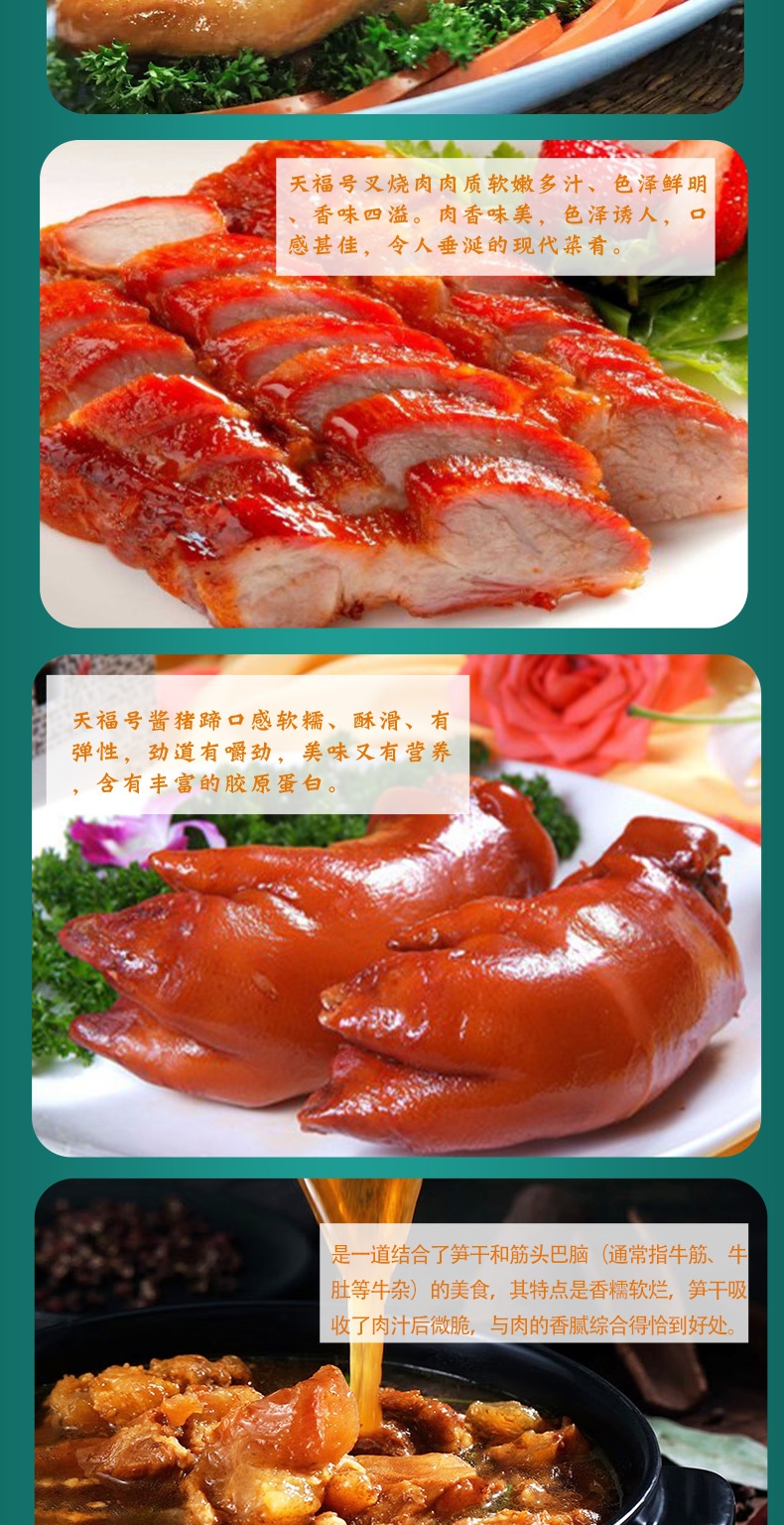 配置清单:彩袋扒鸡 550g 自立袋叉烧肉 200g 自立袋红烧带鱼 200g 自立袋酱猪蹄 200g 笋烧筋头巴脑 200g 自立袋酱鸭腿 150g 自立袋卤香头肉 200g 自立袋松仁小肚 250g 莲藕狮子头 260g 自立袋豉香鸭脯 200g
