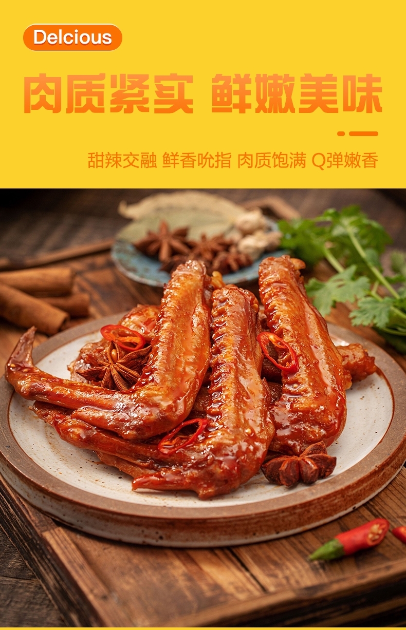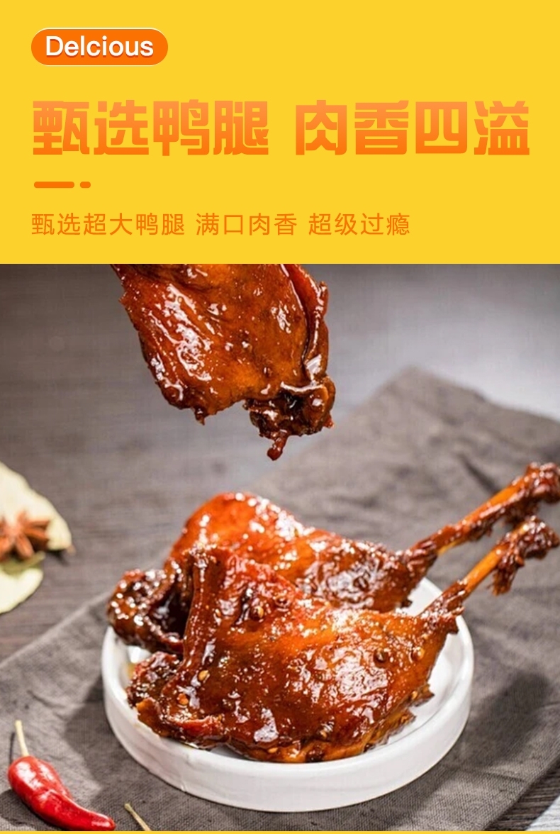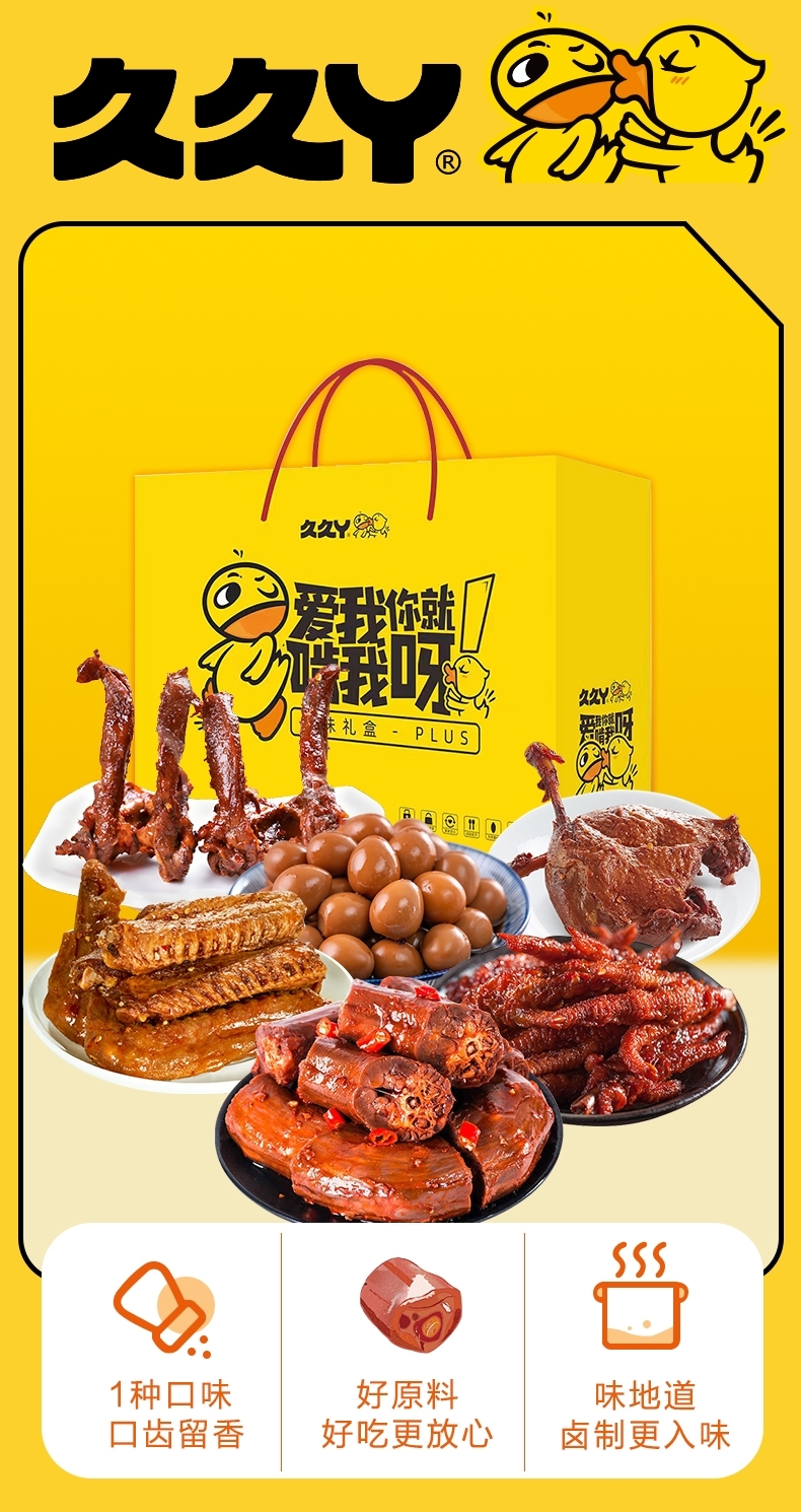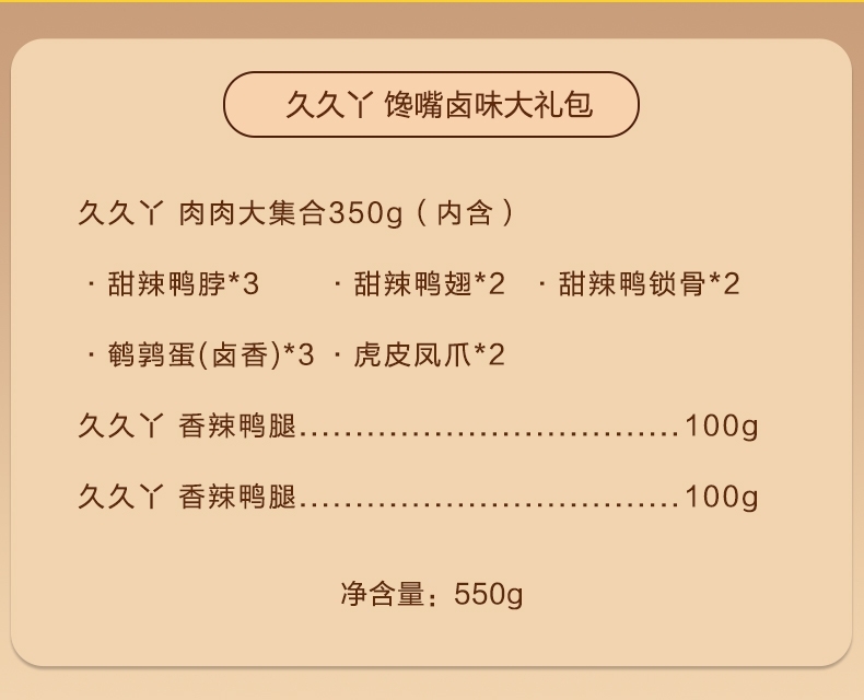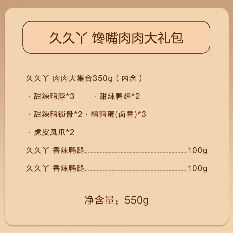 配置:久久丫 肉肉大集合350g(内含) ·甜辣鸭脖*3 ·甜辣鸭翅*2 ·甜辣鸭锁骨*2 ·鹌鹑蛋(卤香)*3 ·虎皮凤爪*2 久久丫 香辣鸭腿100g 久久丫 香辣鸭腿100g
