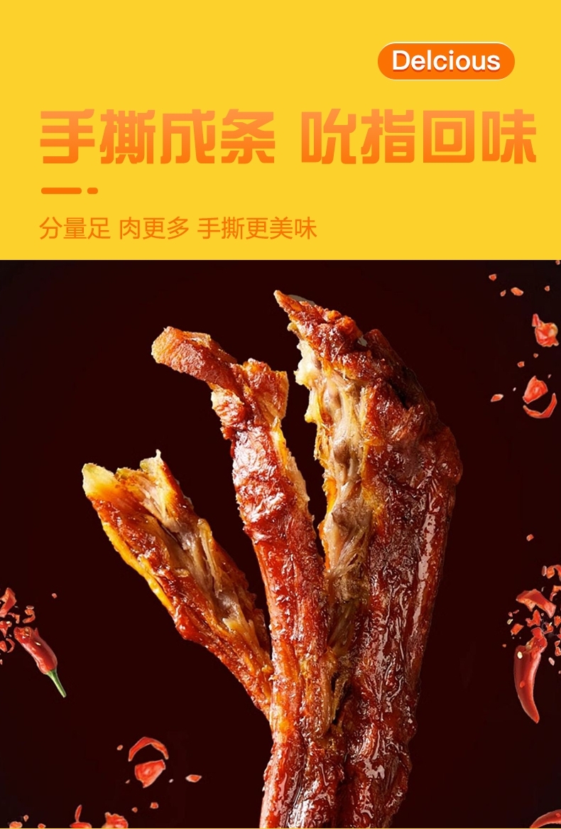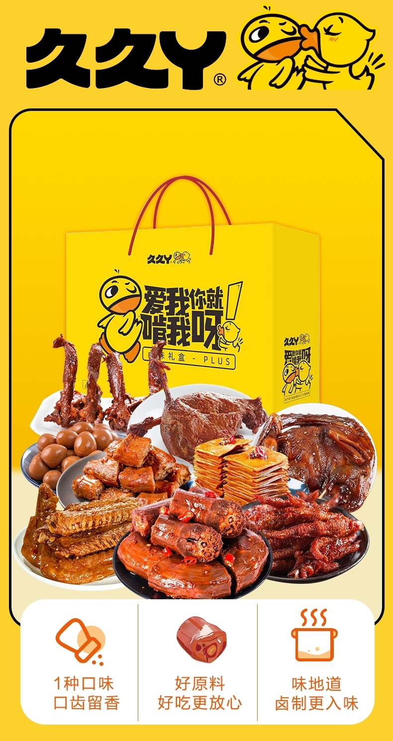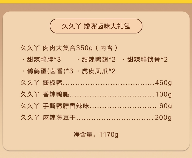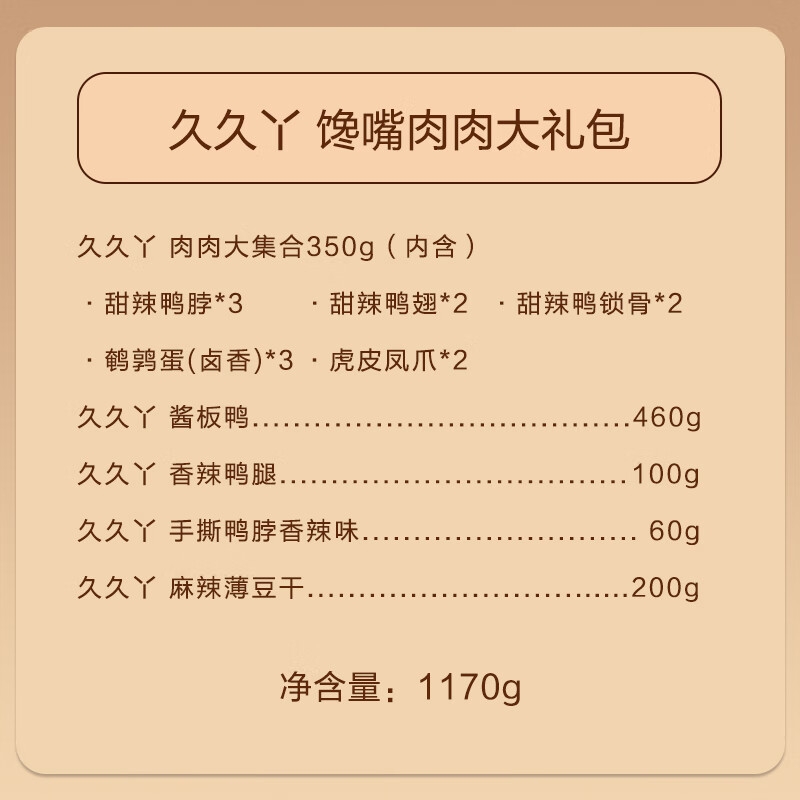 配置:久久丫 肉肉大集合350g(内含) ·甜辣鸭脖*3 ·甜辣鸭翅*2 ·甜辣鸭锁骨*2 ·鹌鹑蛋(卤香)*3 ·虎皮凤爪*2 久久丫 酱板鸭460g 久久丫 香辣鸭腿100g 久久丫 手撕鸭脖香辣味60g 久久丫 麻辣薄豆干200g