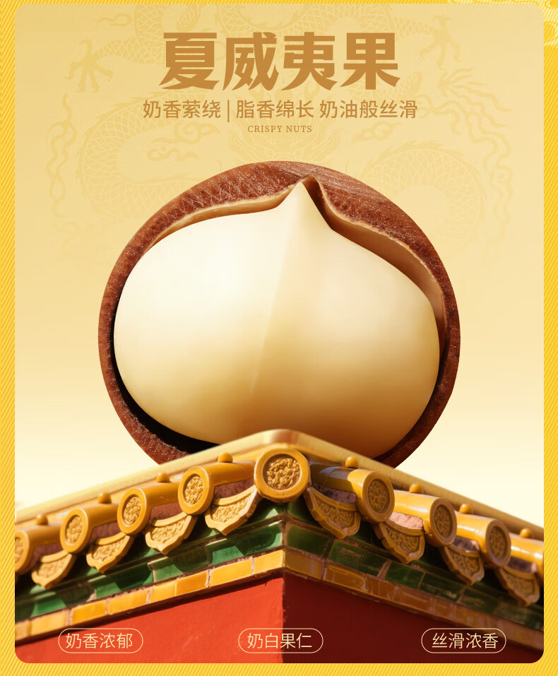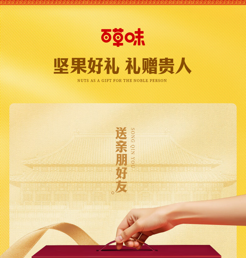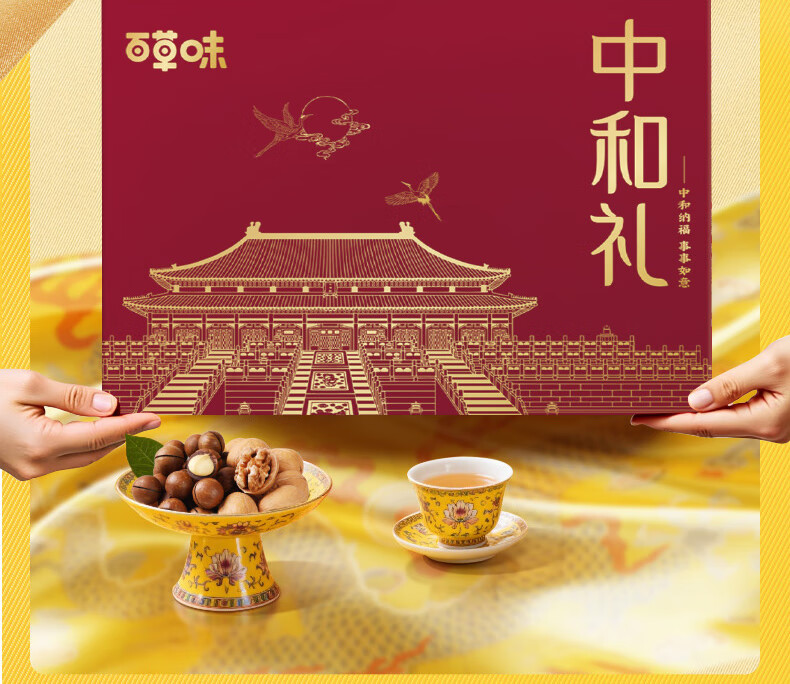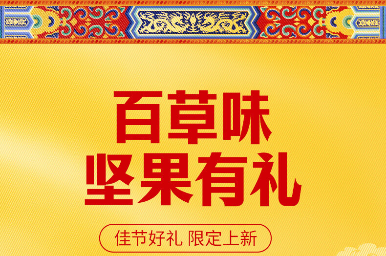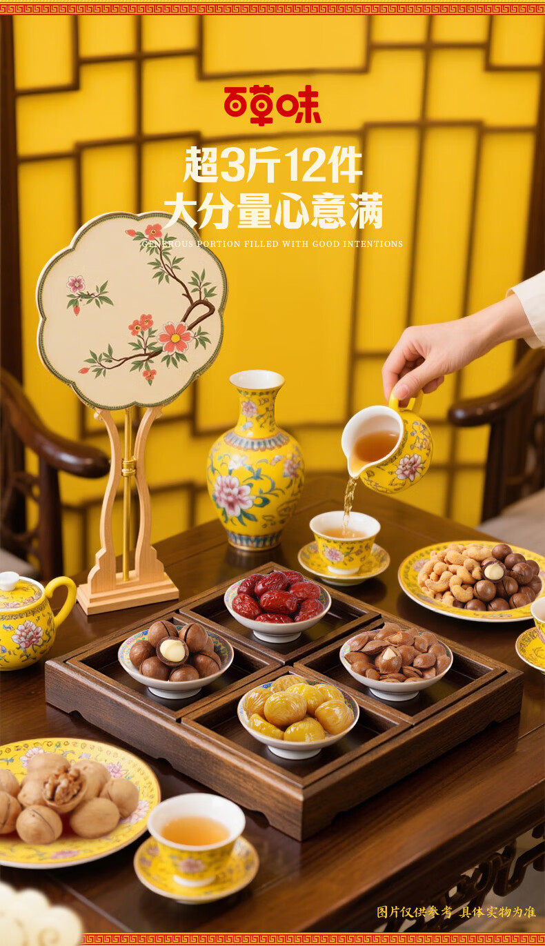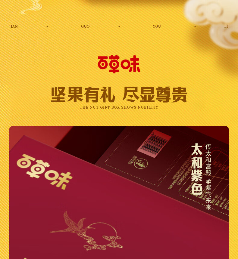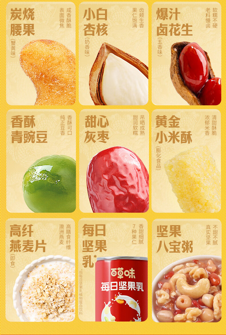 配置:【百草味】夏威夷果(奶油味) 60g 【百草味】纸皮核桃 68g 【百草味】熟制板栗仁 60g 【百草味】炭烧腰果(蟹黄味)60g 【百草味】小白杏核(奶香味)60g 【百草味】爆汁卤花生(五香味)228g 【百草味】香酥小豌豆(蒜香味) 70g 【百草味】甜心灰枣 70g 【百草味】黄金小米酥(膨化食品)70g 【百草味】燕麦片(原味)100g 【百草味】每日坚果乳 310g 【百草味】坚果八宝粥360g