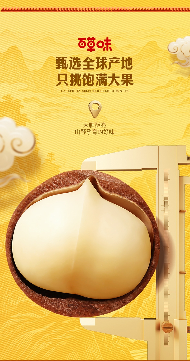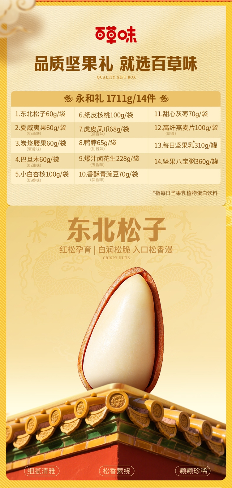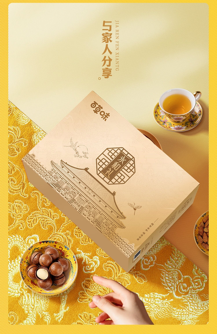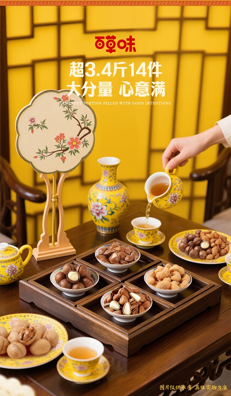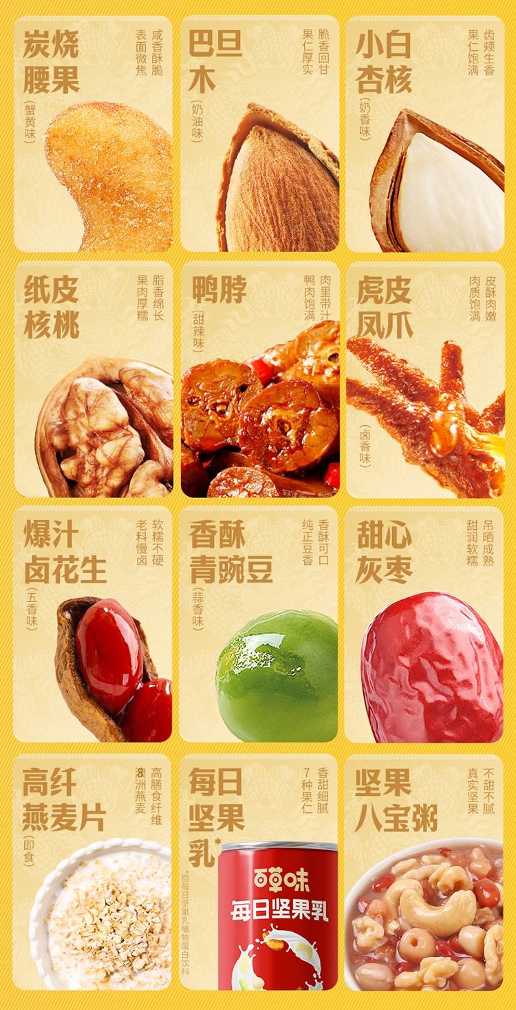 配置:【百草味】东北松子 60g 【百草味】夏威夷果(奶油味) 60g 【百草味】炭烧腰果(蟹黄味)60g 【百草味】巴旦木(奶油味)60g 【百草味】小白杏核(奶香味)100g 【百草味】纸皮核桃 100g 【百草味】虎皮凤爪(卤香味)68g 【百草味】鸭脖(甜辣味)65g 【百草味】爆汁卤花生(五香味)228g 【百草味】香酥青豌豆(蒜香味) 70g 【百草味】甜心灰枣 70g 【百草味】燕麦片(原味)100g 【百草味】每日坚果乳 310g 【百草味】坚果八宝粥360g