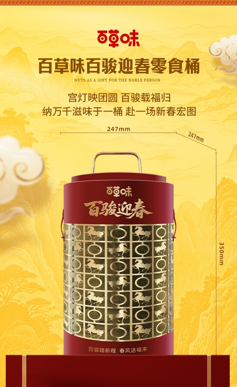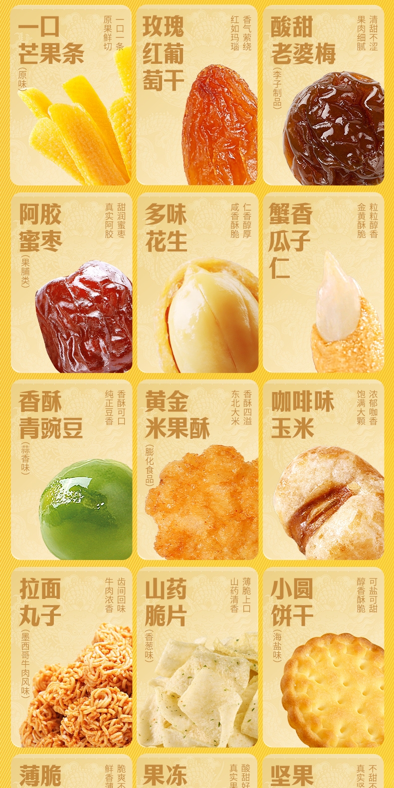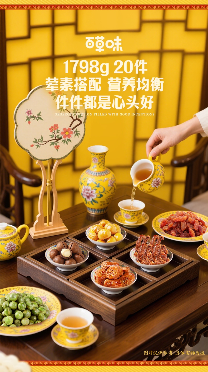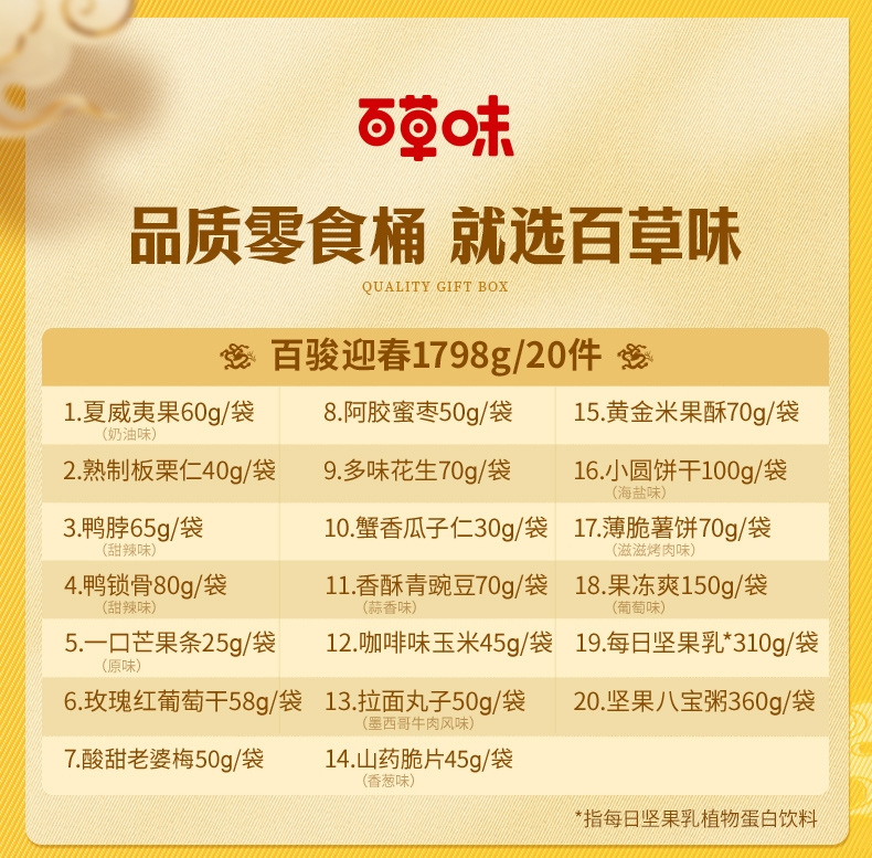 配置:【百草味】夏威夷果(奶油味) 60g 【百草味】熟制板栗仁40g袋装 【百草味】鸭脖(甜辣味)65g 【百草味】鸭锁骨(甜辣味)80g 【百草味】一口芒果条(原味)25g 【百草味】玫瑰红葡萄干 58g 【百草味】酸甜老婆梅50g 【百草味】阿胶蜜枣50g 【百草味】多味花生 70g 【百草味】蟹香瓜子仁30g 【百草味】香酥青豌豆(蒜香味) 70g 【百草味】咖啡味玉米45g 【百草味】拉面丸子 50g(墨西哥牛肉风味) 【百草味】山药脆片(香葱味) 45g 【百草味】黄金米果酥 70g 【百草味】小圆饼干 100g(海盐味) 【百草味】薄脆薯饼(滋滋烤肉味)70g 【百草味】果冻爽(葡萄味)150g 【百草味】每日坚果乳 310g 【百草味】坚果八宝粥360g