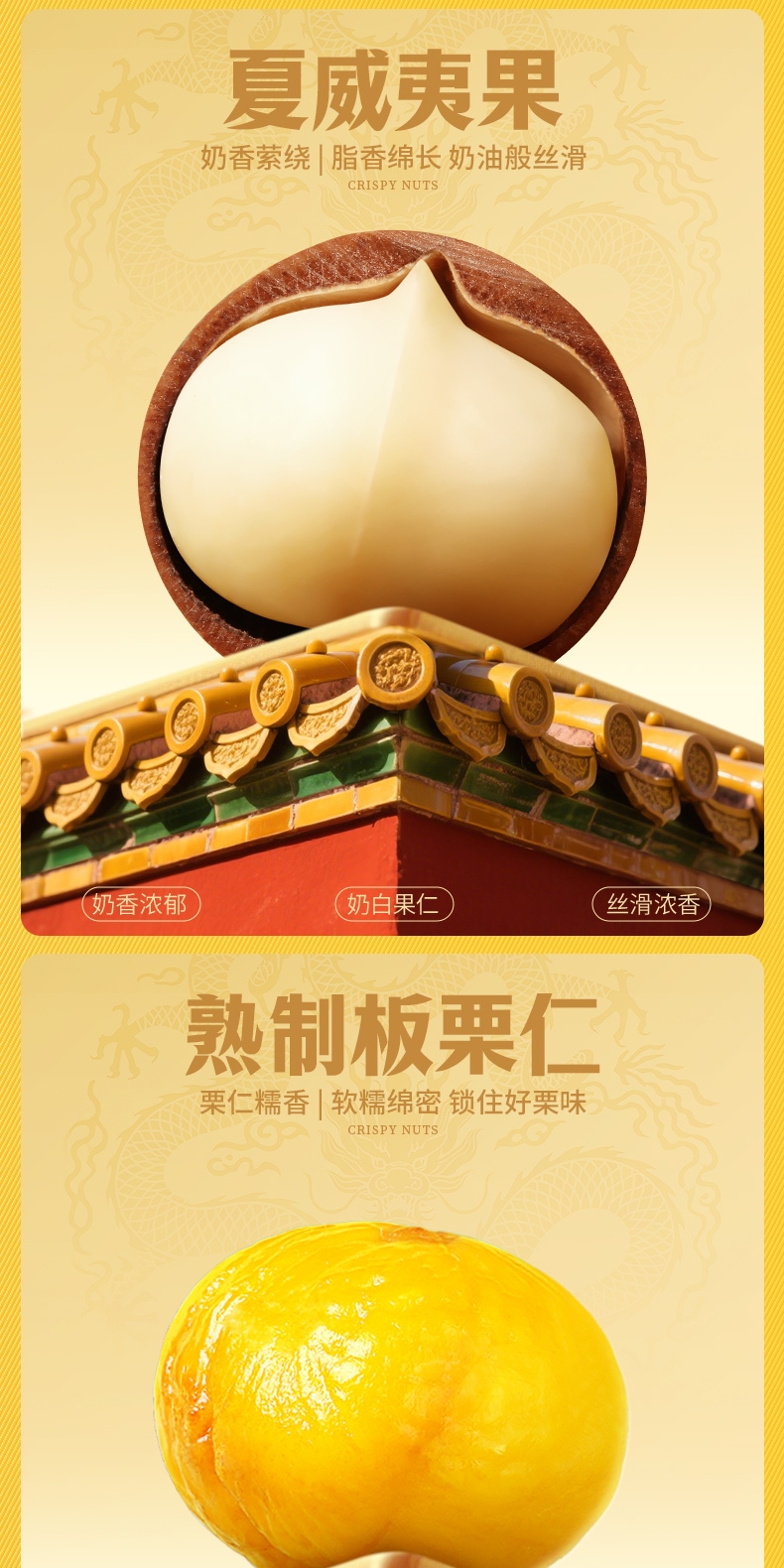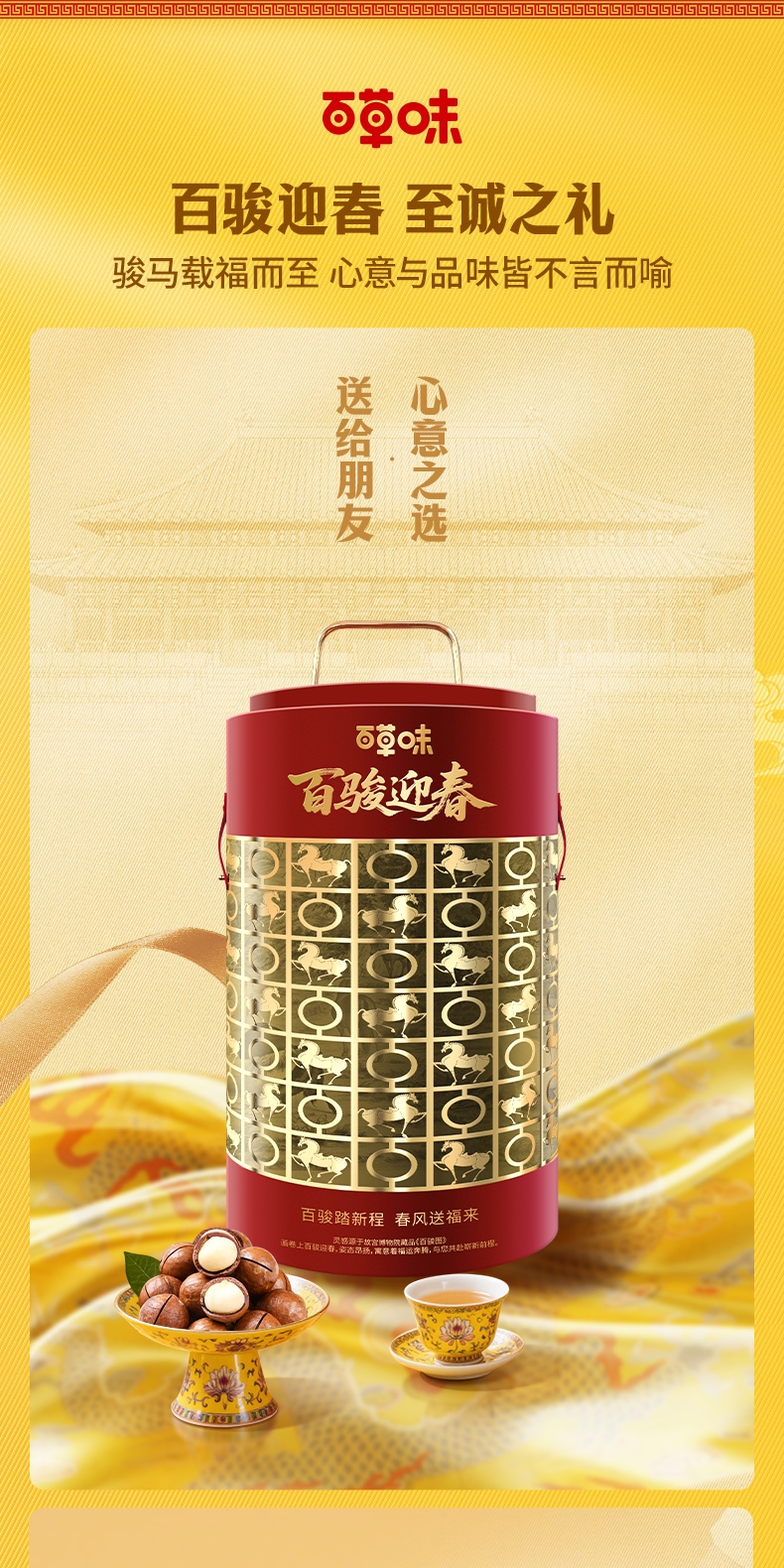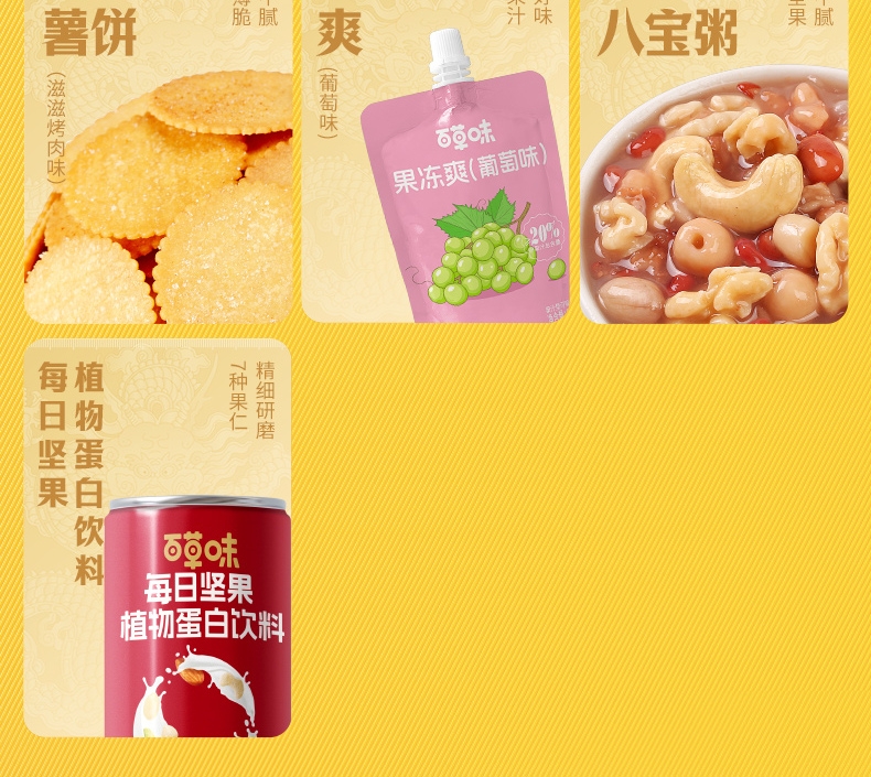 配置:【百草味】夏威夷果(奶油味) 60g 【百草味】熟制板栗仁40g袋装 【百草味】鸭脖(甜辣味)65g 【百草味】鸭锁骨(甜辣味)80g 【百草味】一口芒果条(原味)25g 【百草味】玫瑰红葡萄干 58g 【百草味】酸甜老婆梅50g 【百草味】阿胶蜜枣50g 【百草味】多味花生 70g 【百草味】蟹香瓜子仁30g 【百草味】香酥青豌豆(蒜香味) 70g 【百草味】咖啡味玉米45g 【百草味】拉面丸子 50g(墨西哥牛肉风味) 【百草味】山药脆片(香葱味) 45g 【百草味】黄金米果酥 70g 【百草味】小圆饼干 100g(海盐味) 【百草味】薄脆薯饼(滋滋烤肉味)70g 【百草味】果冻爽(葡萄味)150g 【百草味】每日坚果乳 310g 【百草味】坚果八宝粥360g