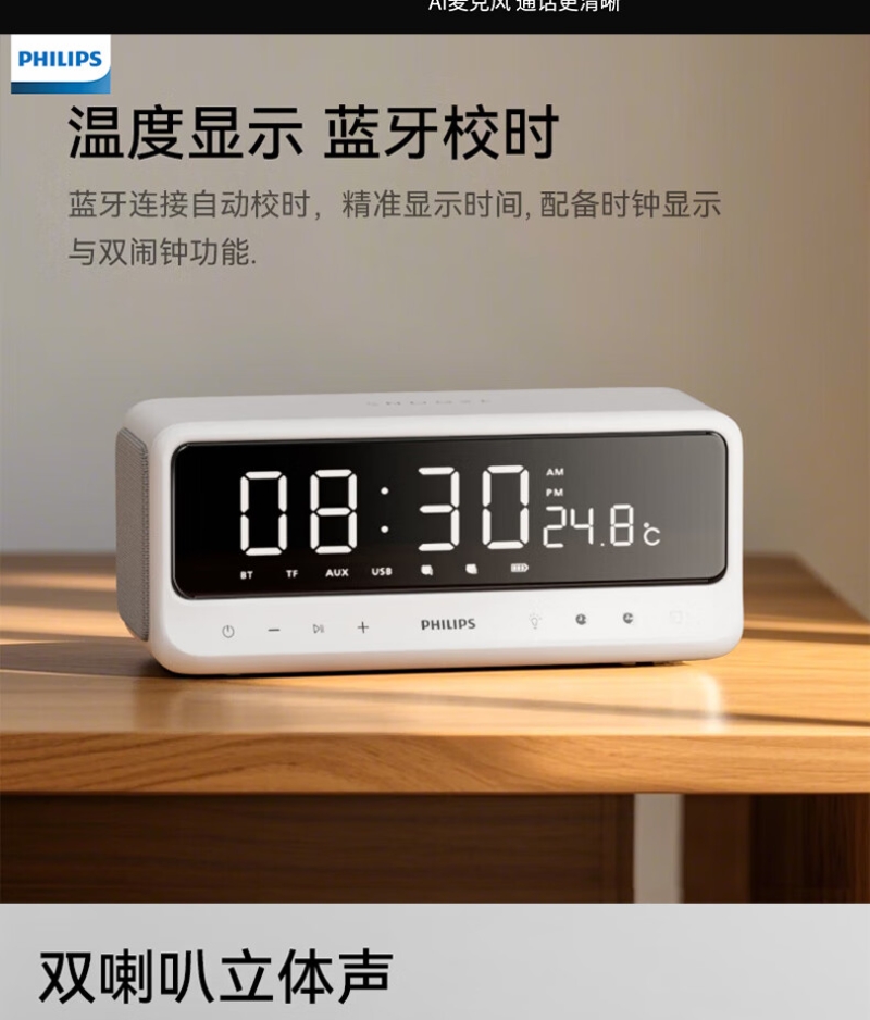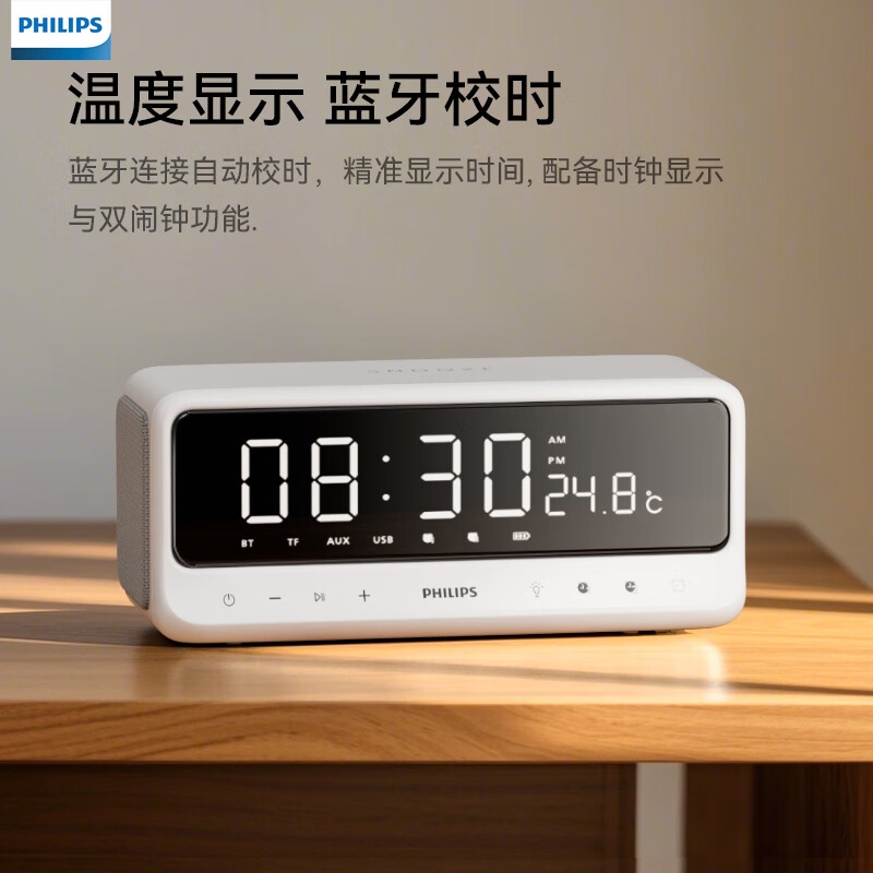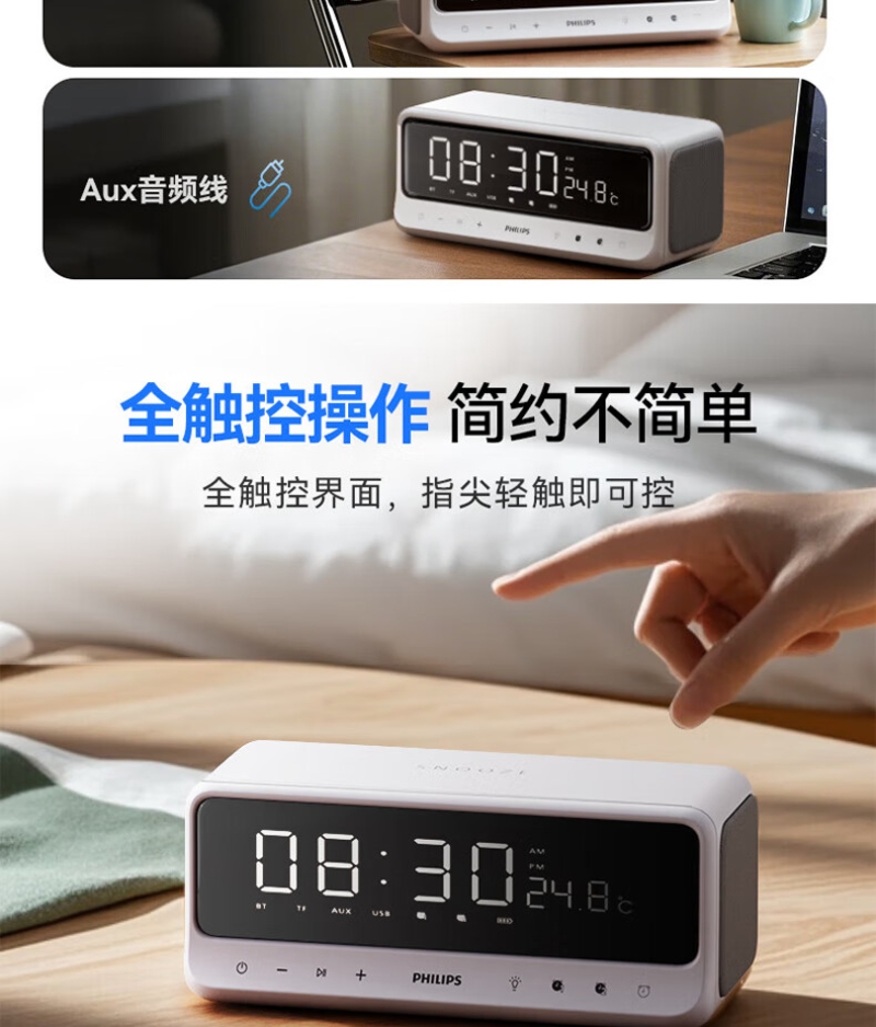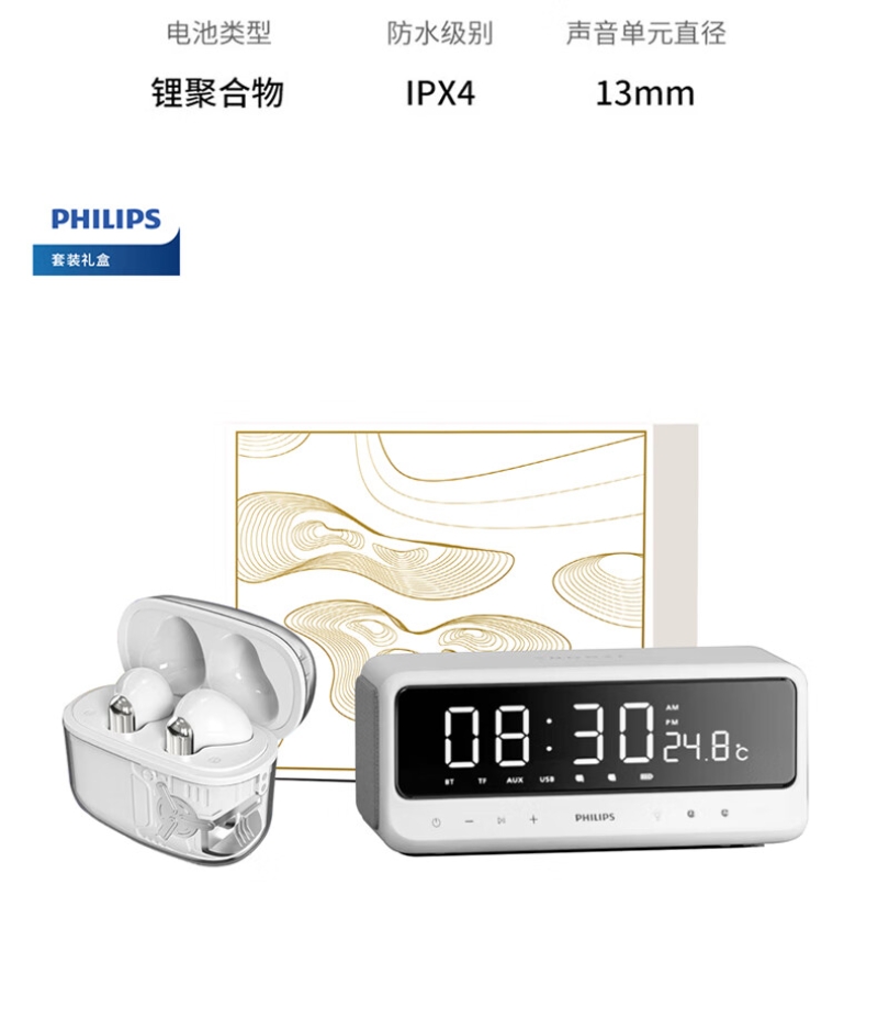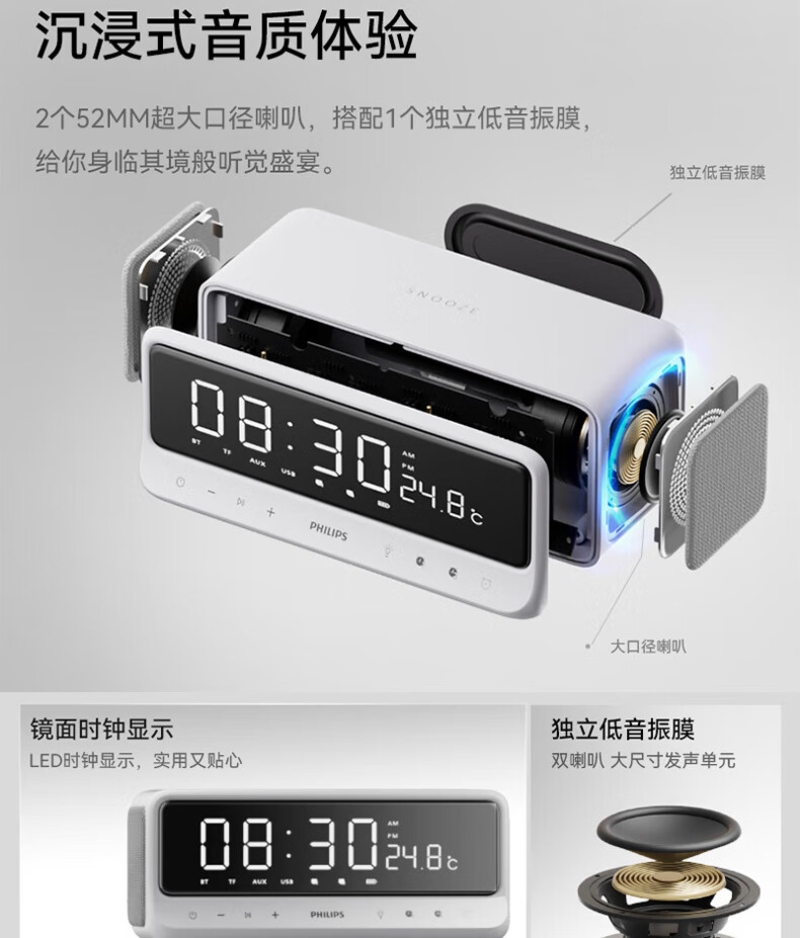 镜面LED时钟显示,匠心设计,音乐与时钟的美妙邂逅;蓝牙连接自动校时,精准显示,双闹钟功能;混合24小时长续航,支持快充,充电15分钟,即可使;IPX4级防汗抗水溅,无惧汗水挥洒,只需自在聆听