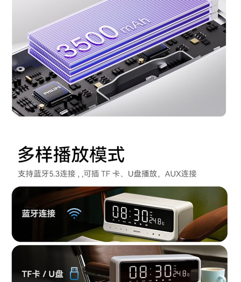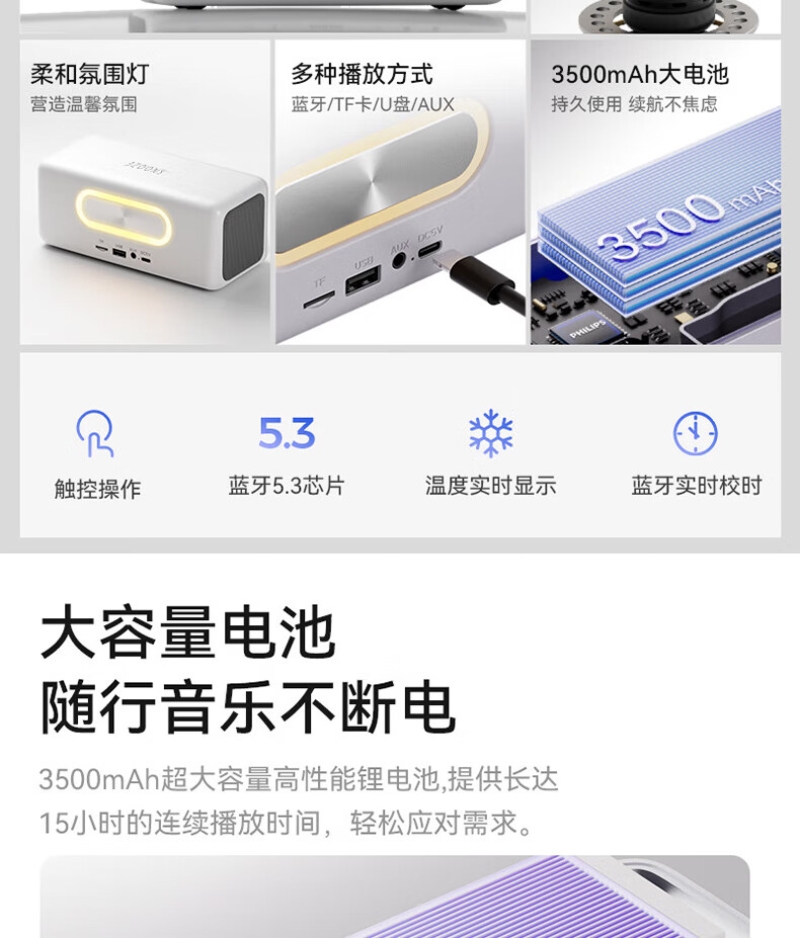 蓝牙音箱:支持蓝牙/TF卡/U盘播放/AUX外部音频输入,多种播放模式。