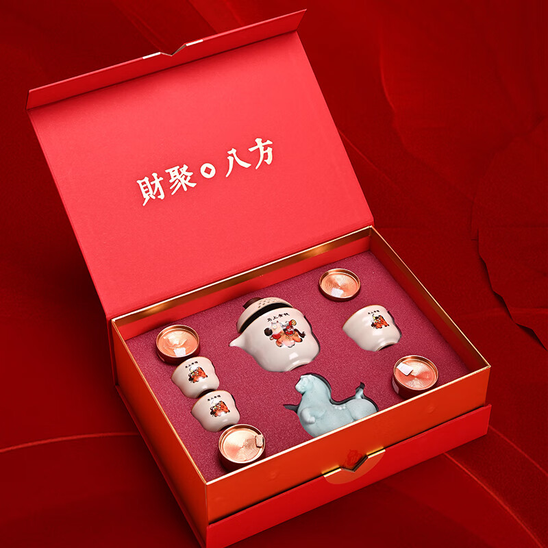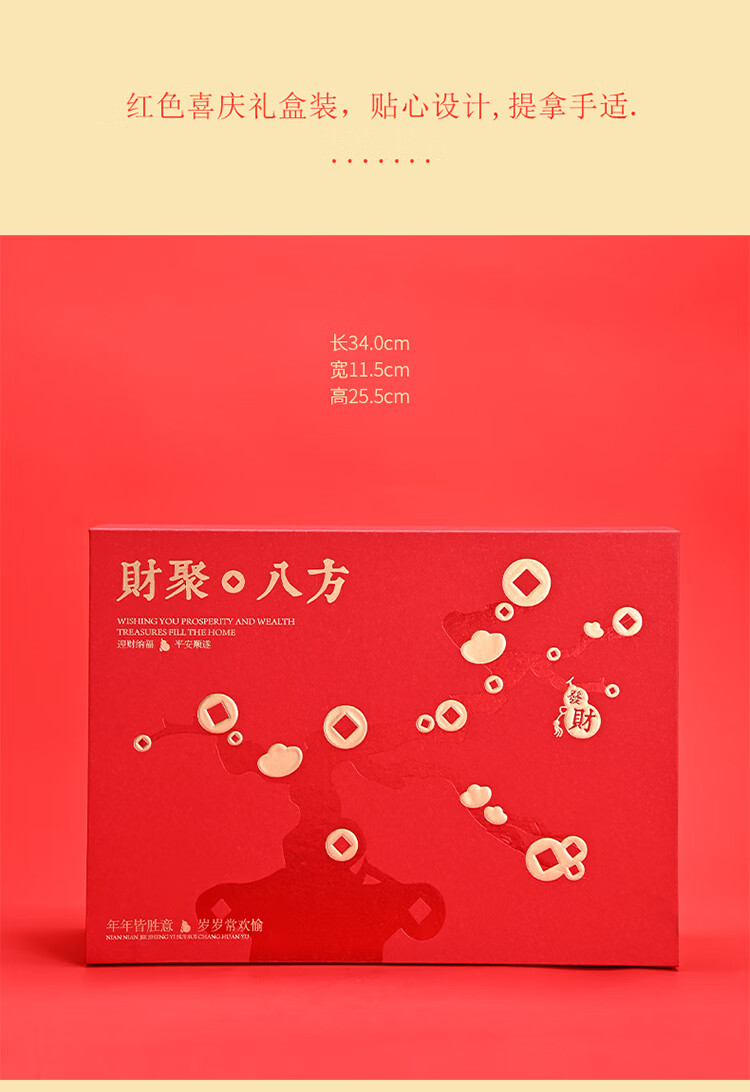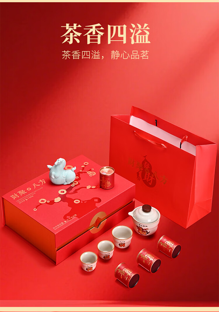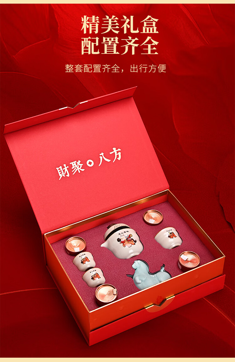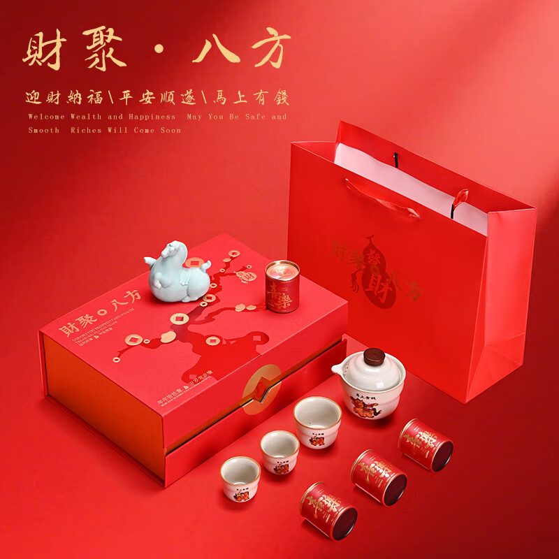财聚八方,寓意吉祥;天然矿物釉,高温烧制无铅镉;红色礼盒,喜气洋洋