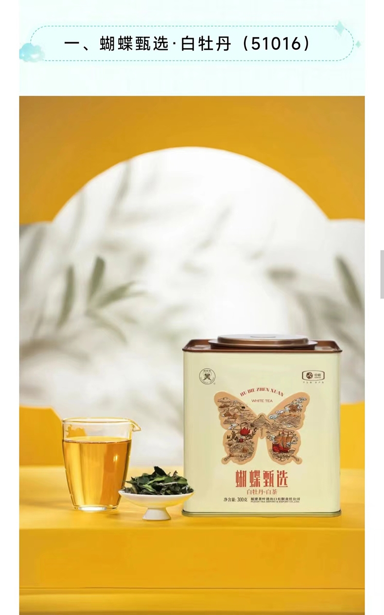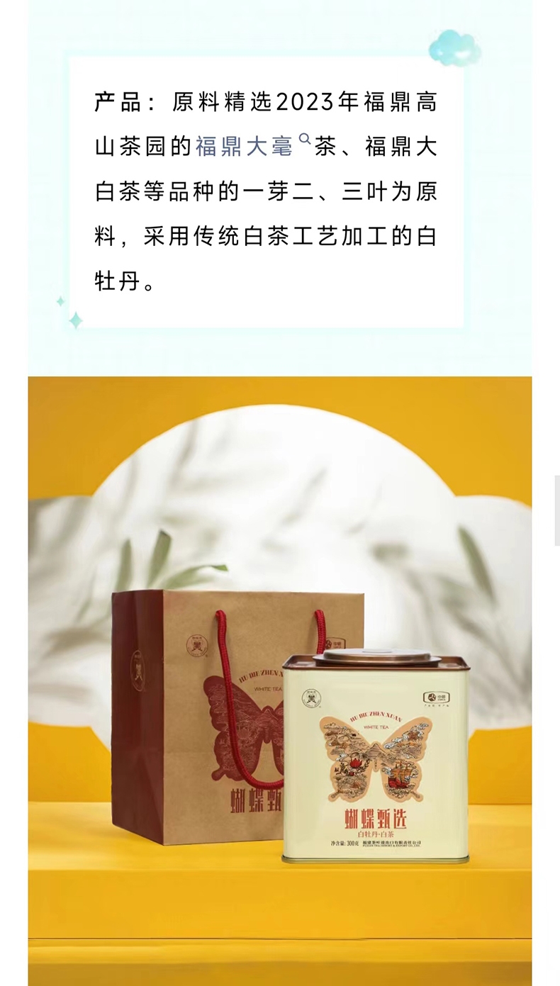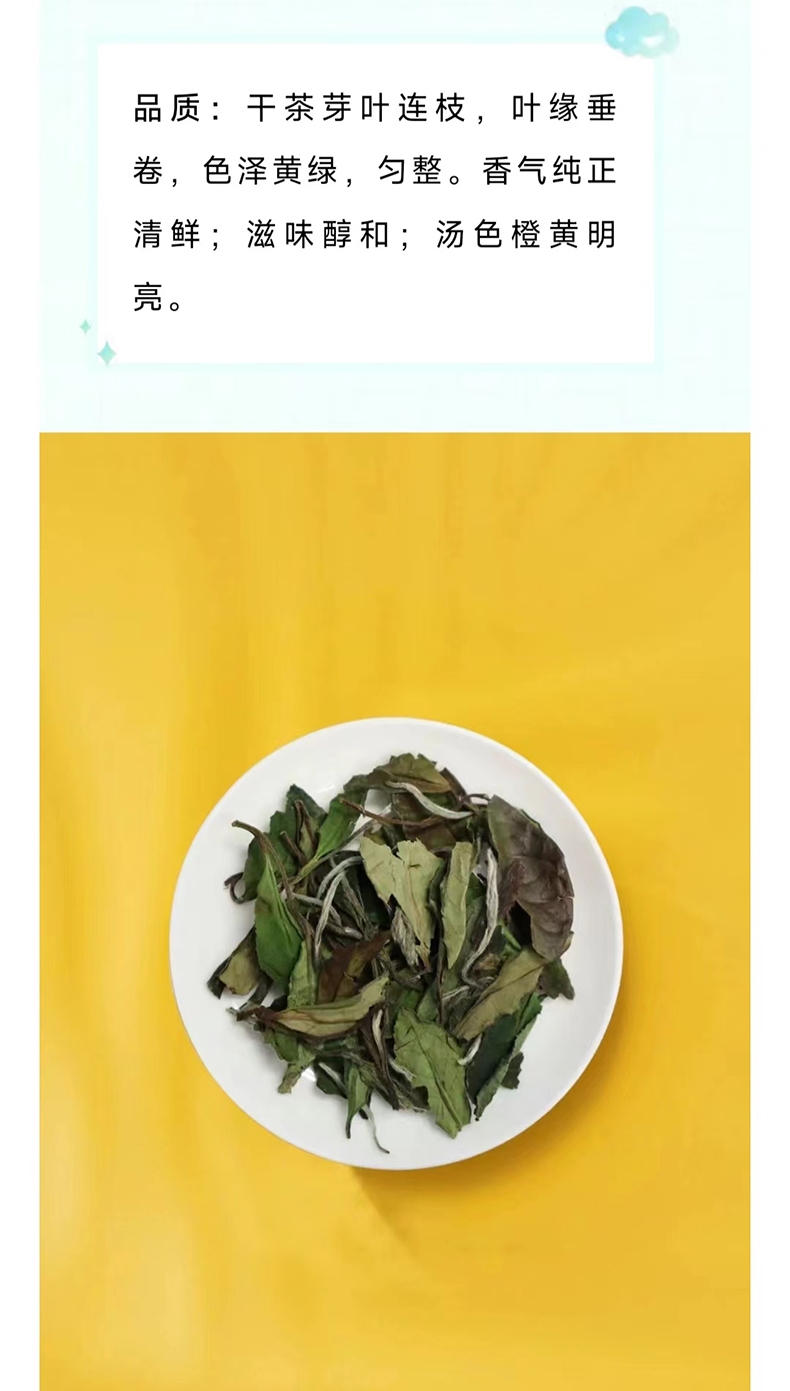 一芽二、三叶为原料,;采用传统白茶工艺加工的白牡丹。;叶缘垂卷,色泽黄绿,匀整。香气纯正清鲜;滋味醇和