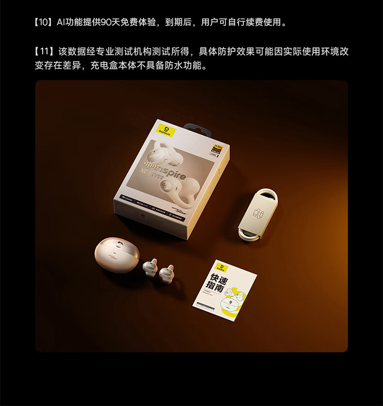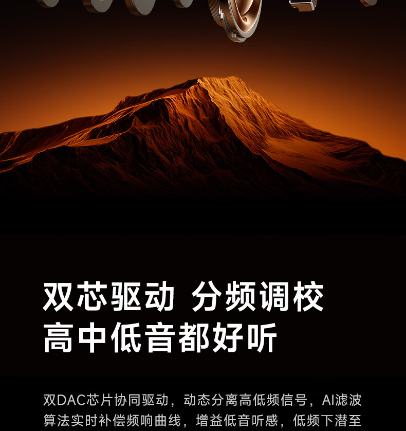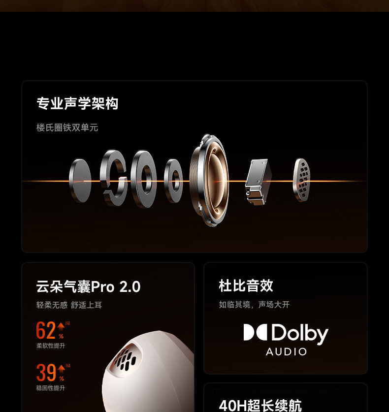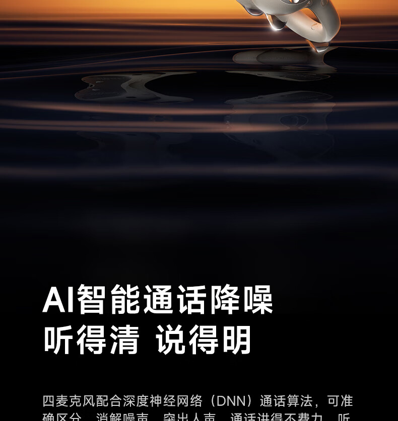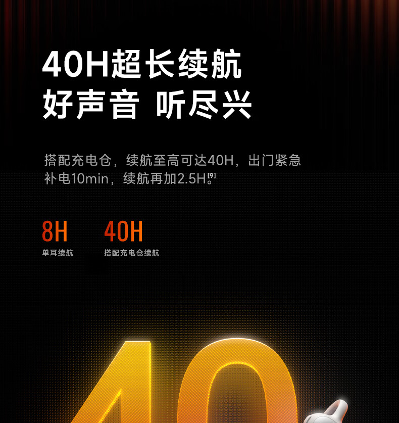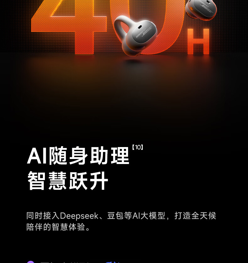 40H超长续航,好声音,听尽兴;AI智能通话降噪,听得清,说得明。;接入AI大模型,打造全天候陪伴的智慧体验