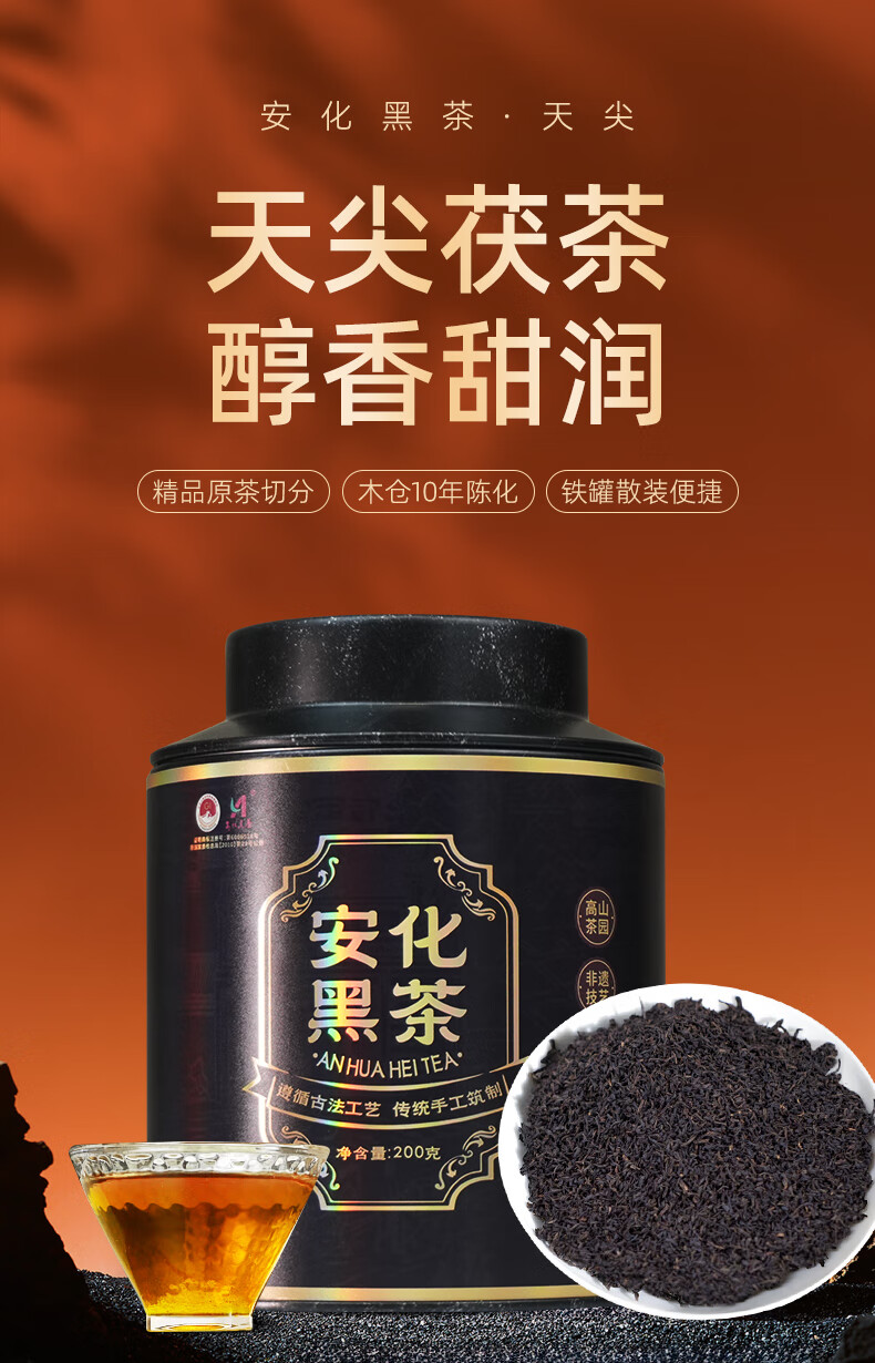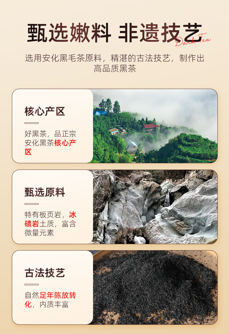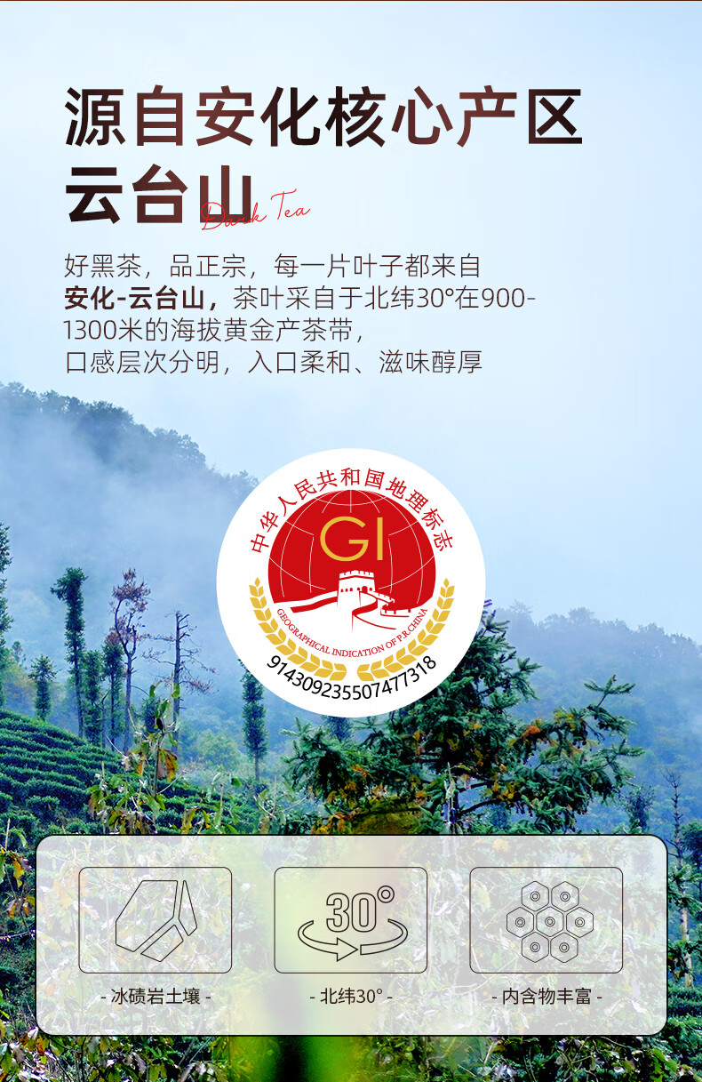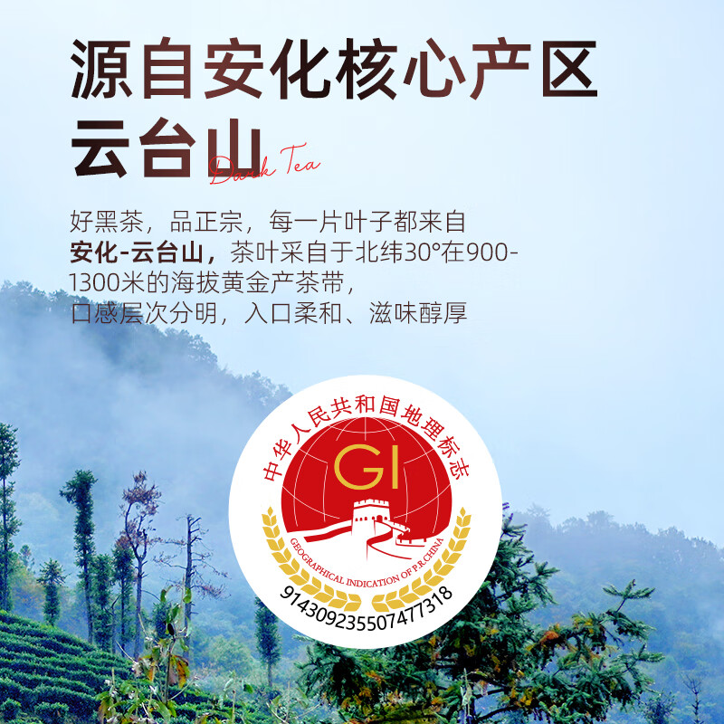 源自“中国黑茶之乡”安化,国家地理标志产品;核心产区云台山茶料,2015年一级安化黑毛茶为原料;木仓自然陈放转化,内质丰富,条索紧结,叶片肥厚细嫩