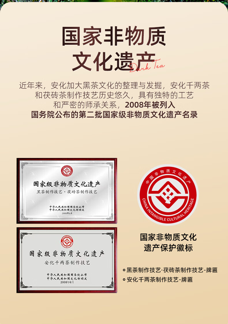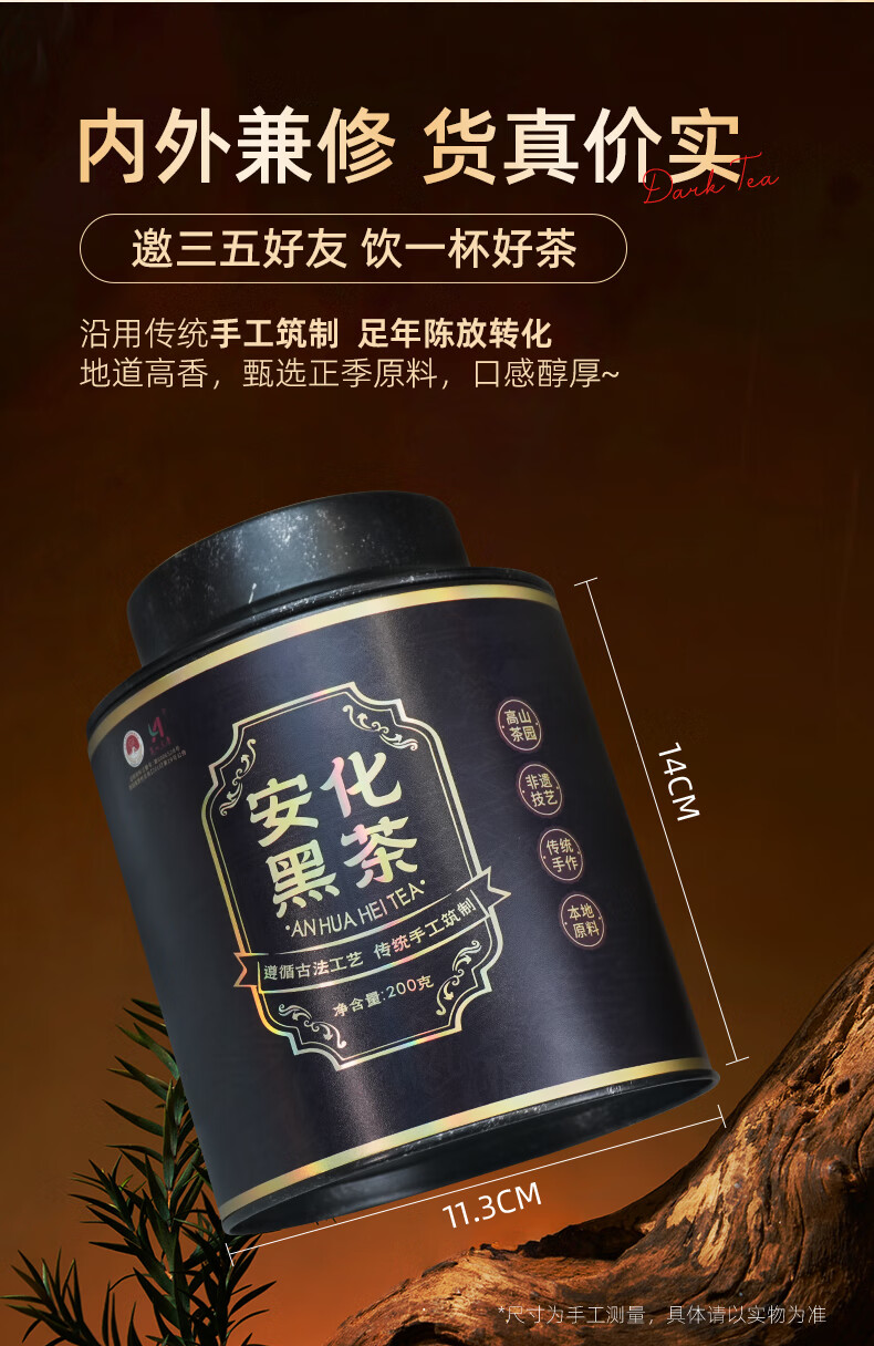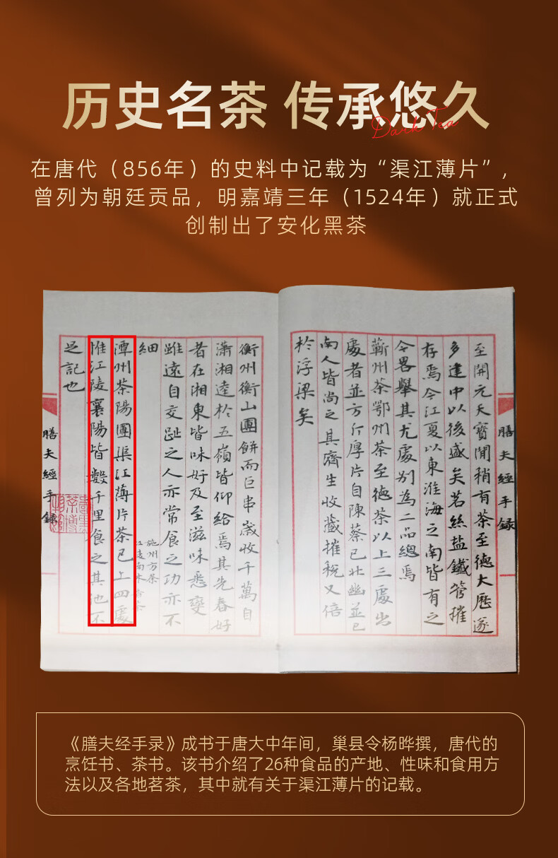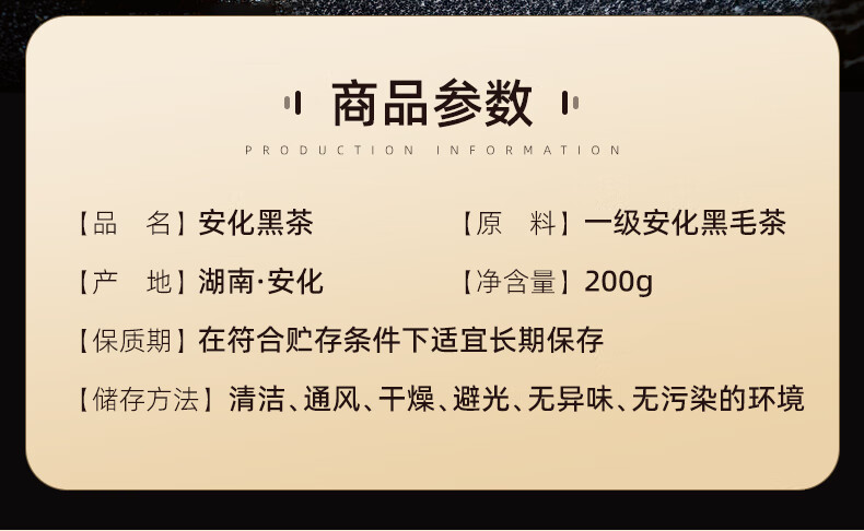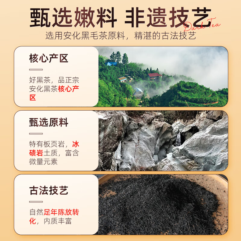 源自“中国黑茶之乡”安化,国家地理标志产品;核心产区云台山茶料,2015年一级安化黑毛茶为原料;木仓自然陈放转化,内质丰富,条索紧结,叶片肥厚细嫩