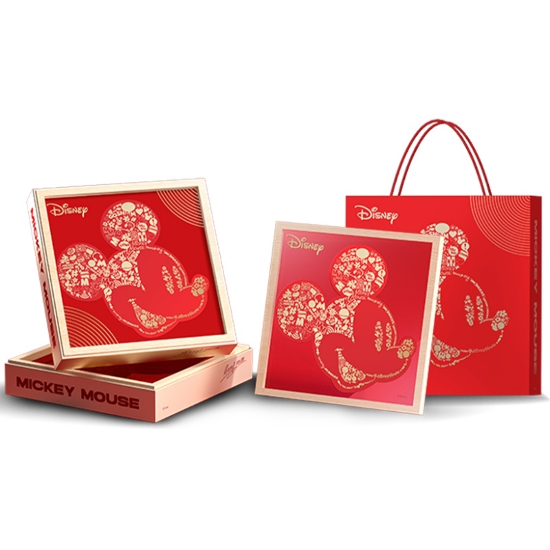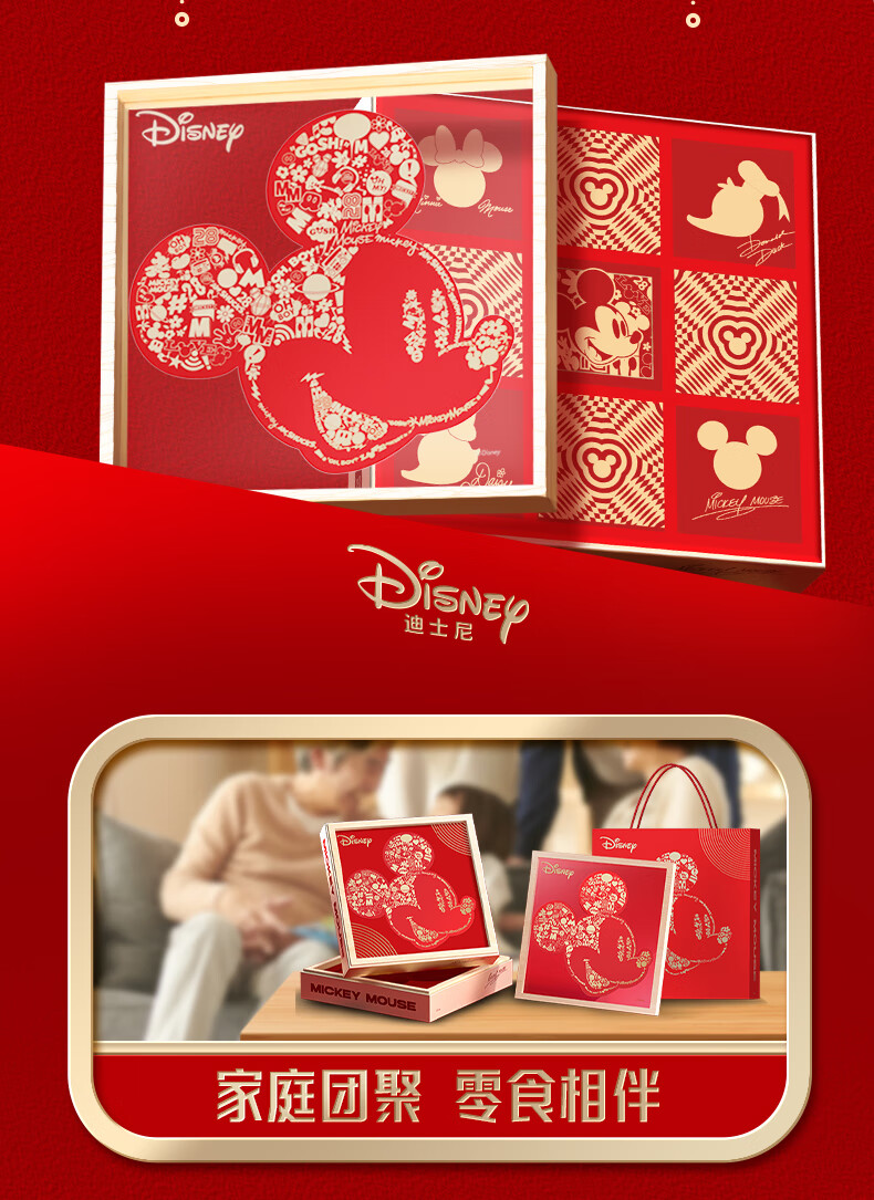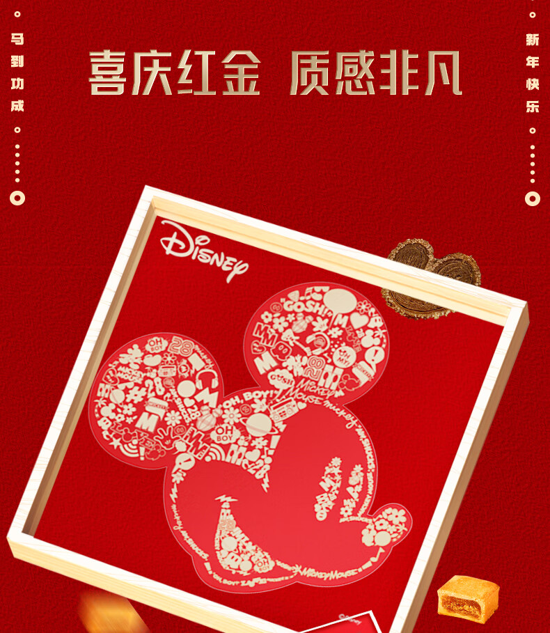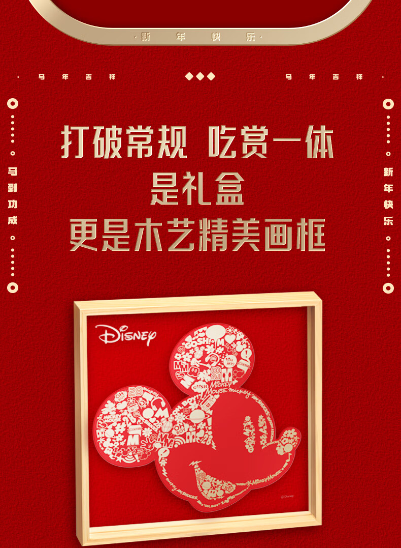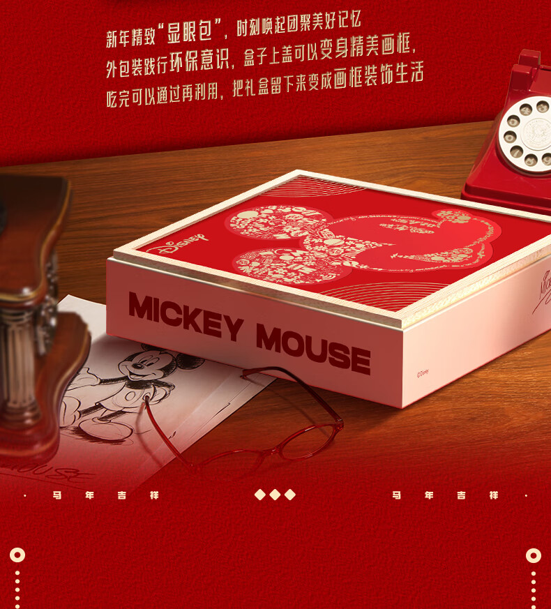 米奇系列木艺画框新年礼盒 吃赏玩一体!;经典喜庆红金配色,新年礼赠大气体面上档次;过年团聚必备糕点