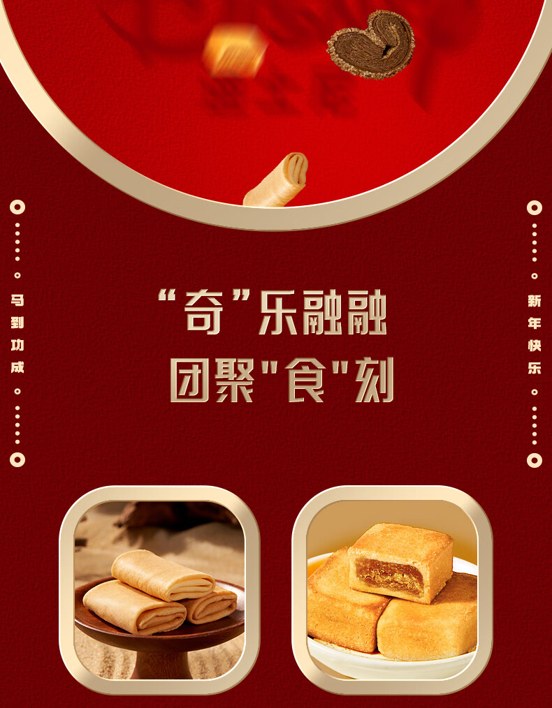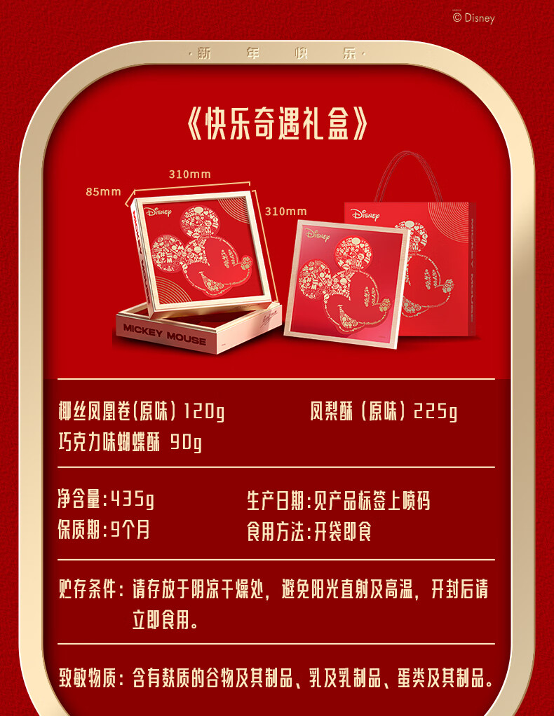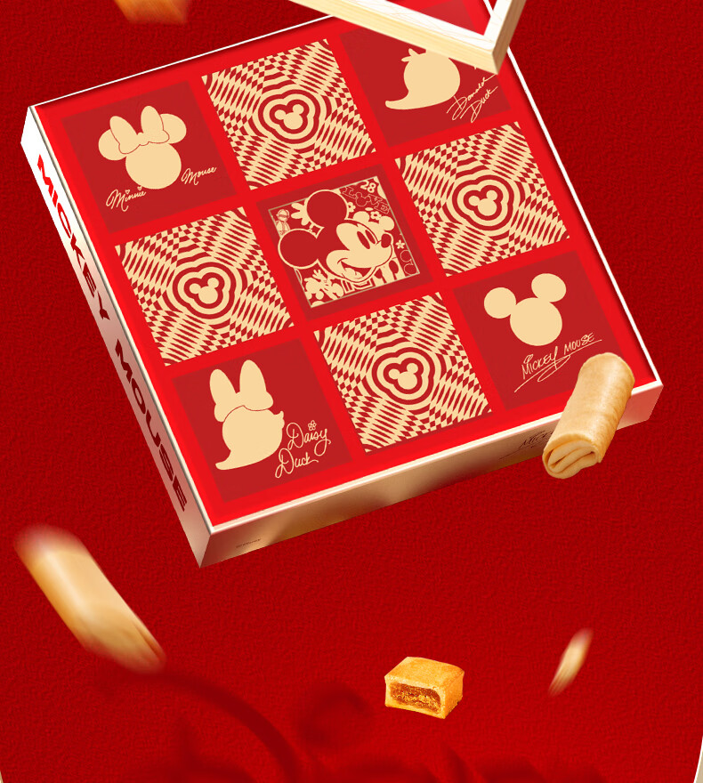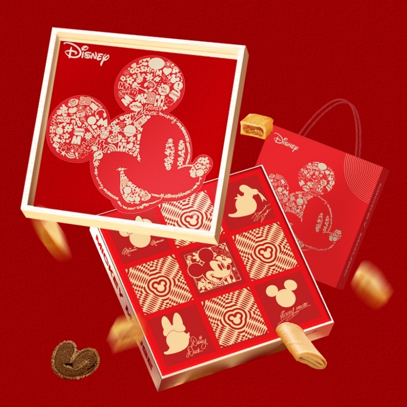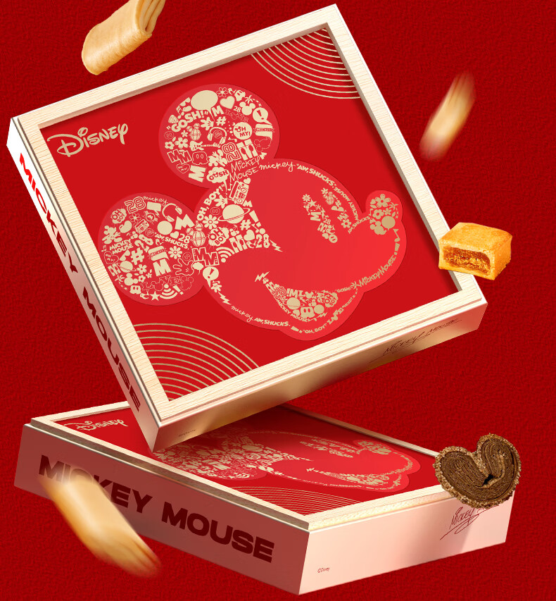 米奇系列木艺画框新年礼盒 吃赏玩一体!;经典喜庆红金配色,新年礼赠大气体面上档次;过年团聚必备糕点