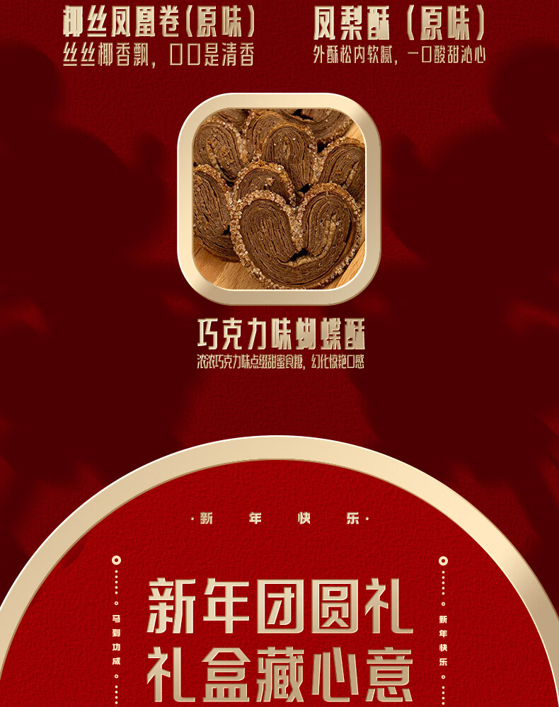 配置清单:椰丝凤凰卷(原味) 120g 凤梨酥(原味) 225g 巧克力蝴蝶酥 90g