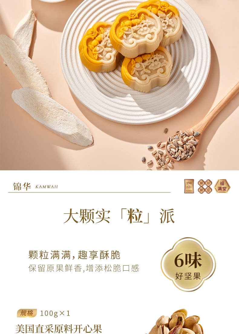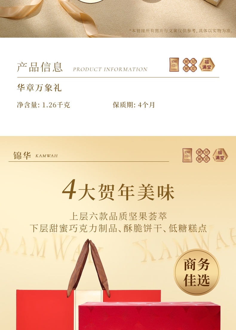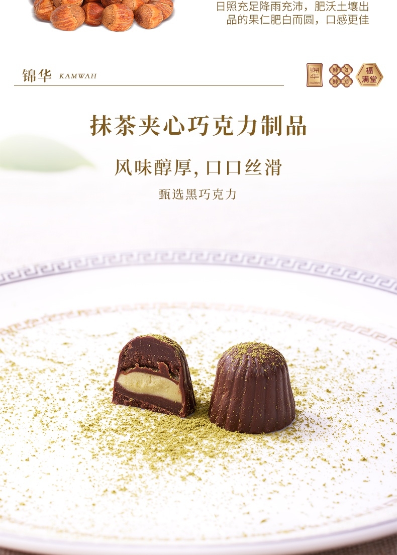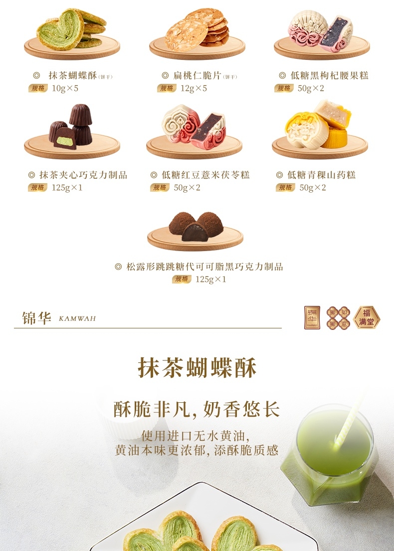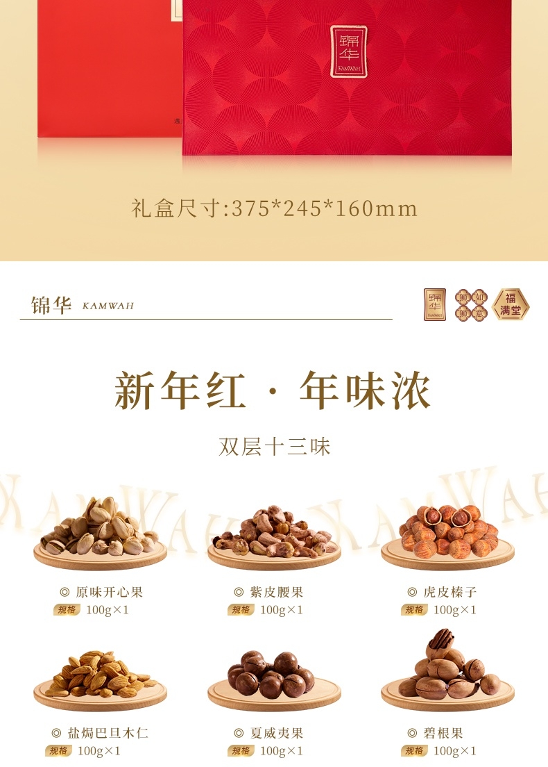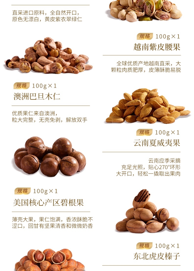 配置:上层 原味开心果100克x1 紫皮腰果100克x1 虎皮榛子100克x1 盐焗巴旦木仁100克x1 夏威夷果100克x1 碧根果100克x1 下层 : 抹茶夹心巧克力制品125克x1 松露形跳跳糖代可可脂黑巧克力制品125克x1 抹茶蝴蝶酥10克x5 扁桃仁脆片12克x5 低糖黑枸杞腰果糕50克x2 低糖红豆薏米茯苓糕50克x2 低糖青稞山药糕50克x2