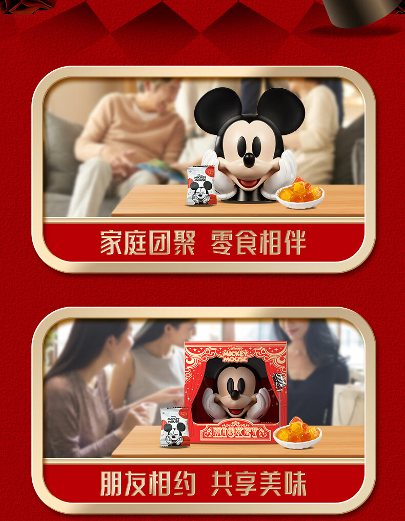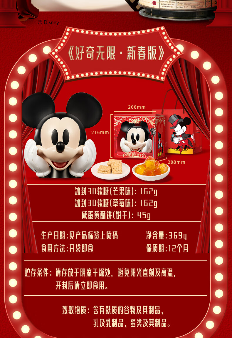 米奇托脸造型生动传神,潮玩属性拉满,可做精致摆件;送大小朋友送客户好友,新春佳礼首选!;内置软糖,咸蛋黄酥饼(饼干),带来满满快乐和惊喜
