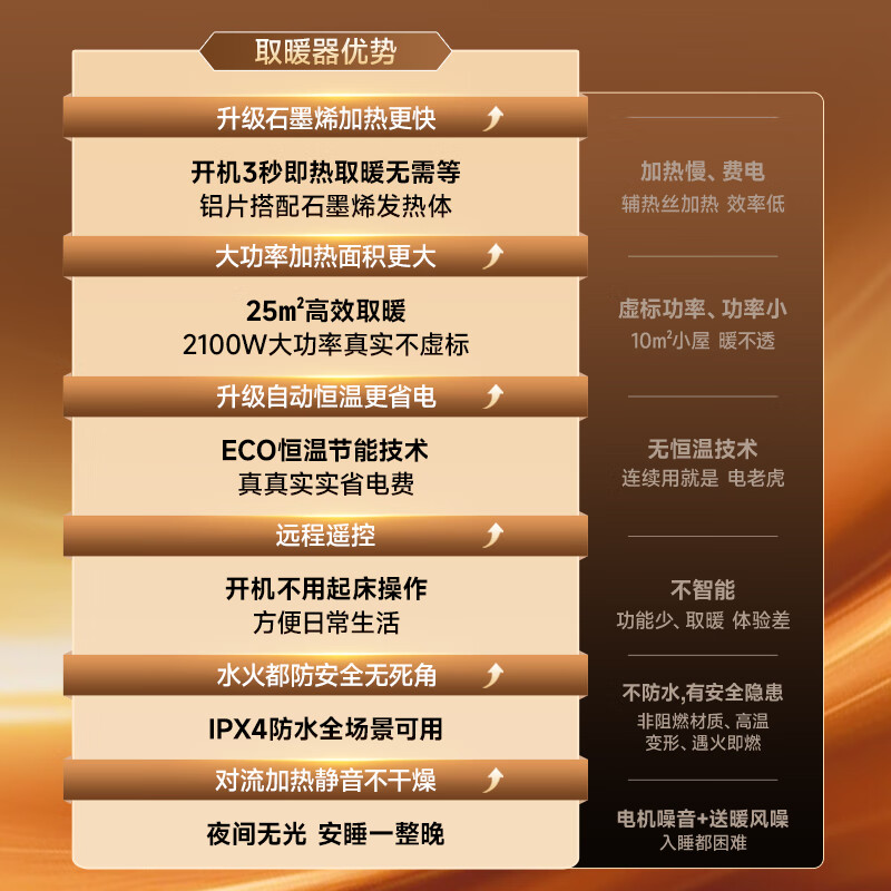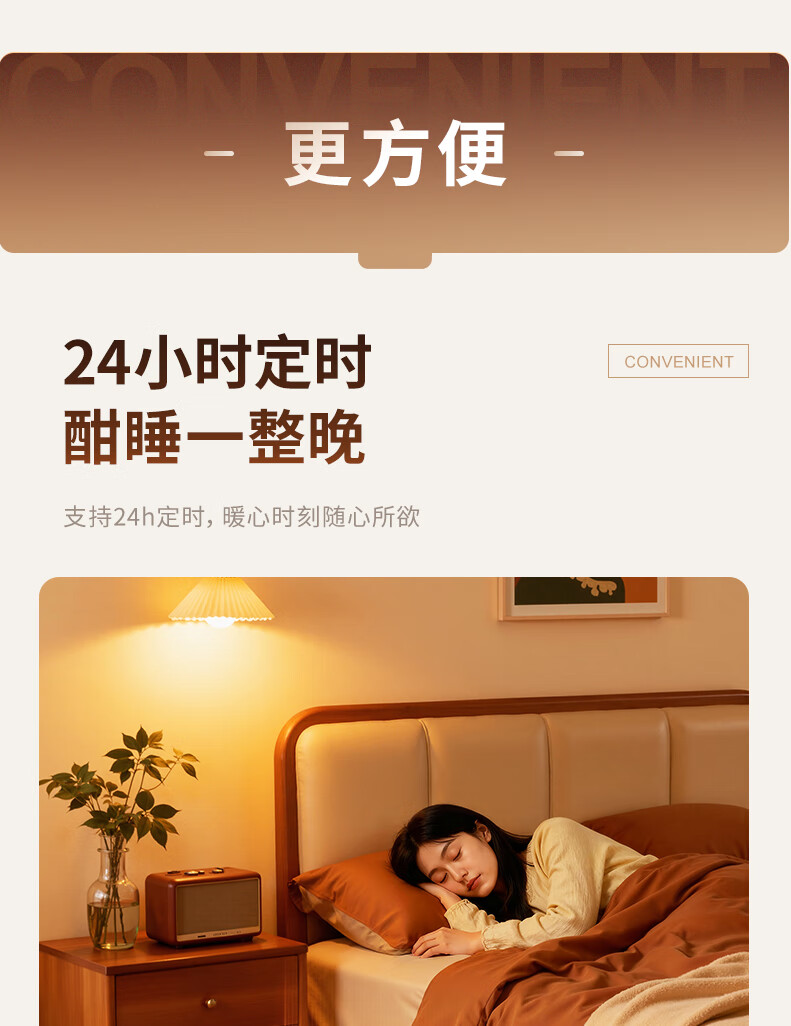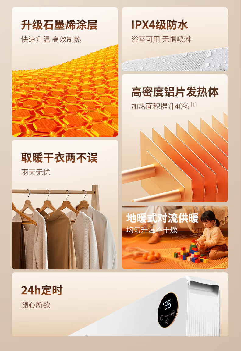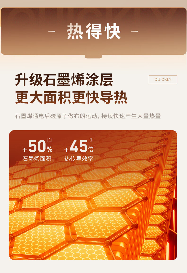石墨烯技术,导热均匀更快速;遥控+触控,两种操作方式,方便快捷;1-24h定时,自由设定