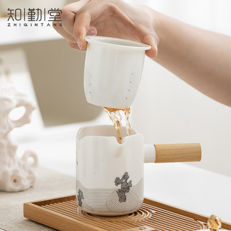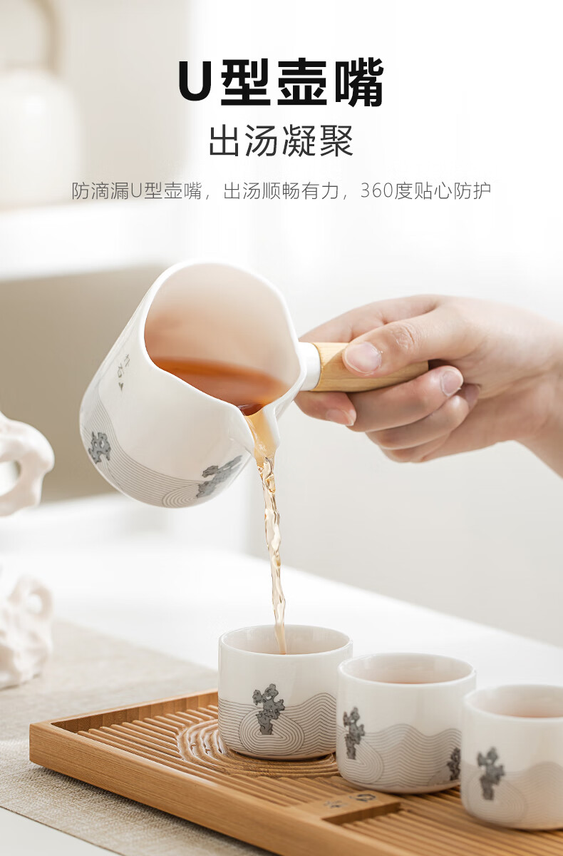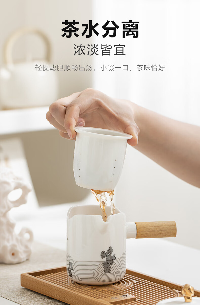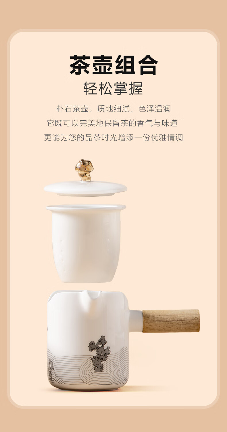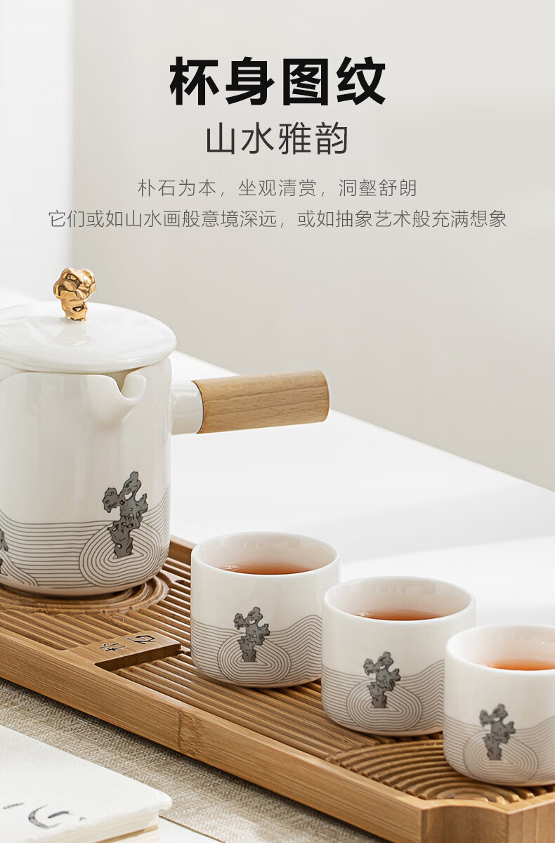 配置:侧把壶*1、茶杯*4、竹质盖子*2、过滤*1、竹茶盘*1、
