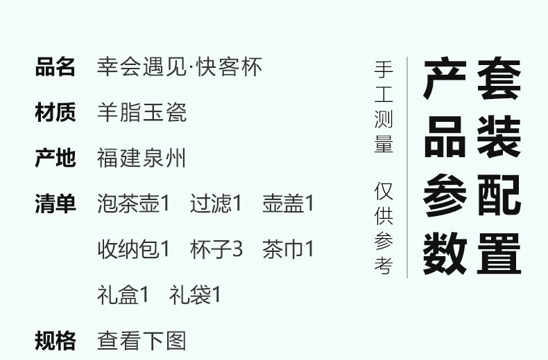 配置:茶壶*1、茶杯*3、过滤*1、杯盖*1、茶巾*1、