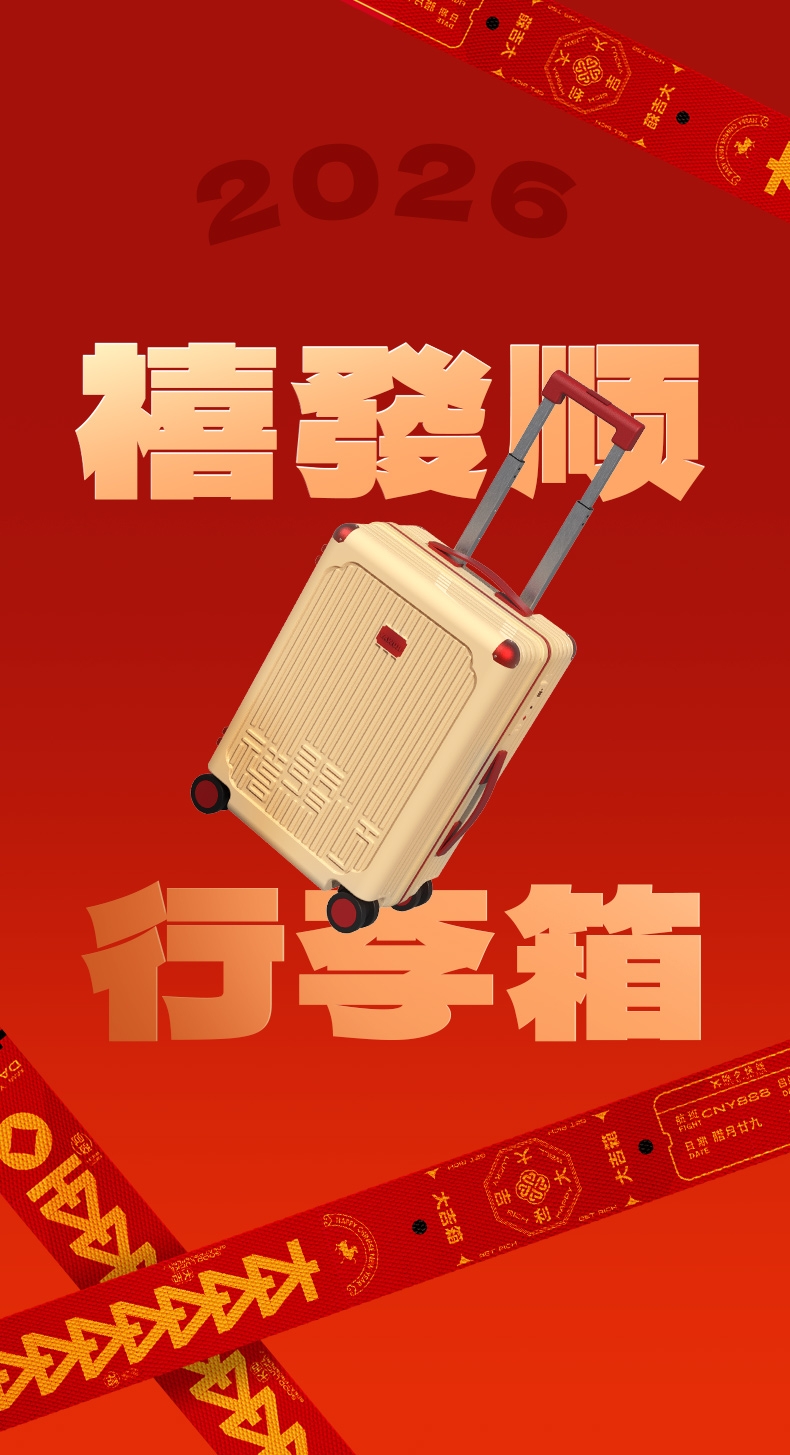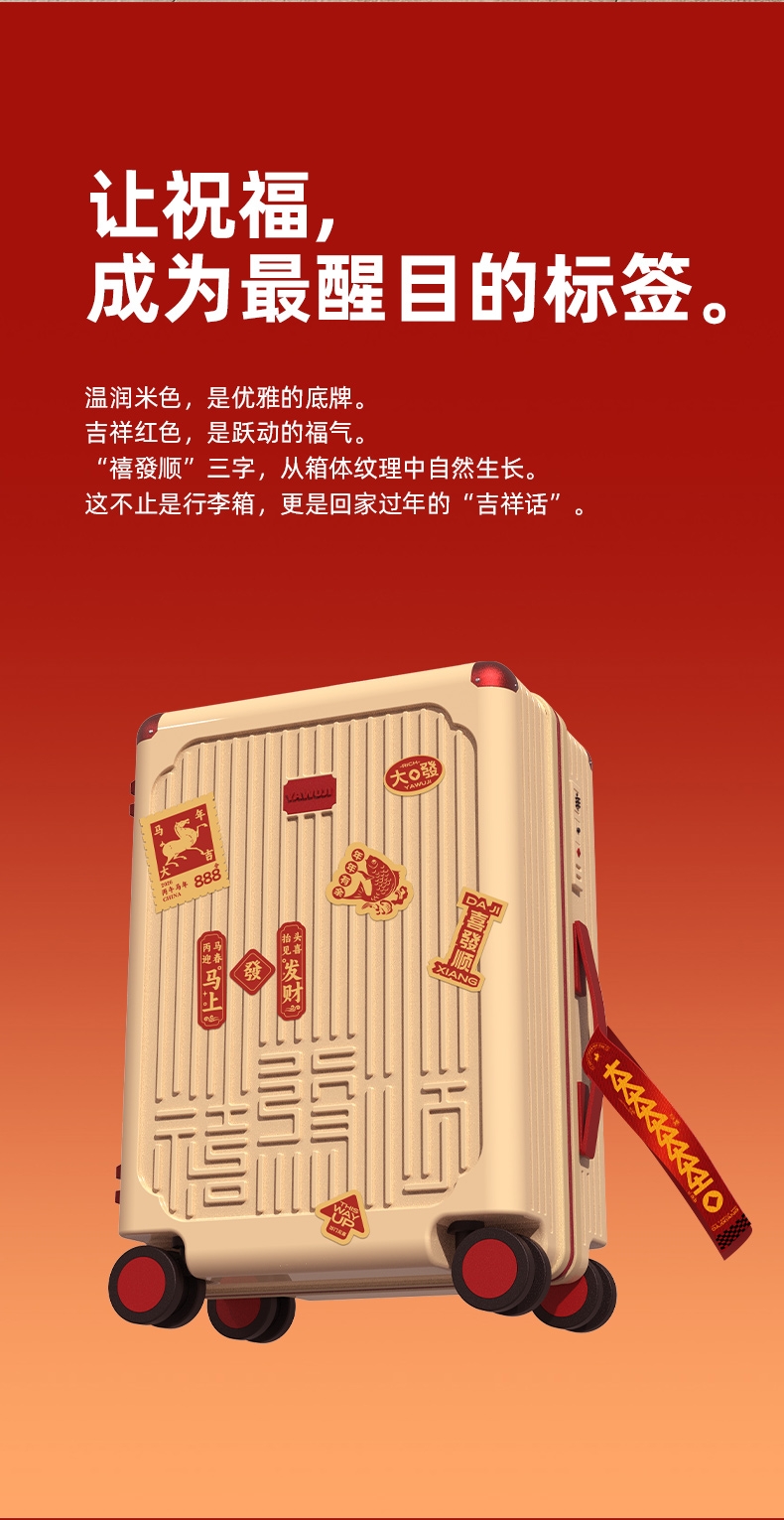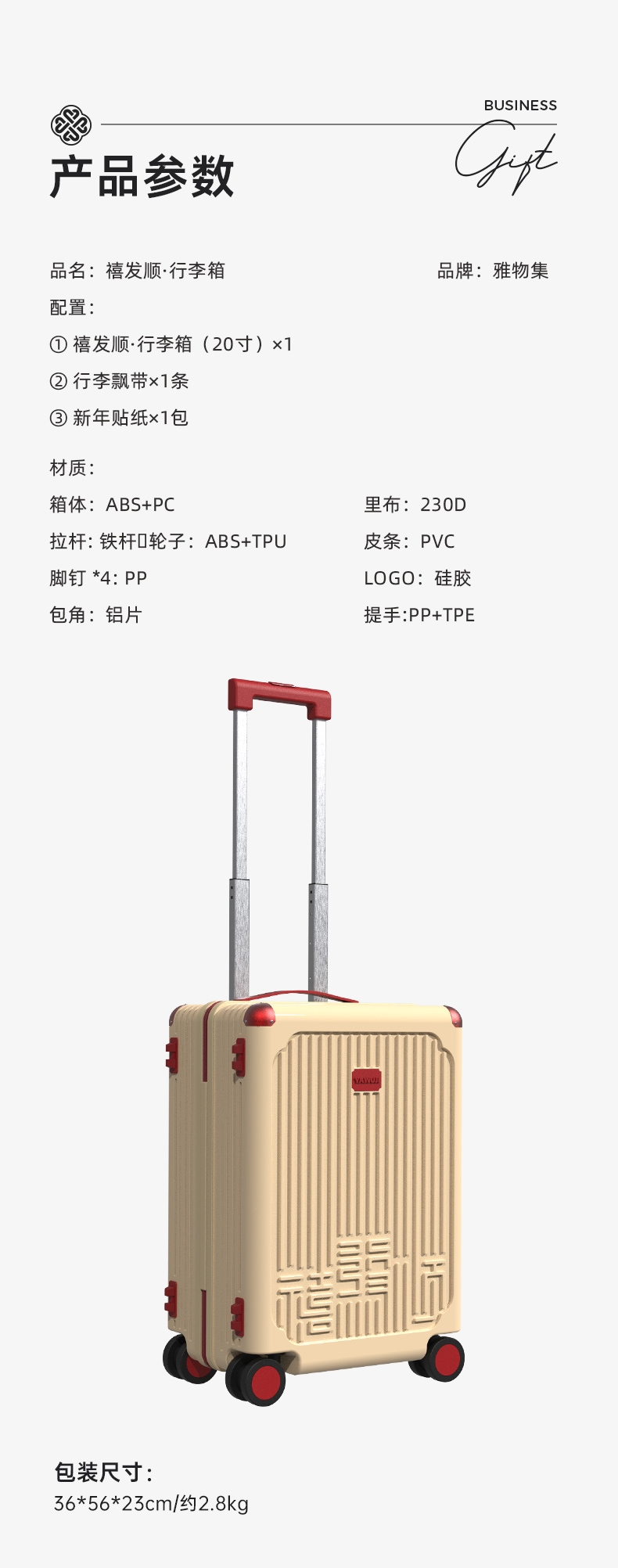 配置:① 禧发顺行李箱 ② 行李飘带×1条 ③ 新年贴纸×1包