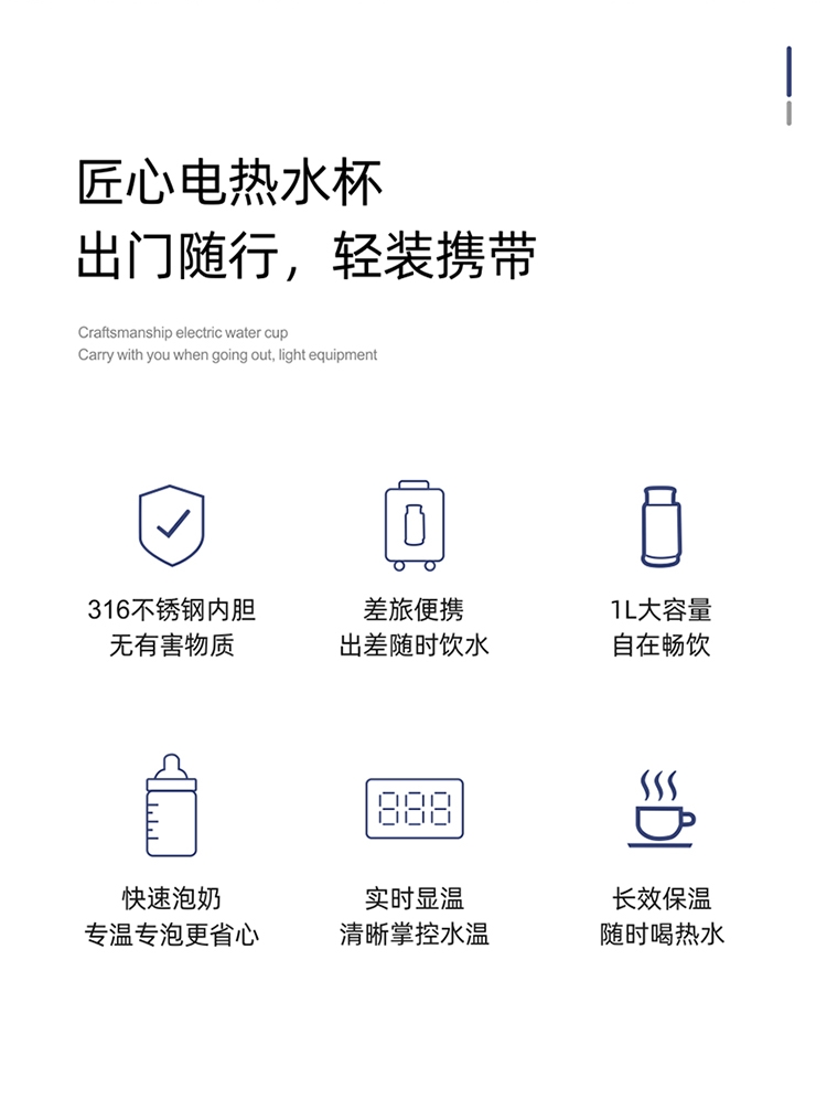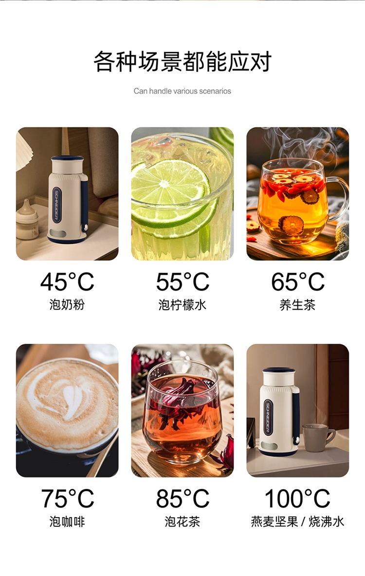 工位上的私人茶饮师,3分钟喝上定制温度的好茶;您的专属移动热水吧,告别酒店热水壶卫生困扰;只要有电,荒野也能喝上一杯热咖啡,提升旅途幸福感