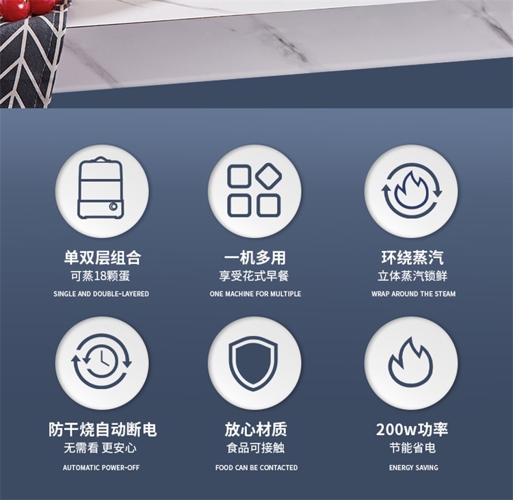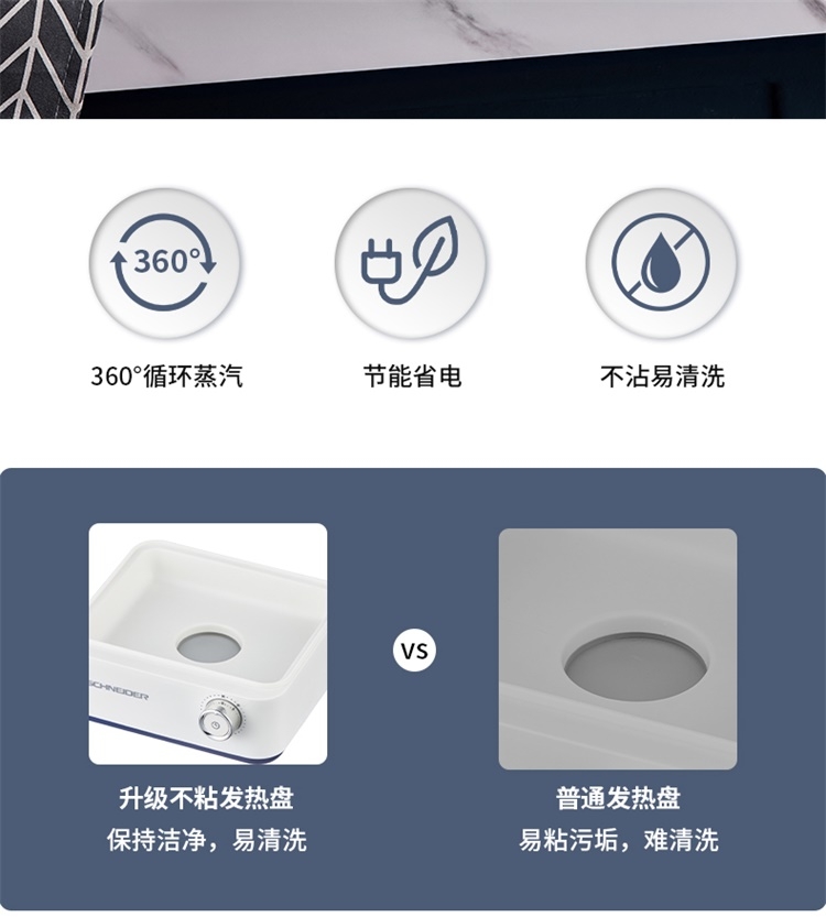 外观时尚,节省台面空间,适合现代厨房;水位过低时自动断电,防止空烧引发危险;蒸格、积水盘、水箱均易于拆卸清洗。