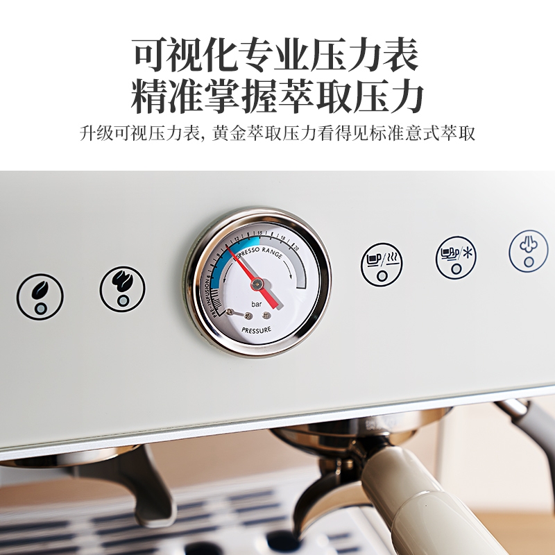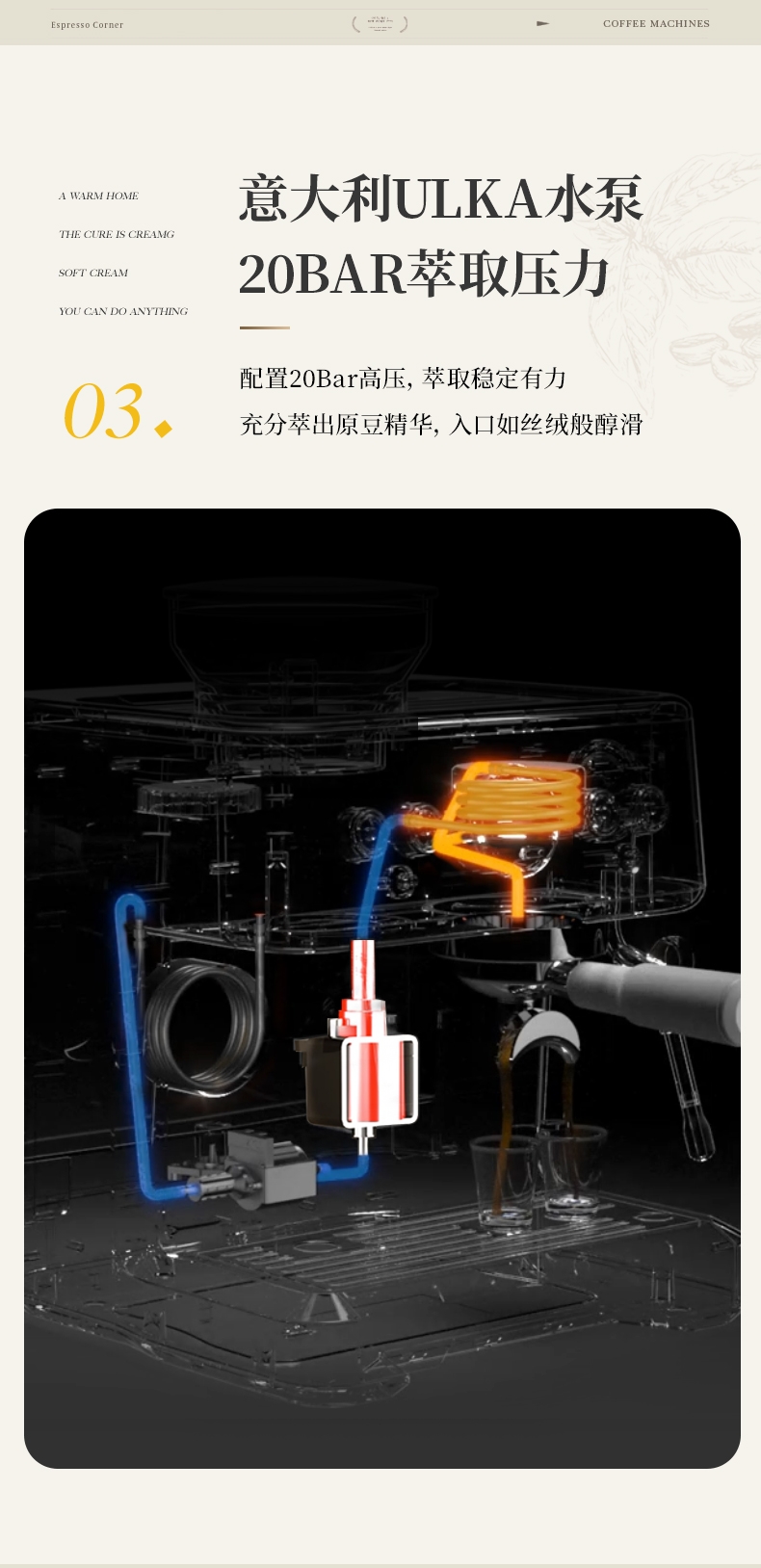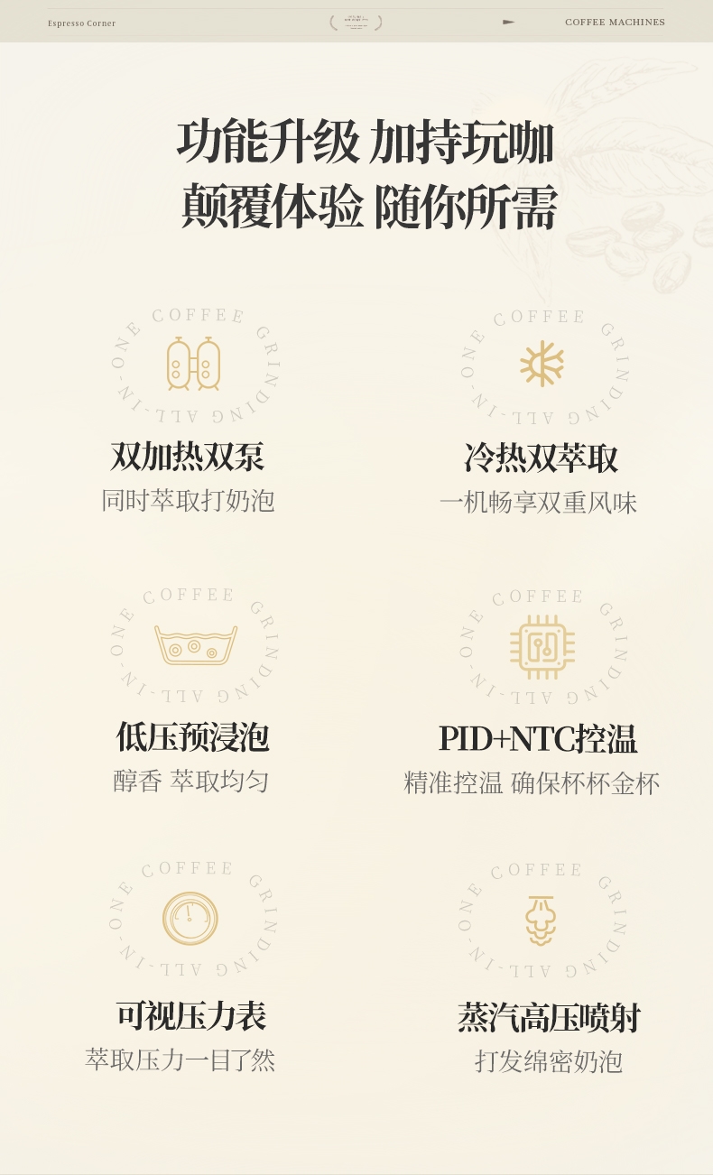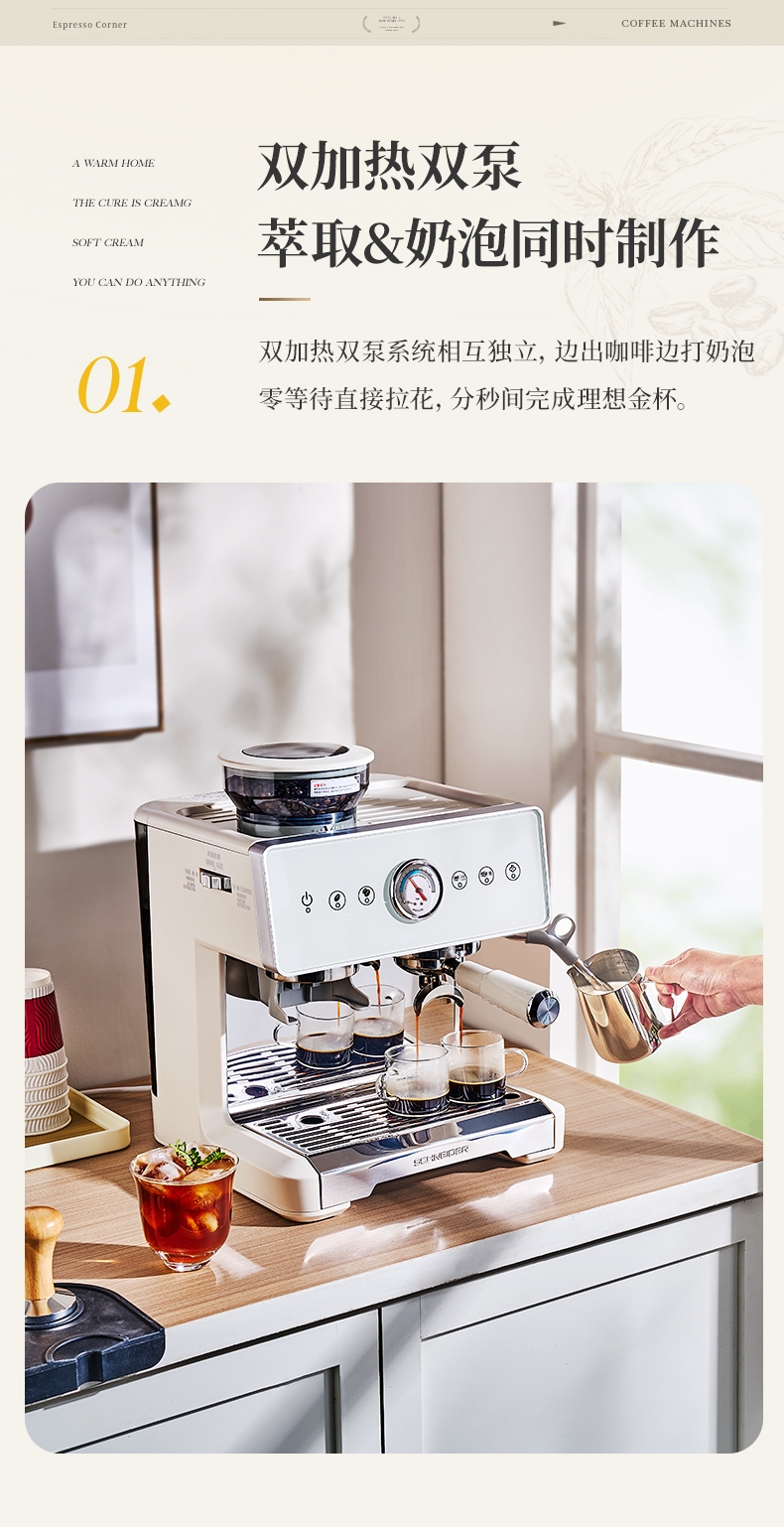 可同时处理多杯饮品,适合高流量场景。;旋转泵提供更稳定压力,噪音低,寿命长,适合高品质需;缺水、缺豆、清洁提醒等,降低运营风险。