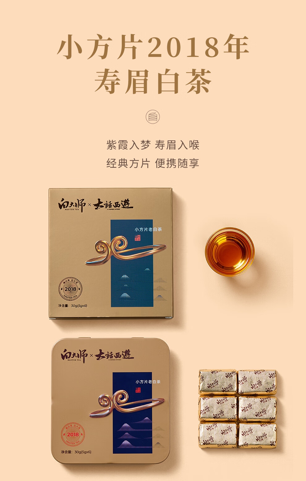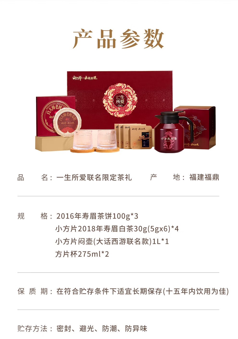 配置清单:2016年寿眉茶饼100g*3 小方片2018年寿眉白茶30g 方片壶(大话西游联名款)1L 方片杯275ml*2