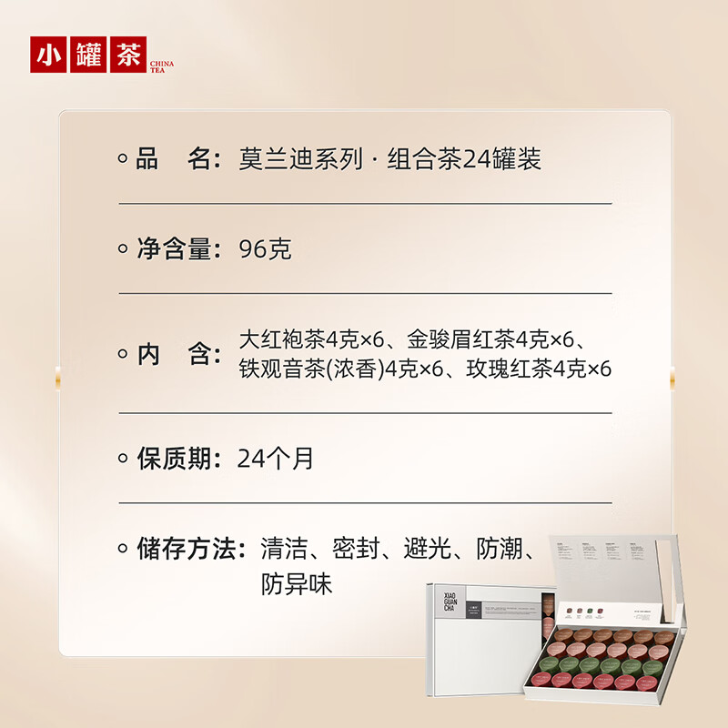 配置:大红袍茶4克x6,金骏眉红茶4克x6,铁观音茶(浓香)4克x6玫瑰红茶4克x6