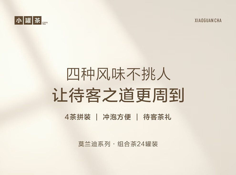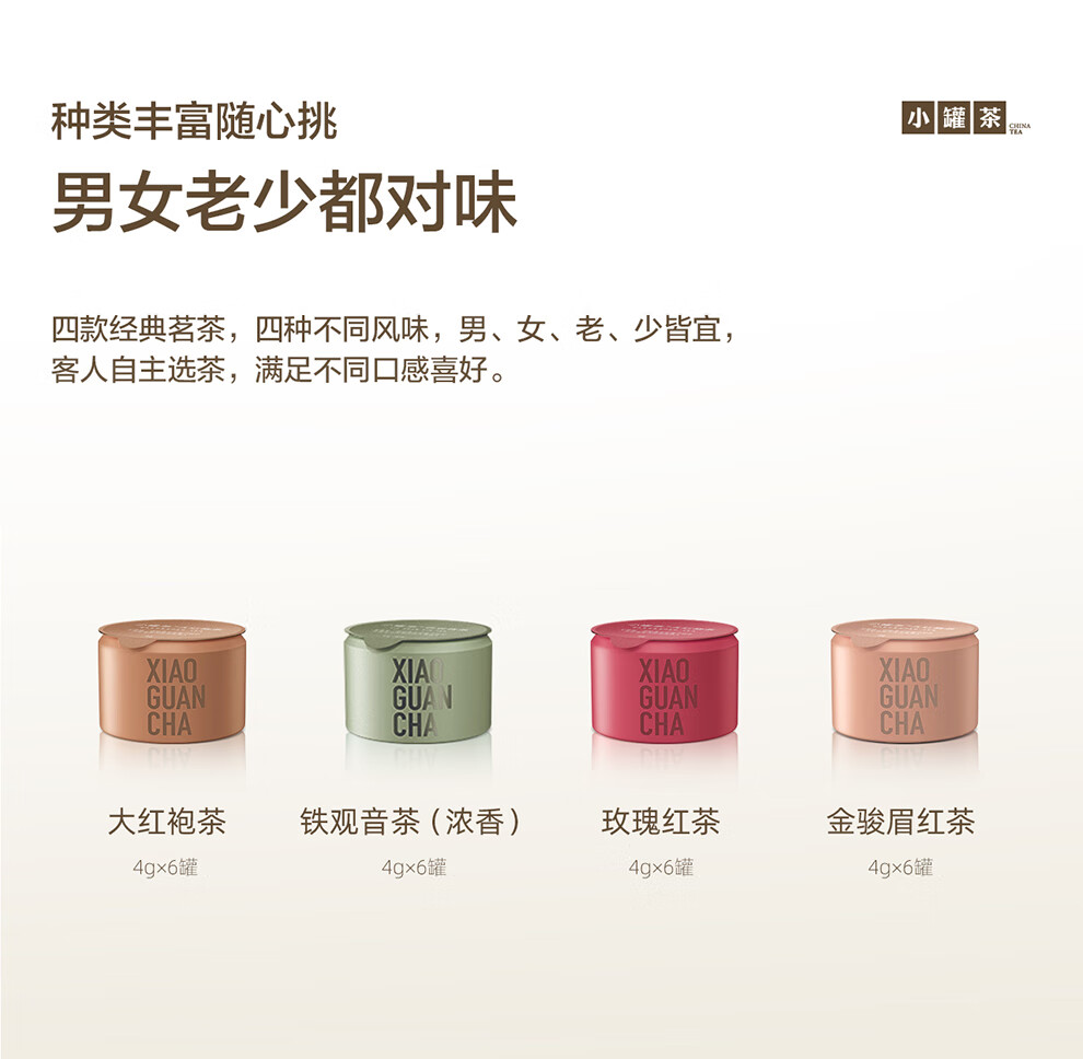 四款经典茗茶,四种不同风味,男、女、老、少皆宜;客人自主选茶,满足不同口感喜好;优选4款好茶,为你带来原产地醇正茶味