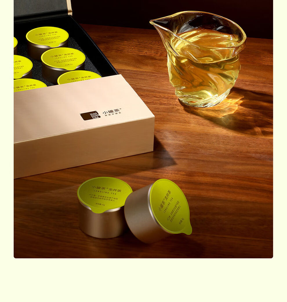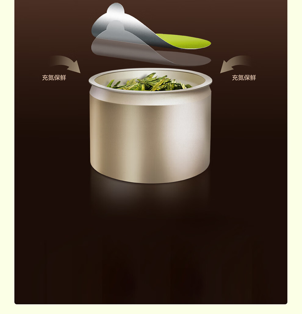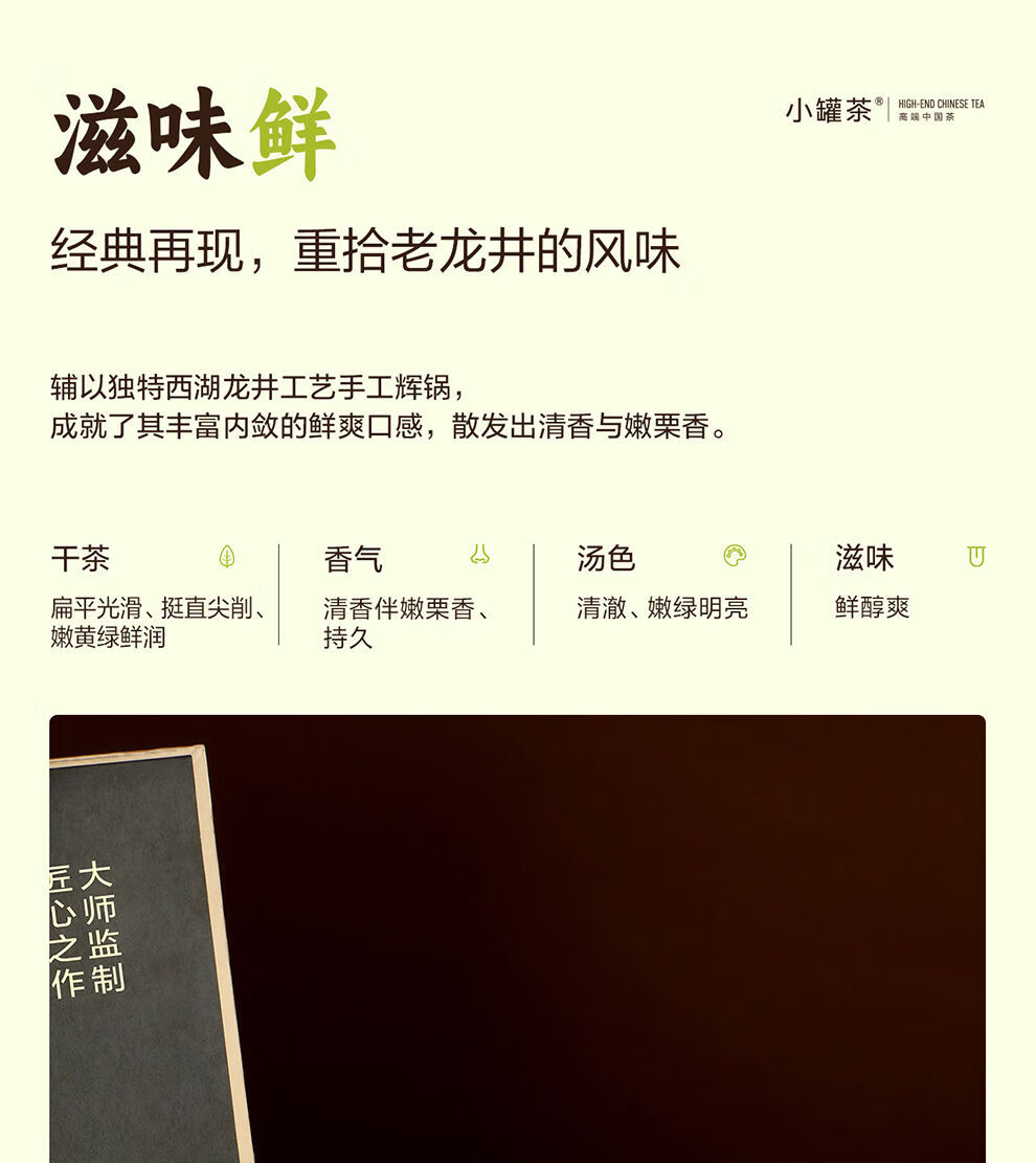 干茶扁平光滑、挺直尖削嫩黄绿鲜润;清香伴嫩栗香、持久;汤色清澈、嫩绿明亮