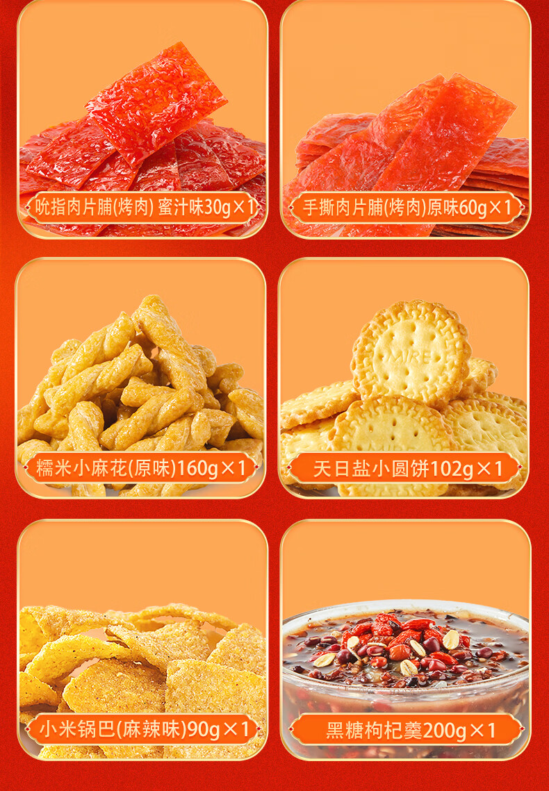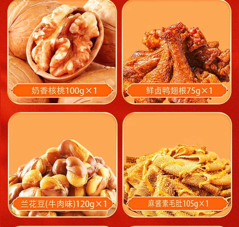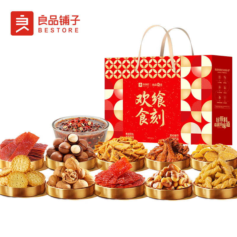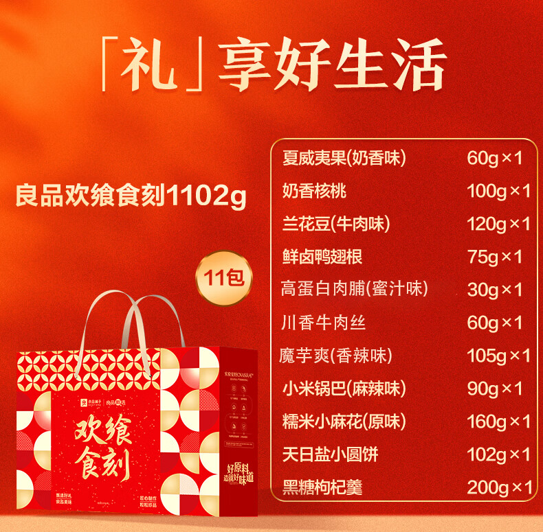配置:【良品铺子】夏威夷果(奶香味)60g 【良品铺子】奶香核桃100g 【良品铺子】兰花豆(牛肉味)120g 【良品铺子】鲜卤鸭翅根75g 【良品铺子】高蛋白肉脯(蜜汁味)30g 【良品铺子】川香牛肉丝60g 【良品铺子】魔芋爽(香辣味)105g 【良品铺子】小米锅巴(麻辣味) 【良品铺子】糯米小麻花(原味)160G 【良品铺子】天日盐小圆饼102g 【良品铺子】黑糖枸杞羹200g