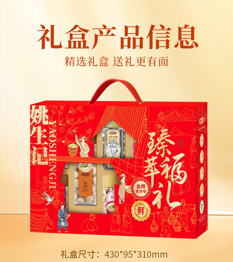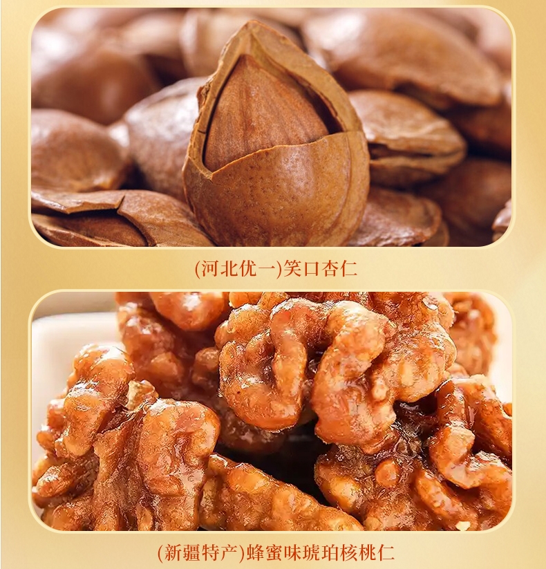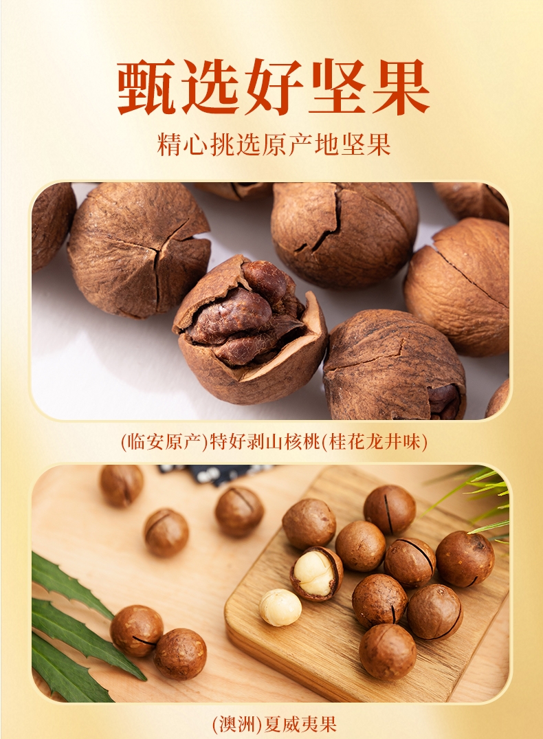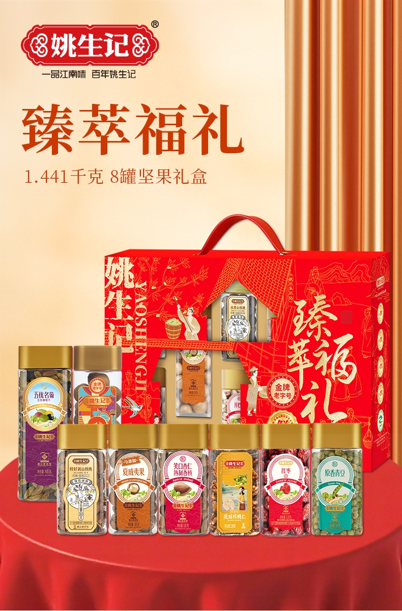 历经时光洗礼,方为传世经典;礼盒身披中国红,菱格纹;多款坚果