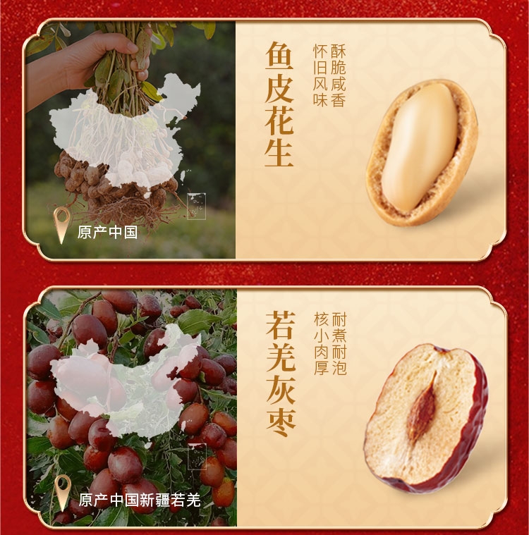 配置清单:越南紫衣腰果88g 开口杏核108g 泰国龙眼干188g 鱼皮花生188g 若羌灰枣288g 夹层山楂288g 老北京酥糖150g