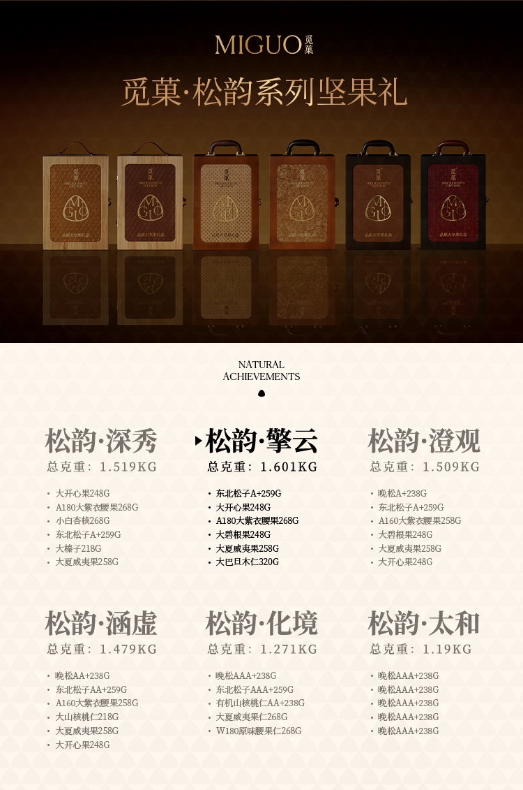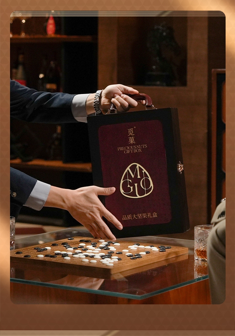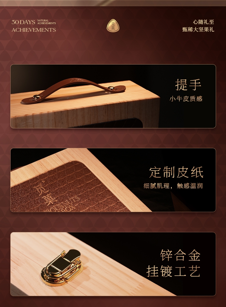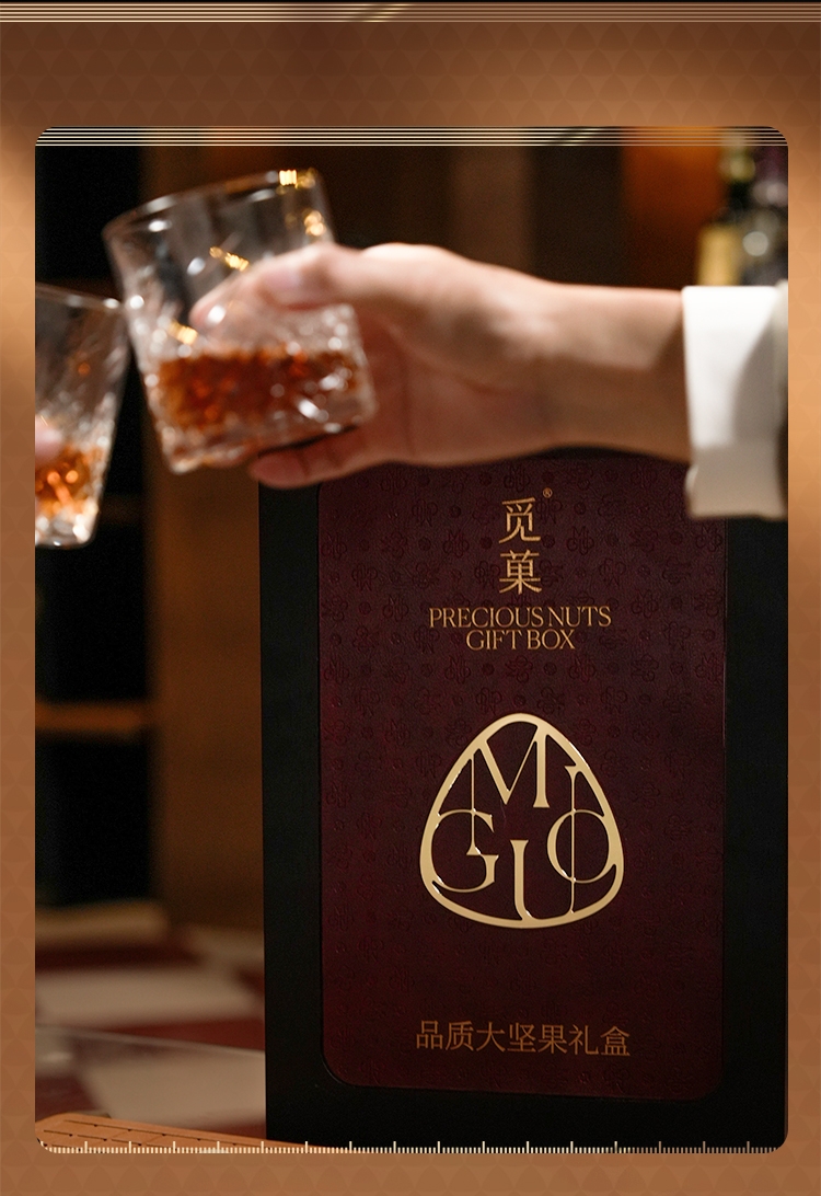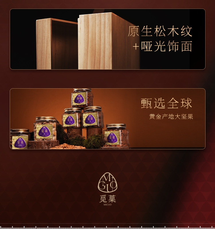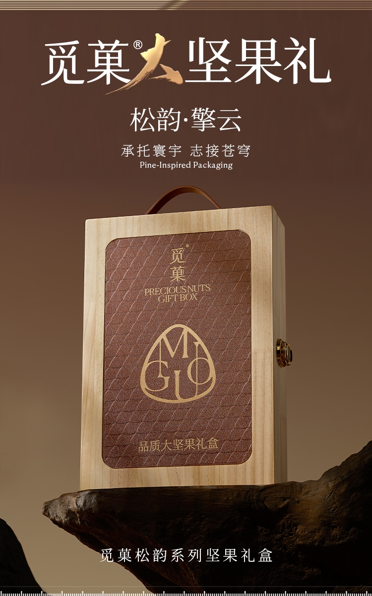 礼盒选用松木打造, 面纸上压印觅菓经典三角logo;每一颗都经过精心挑选,保证新鲜和品质;坚果独有的口感和香气,让您回味无穷