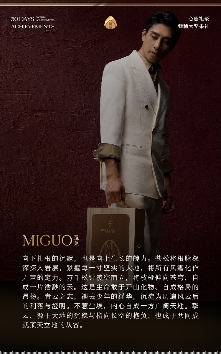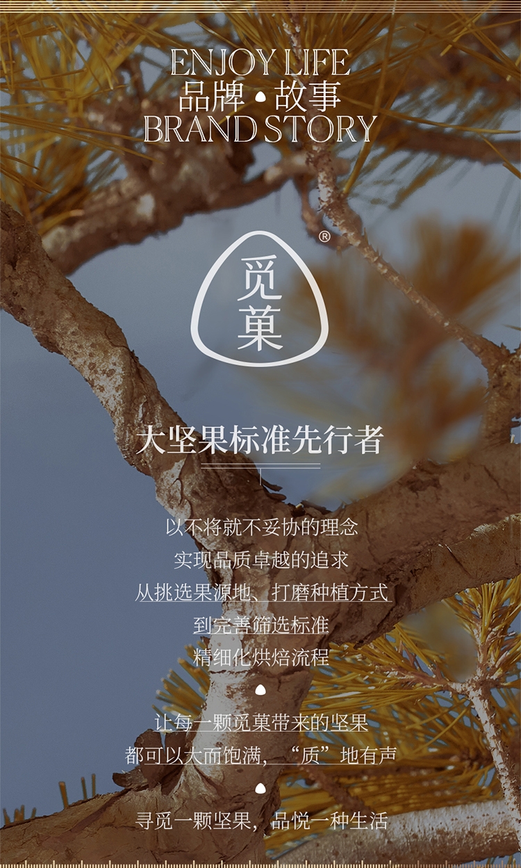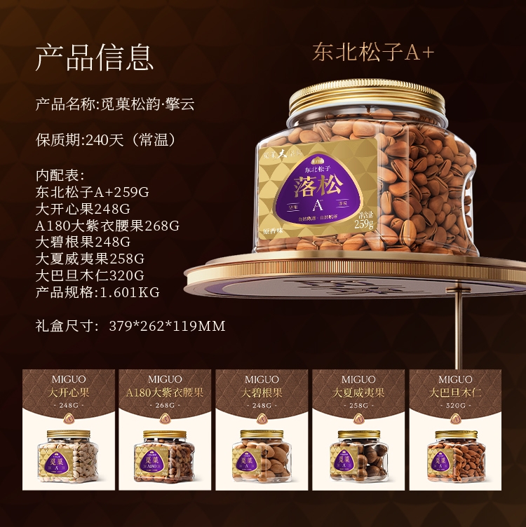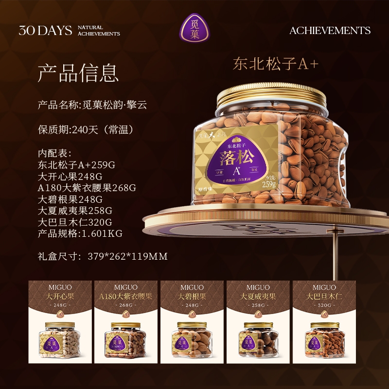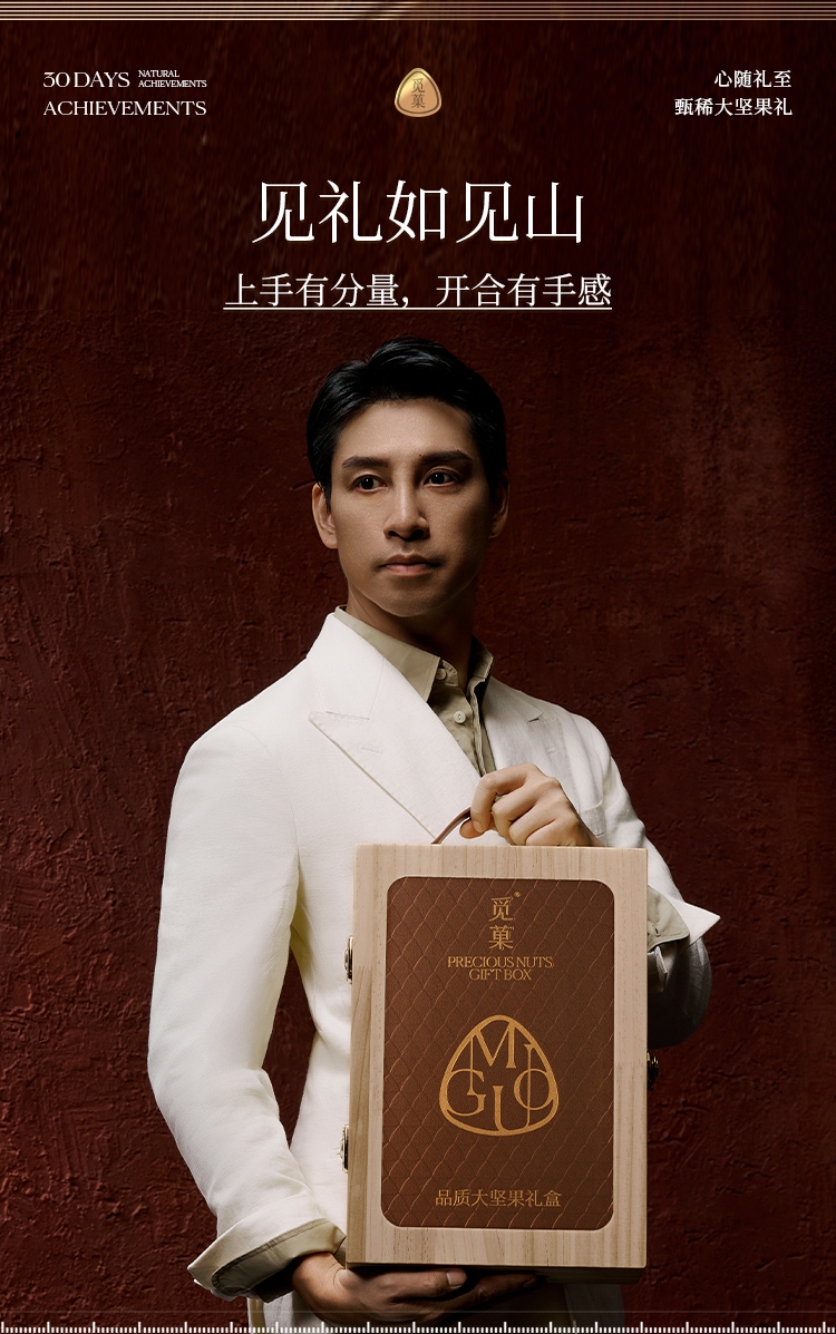 礼盒选用松木打造, 面纸上压印觅菓经典三角logo;每一颗都经过精心挑选,保证新鲜和品质;坚果独有的口感和香气,让您回味无穷