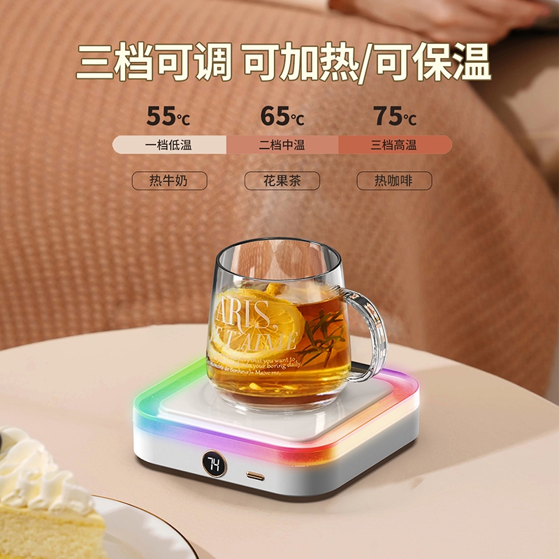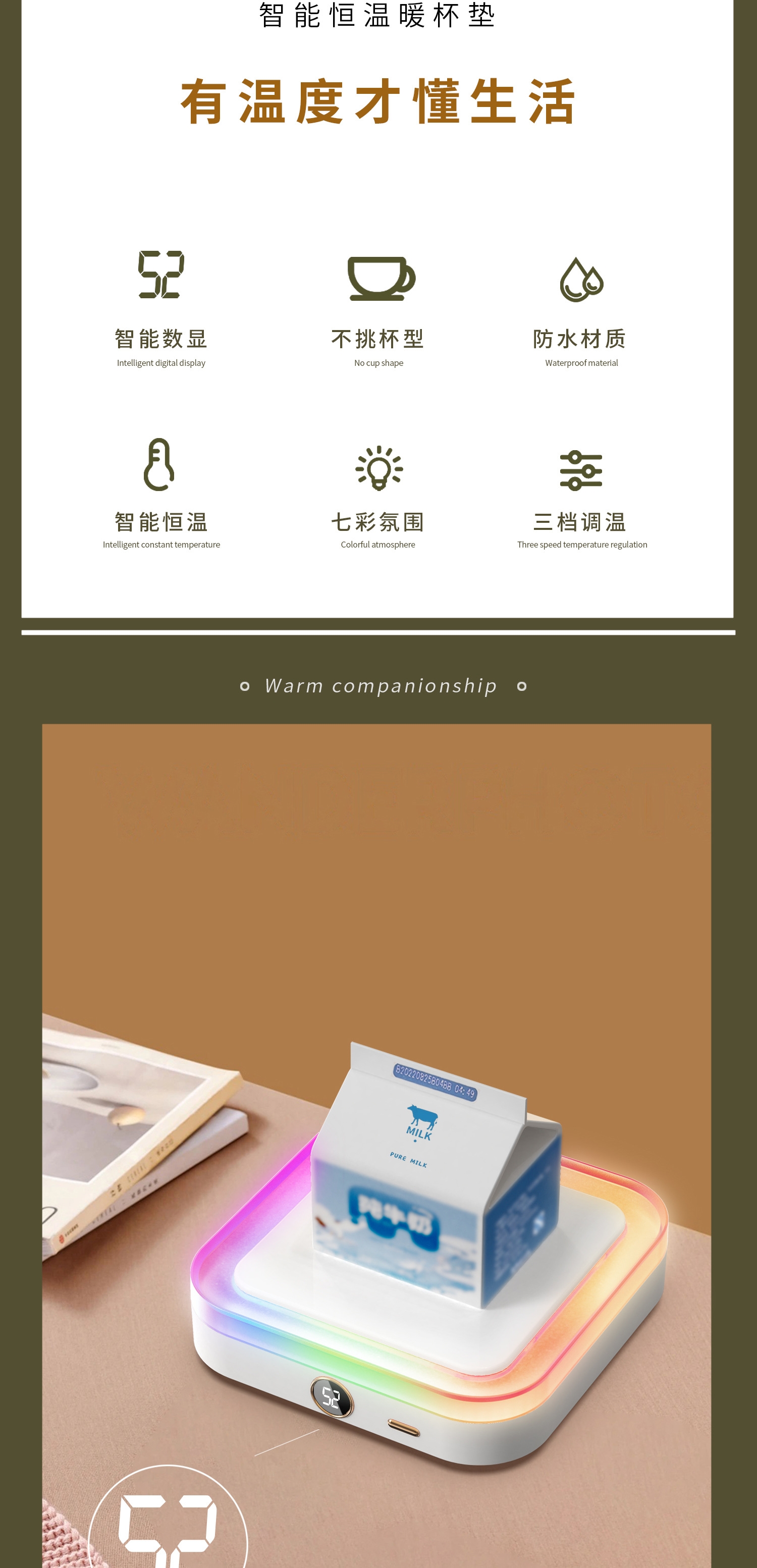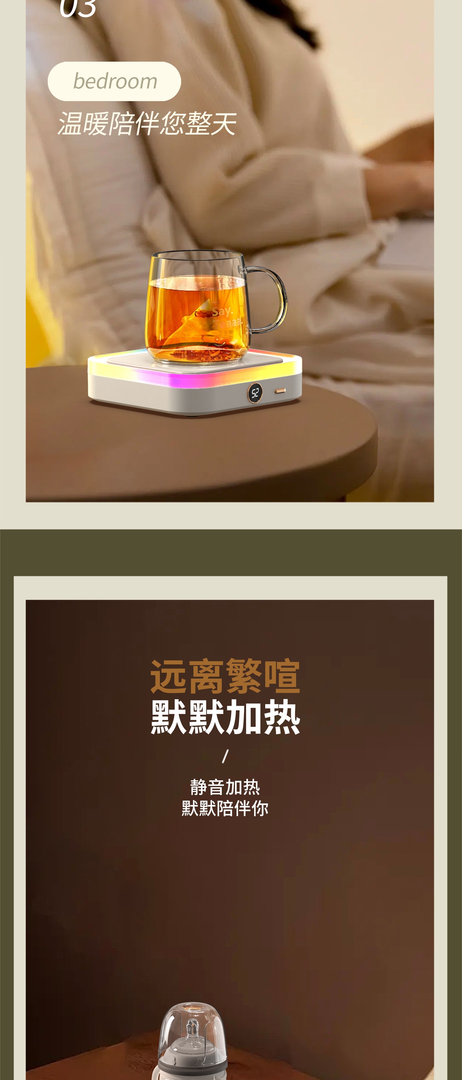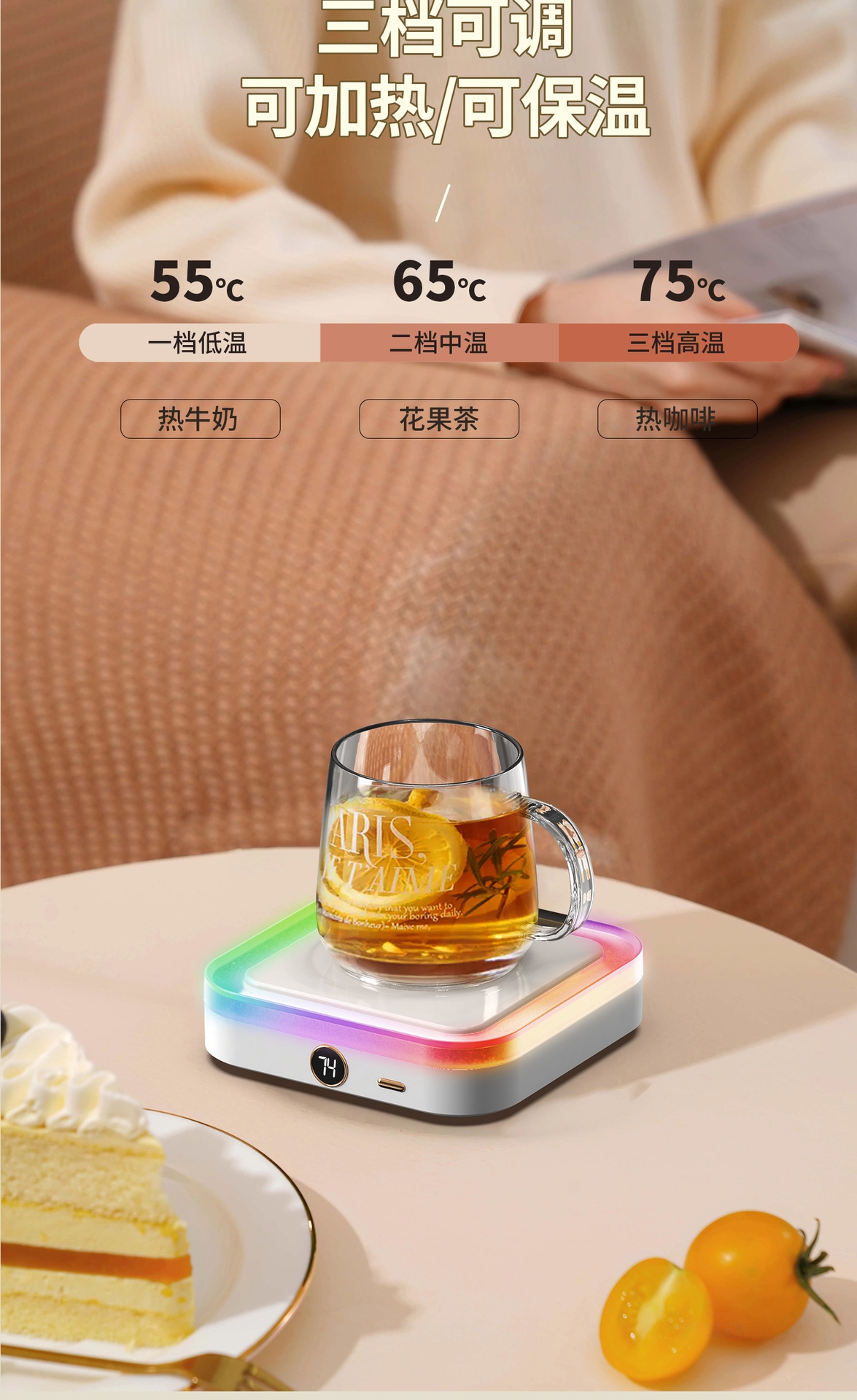 智能数显,一键操作;三档调节,可保温,可加热;静音加热,持久温热不烫
