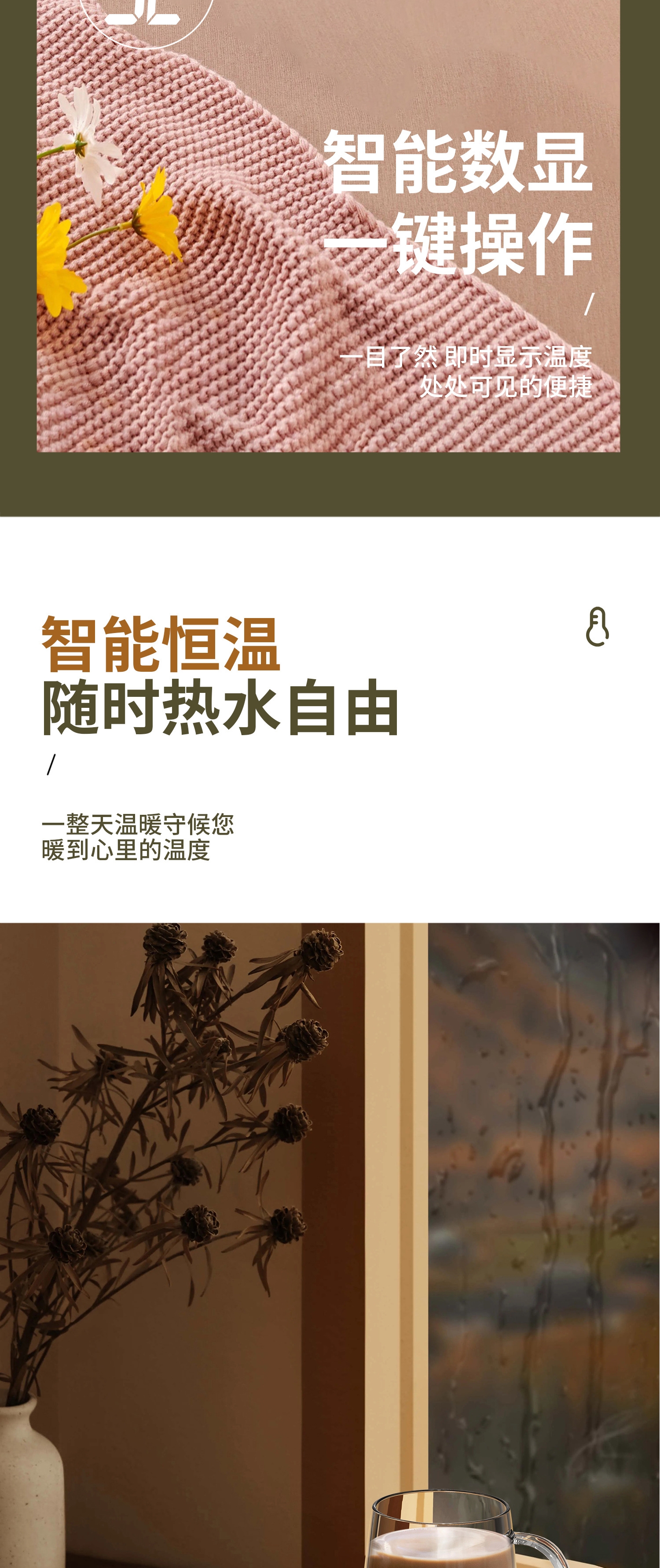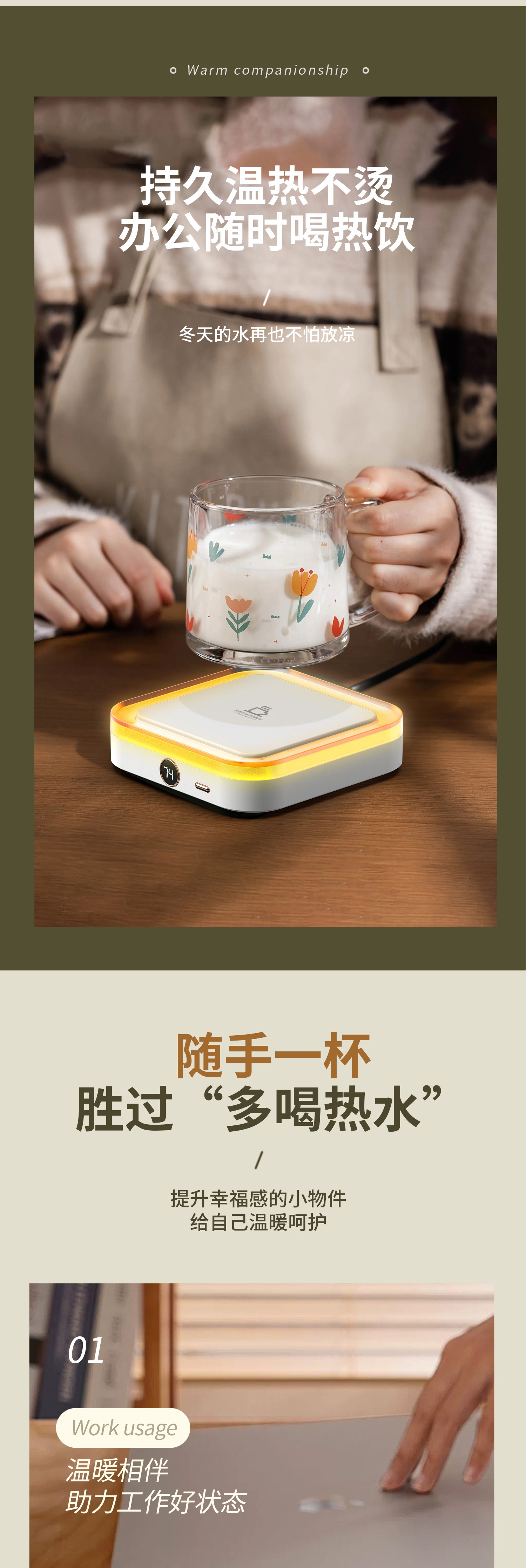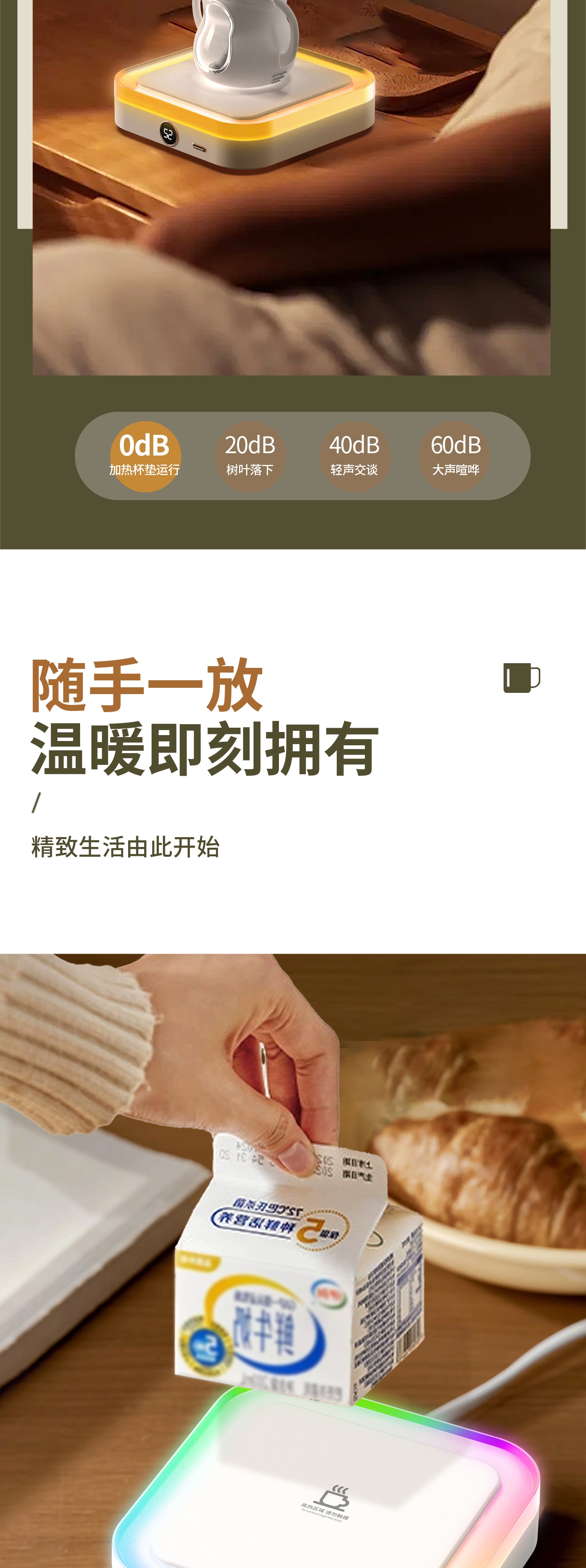 智能数显,一键操作;三档调节,可保温,可加热;静音加热,持久温热不烫