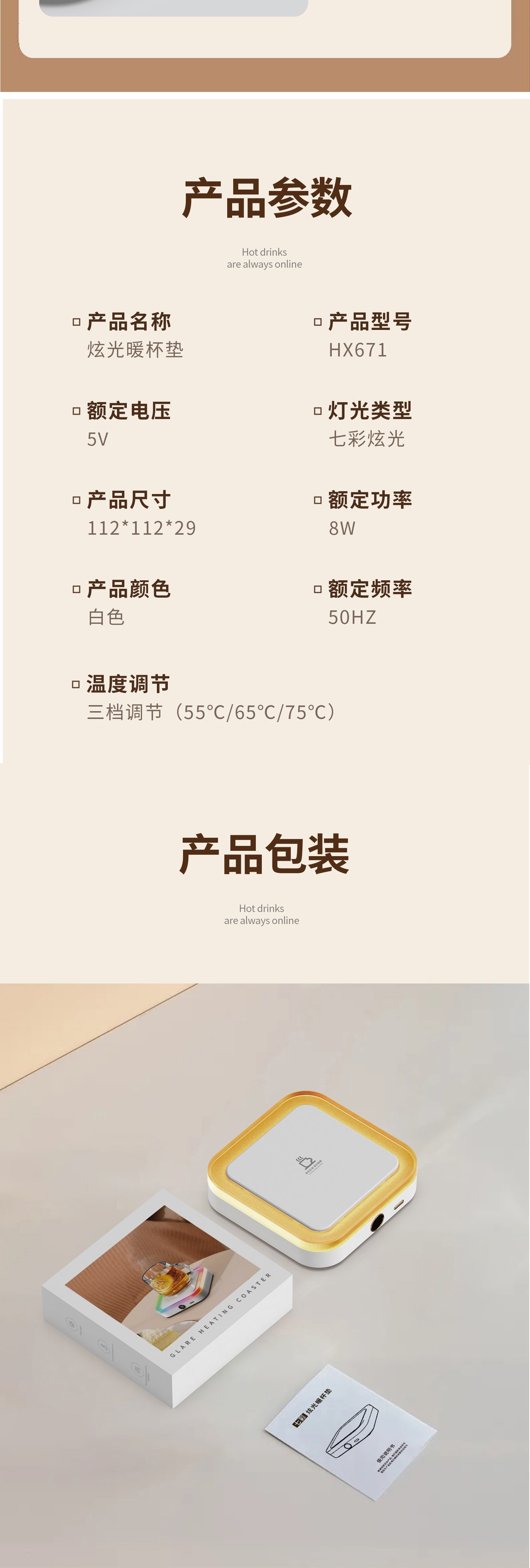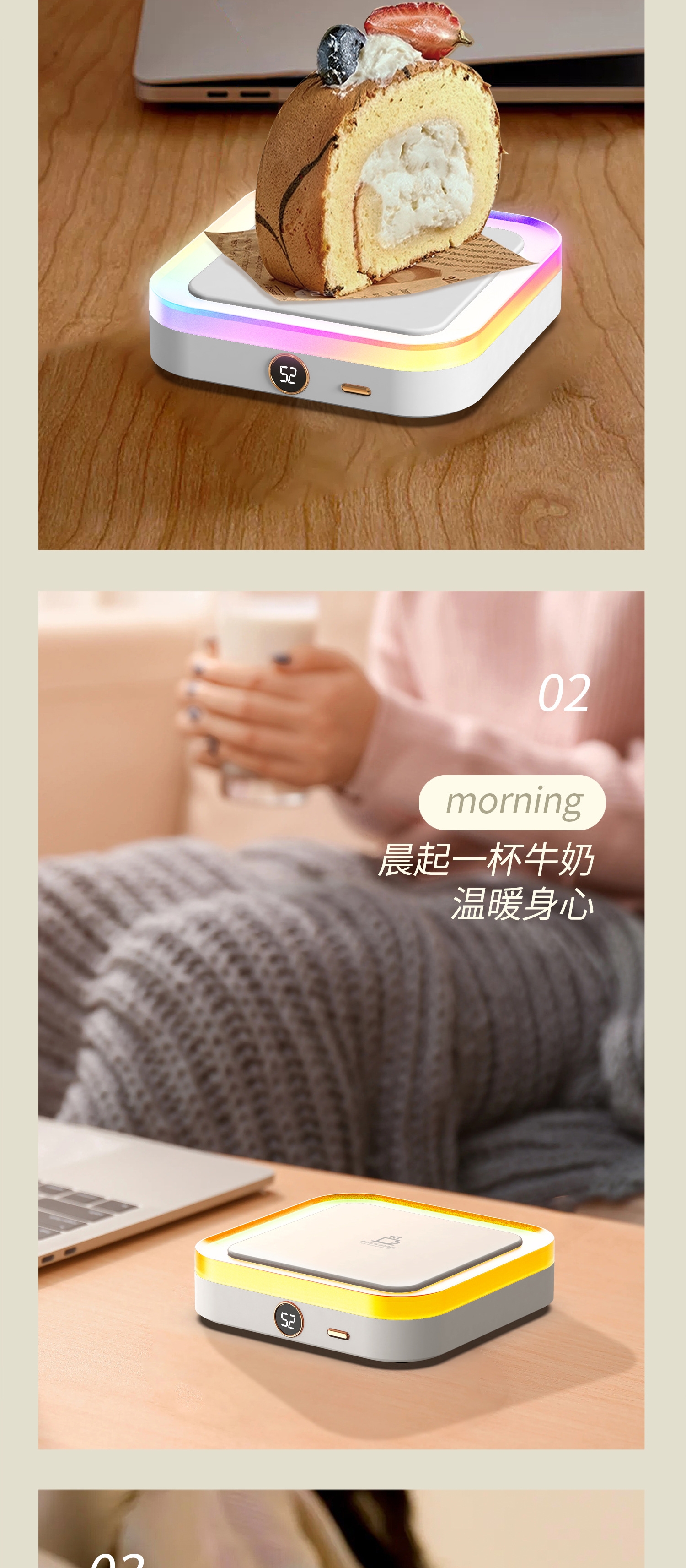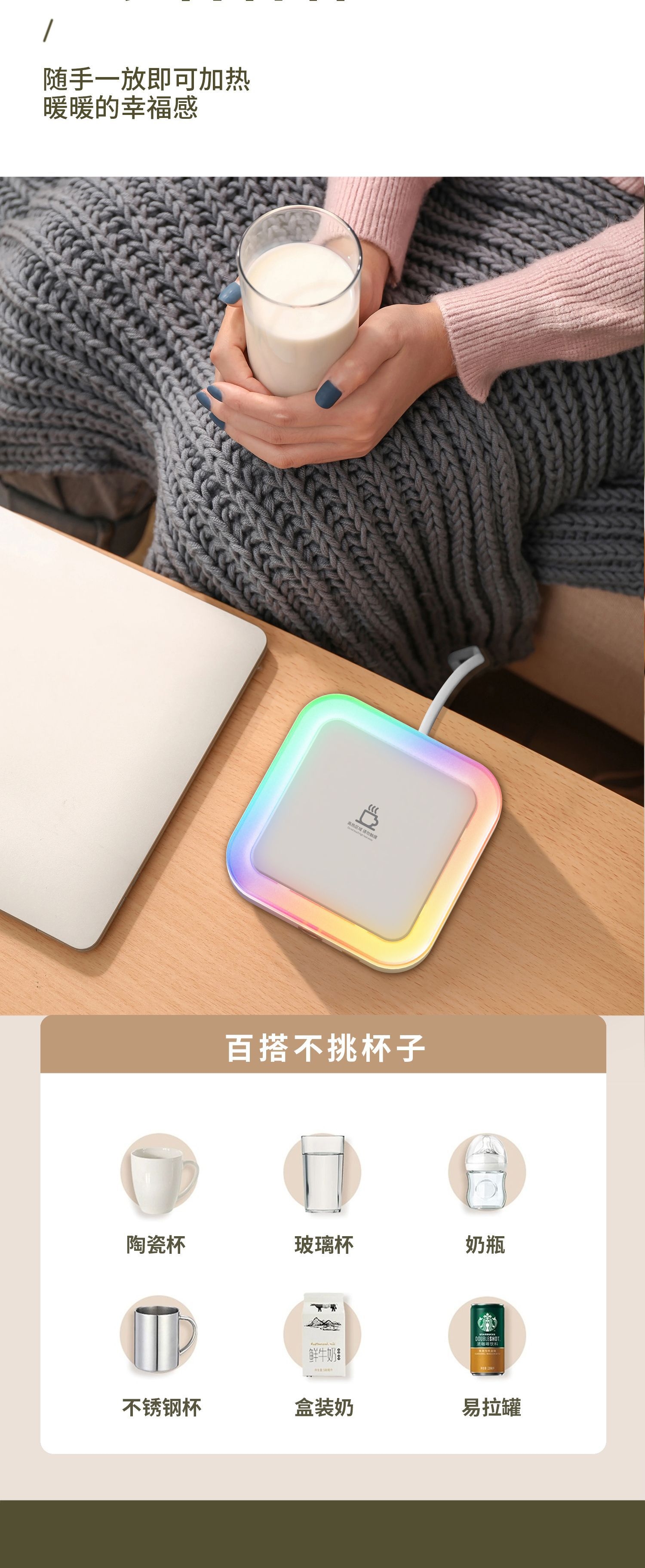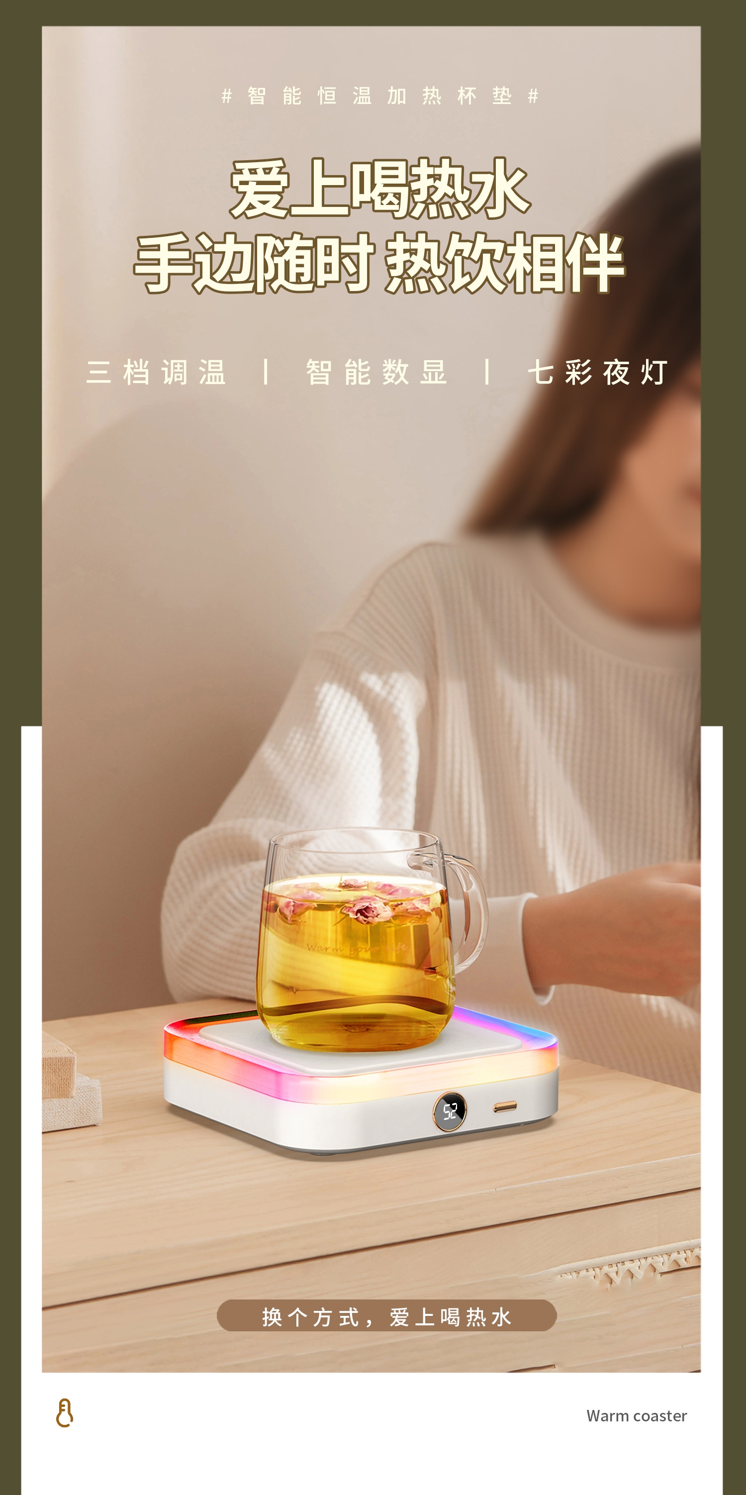 智能数显,一键操作;三档调节,可保温,可加热;静音加热,持久温热不烫