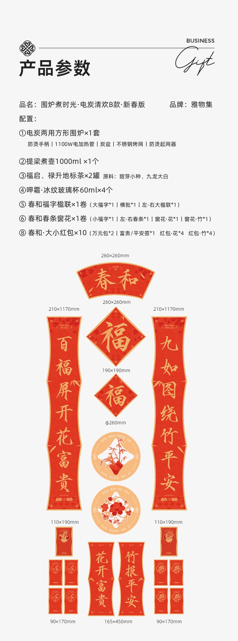 参数:电炭两用方形围炉×1 提梁煮壶×1 春和楹联套装×1 呷霜·冰纹玻璃杯×4 福启/禄升地标茶×2罐